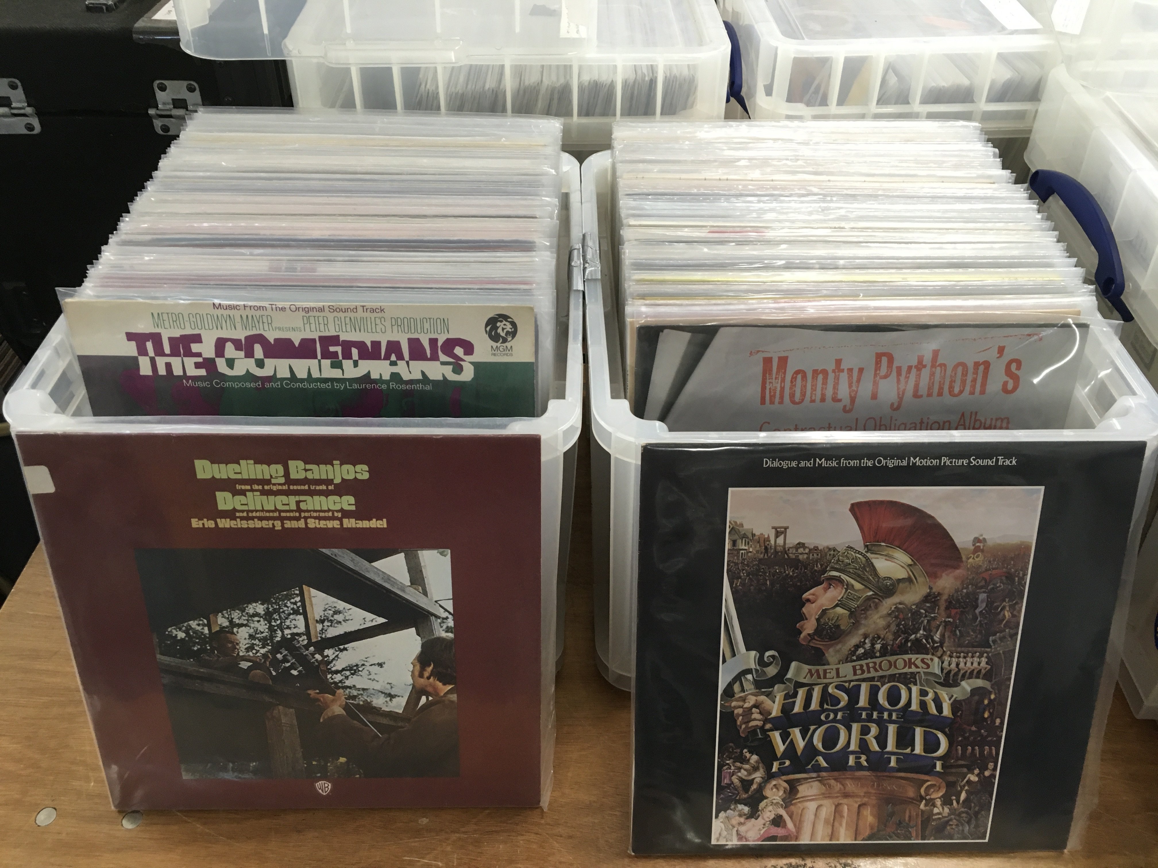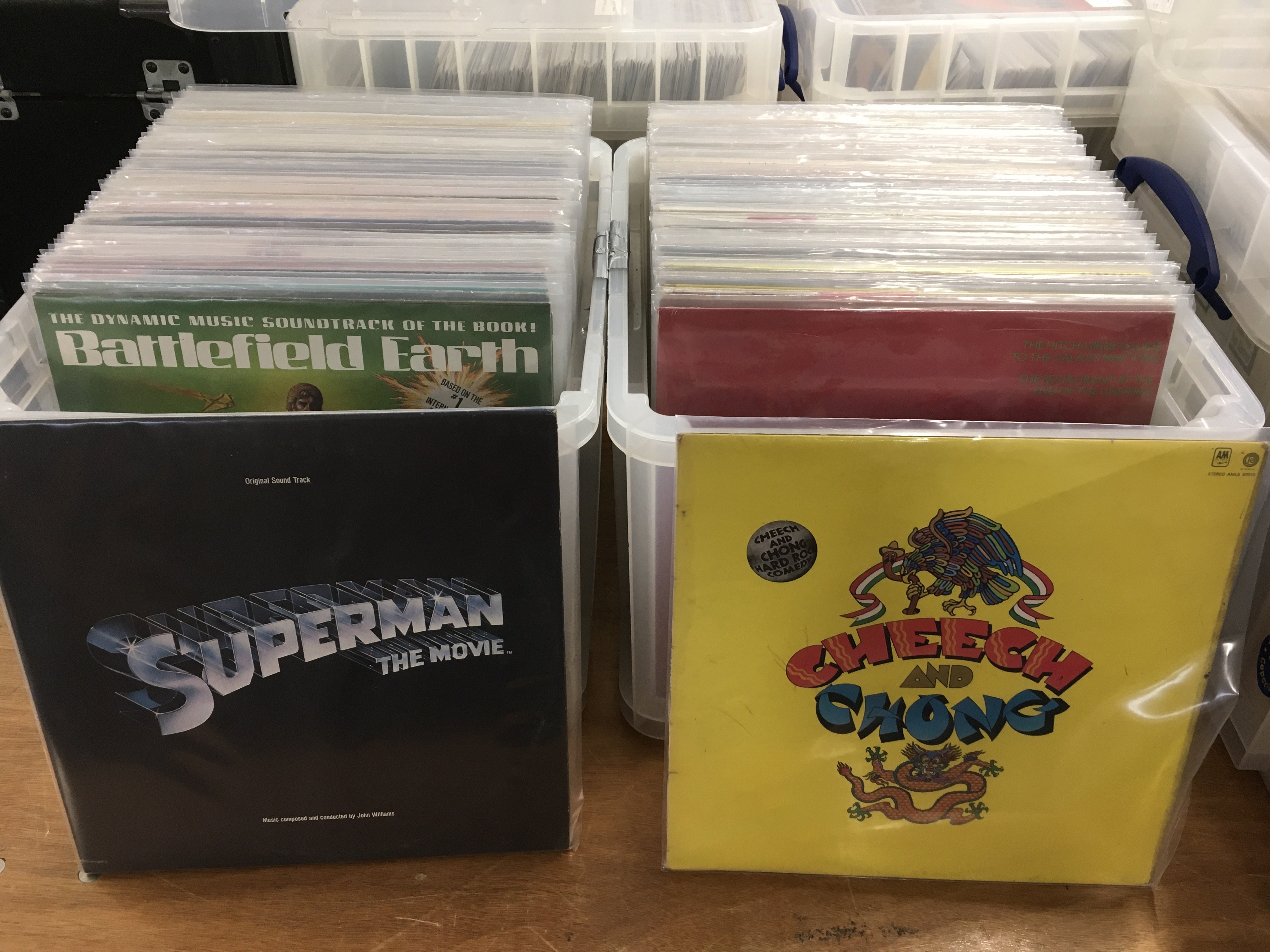 Two boxes of Comedy, TV and film soundtrack LPs including Cheech & Chong, Monty Python, The Black Hole and many more.