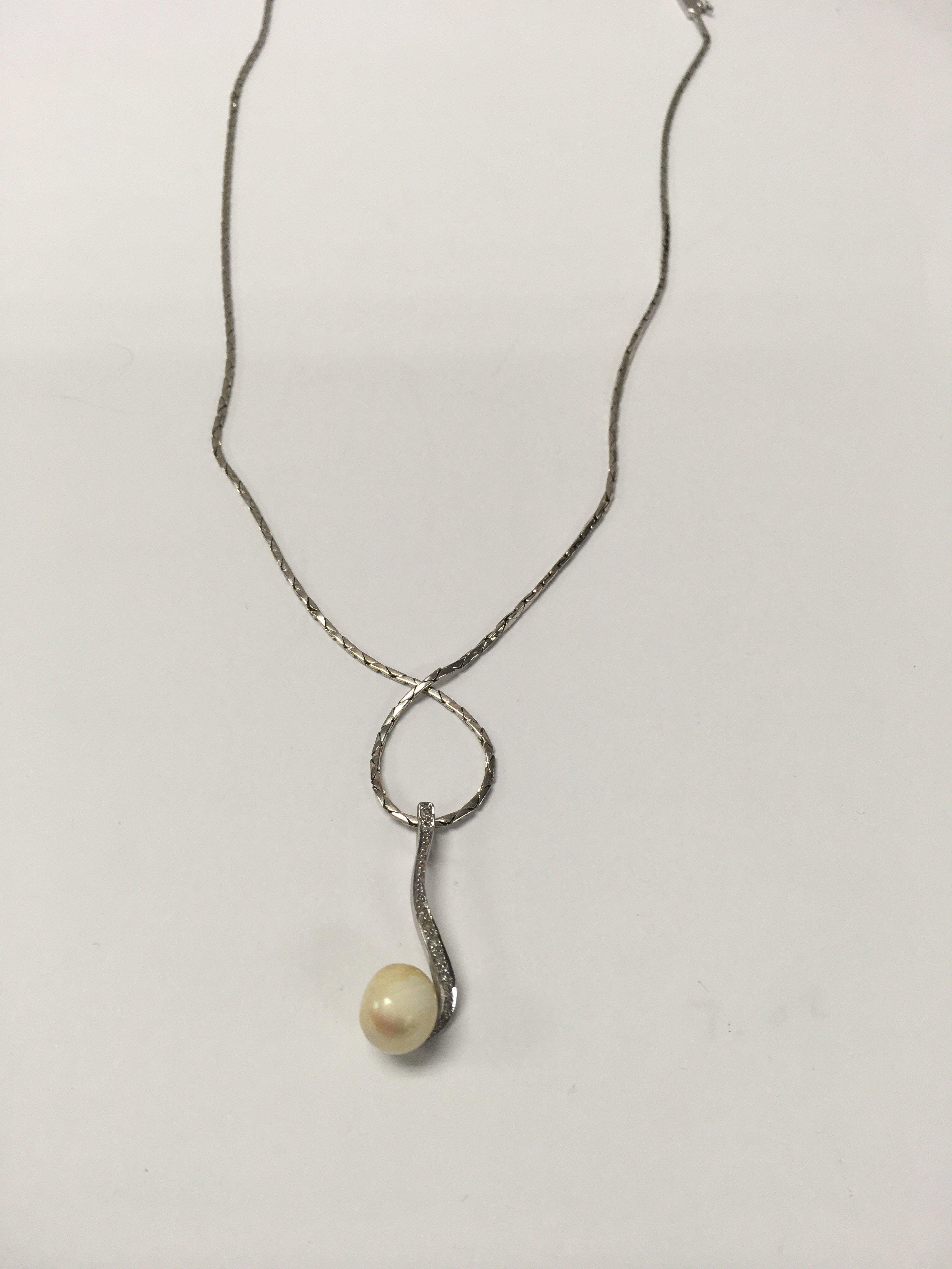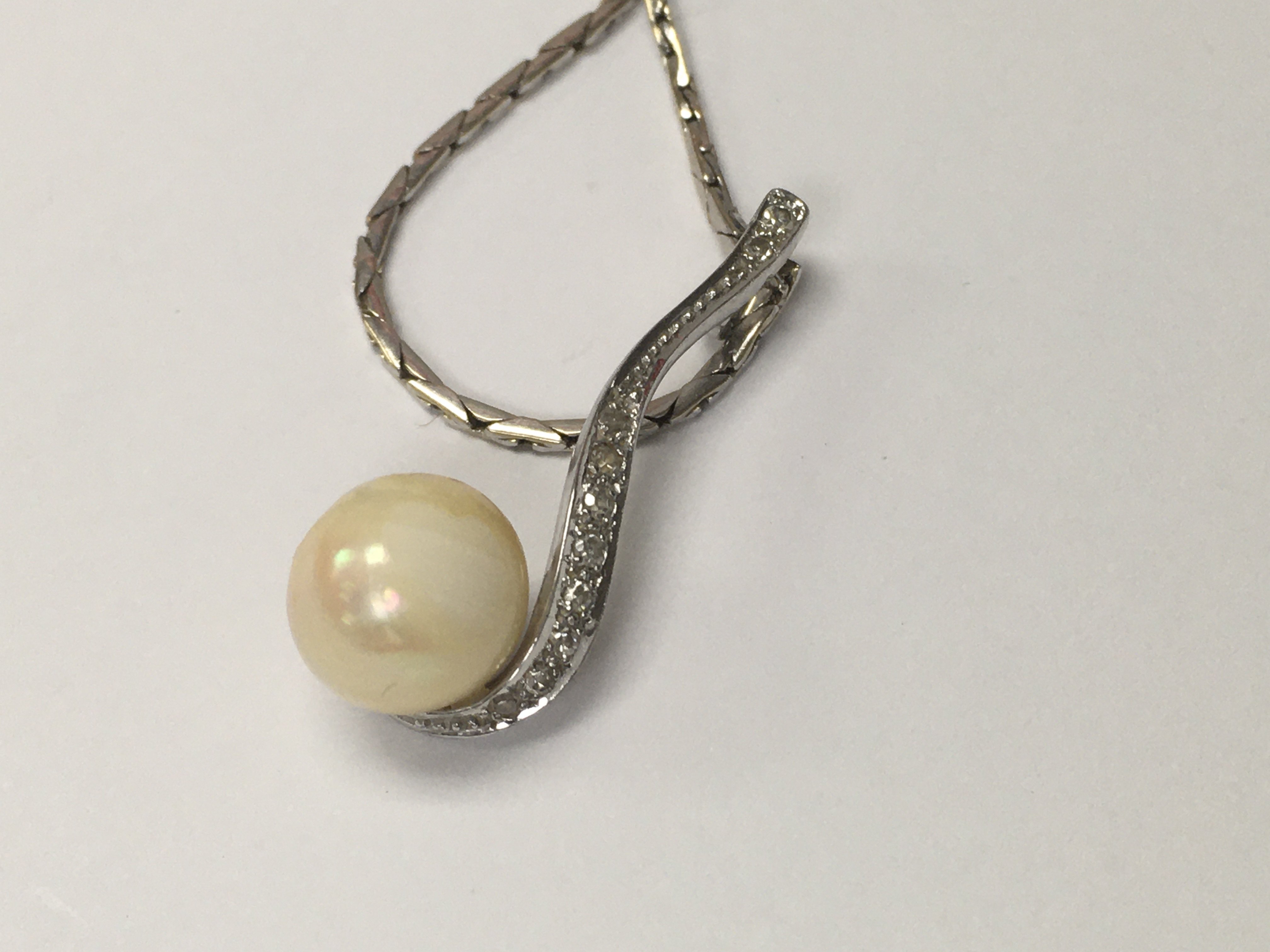 A 18 ct white gold necklace with attached diamond and pearl pendant. Total weight