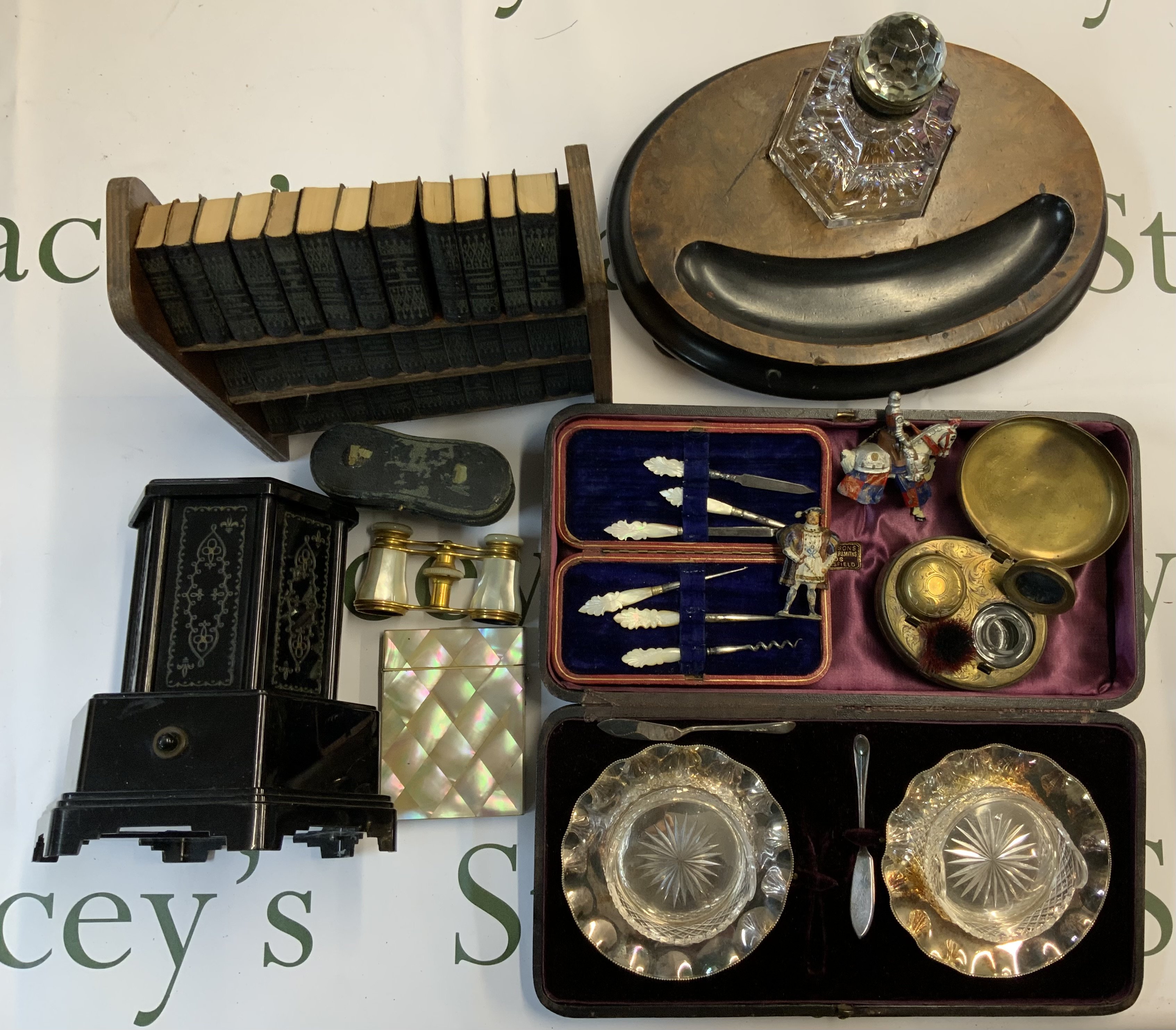 A pair of antique opera glasses, Manicure set, Cigar Box, inkwell, cased butter dishes etc. (D)