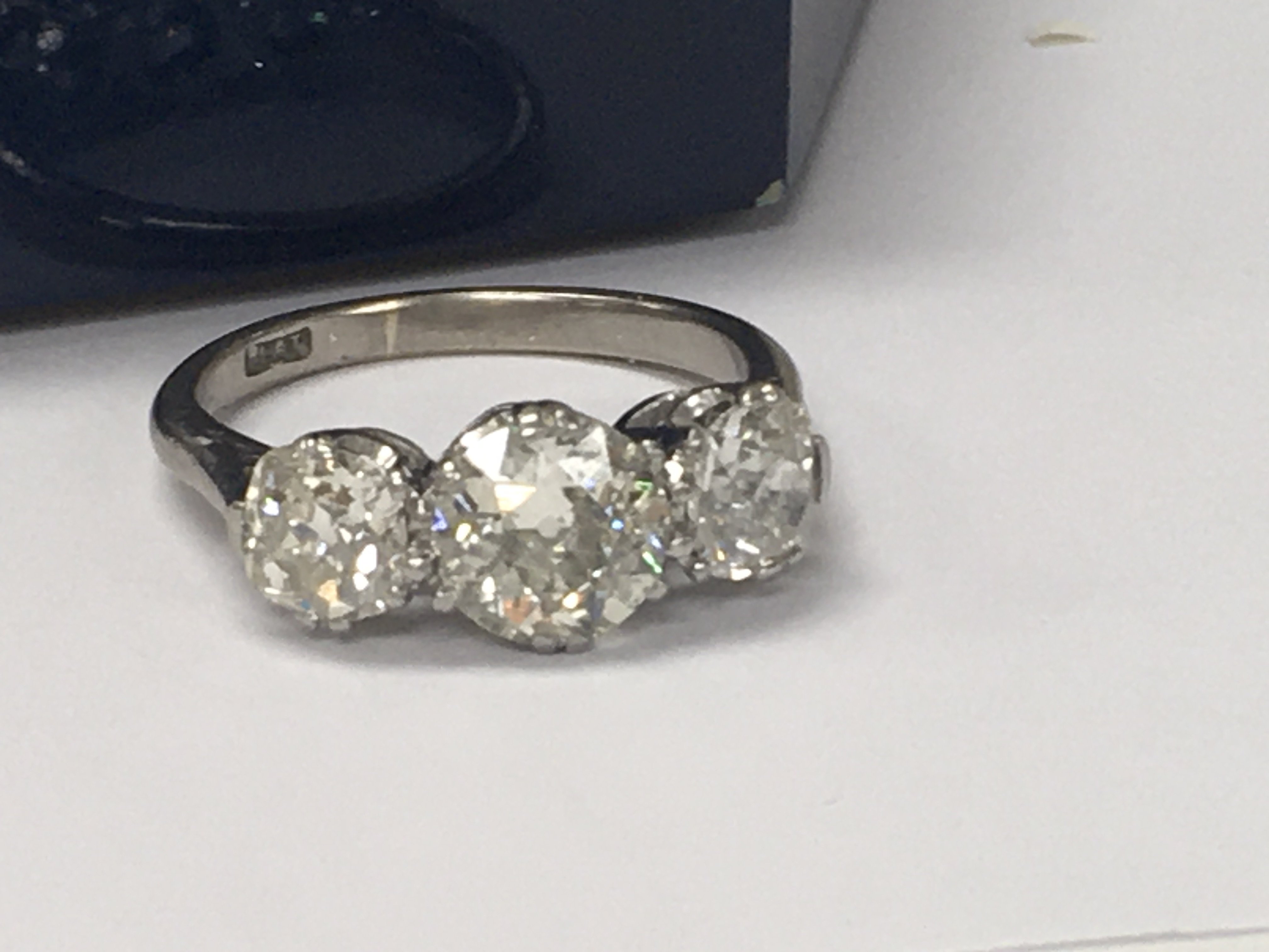 A platinum ring inset with three diamonds total weight 2ct Approx . Size L