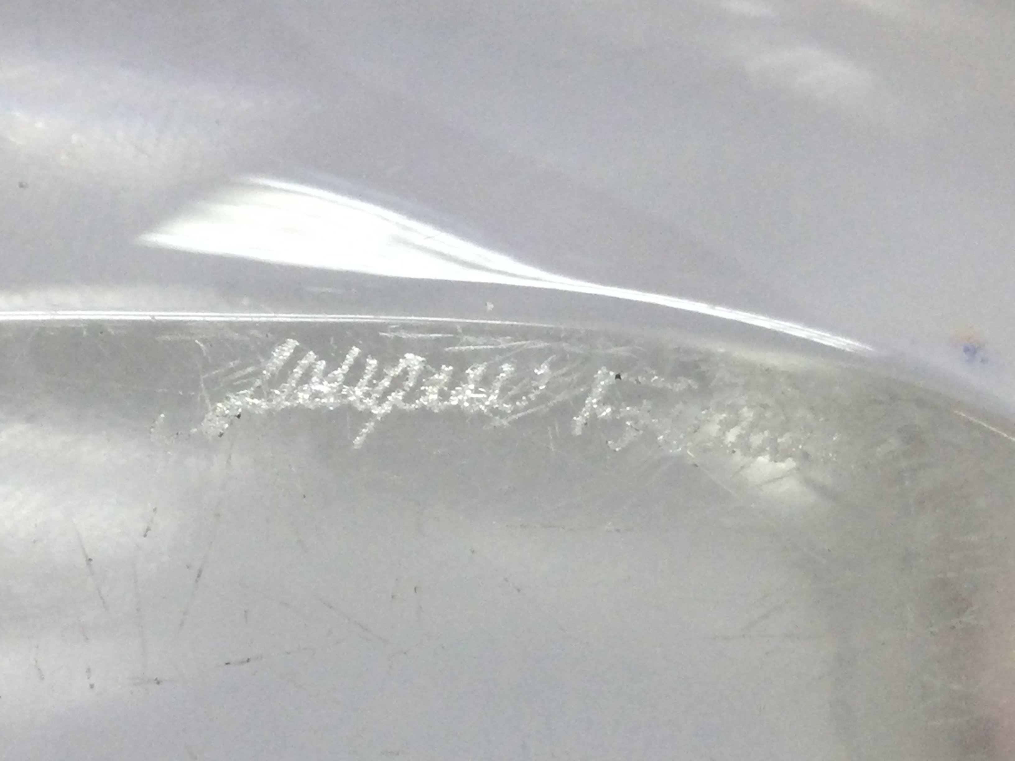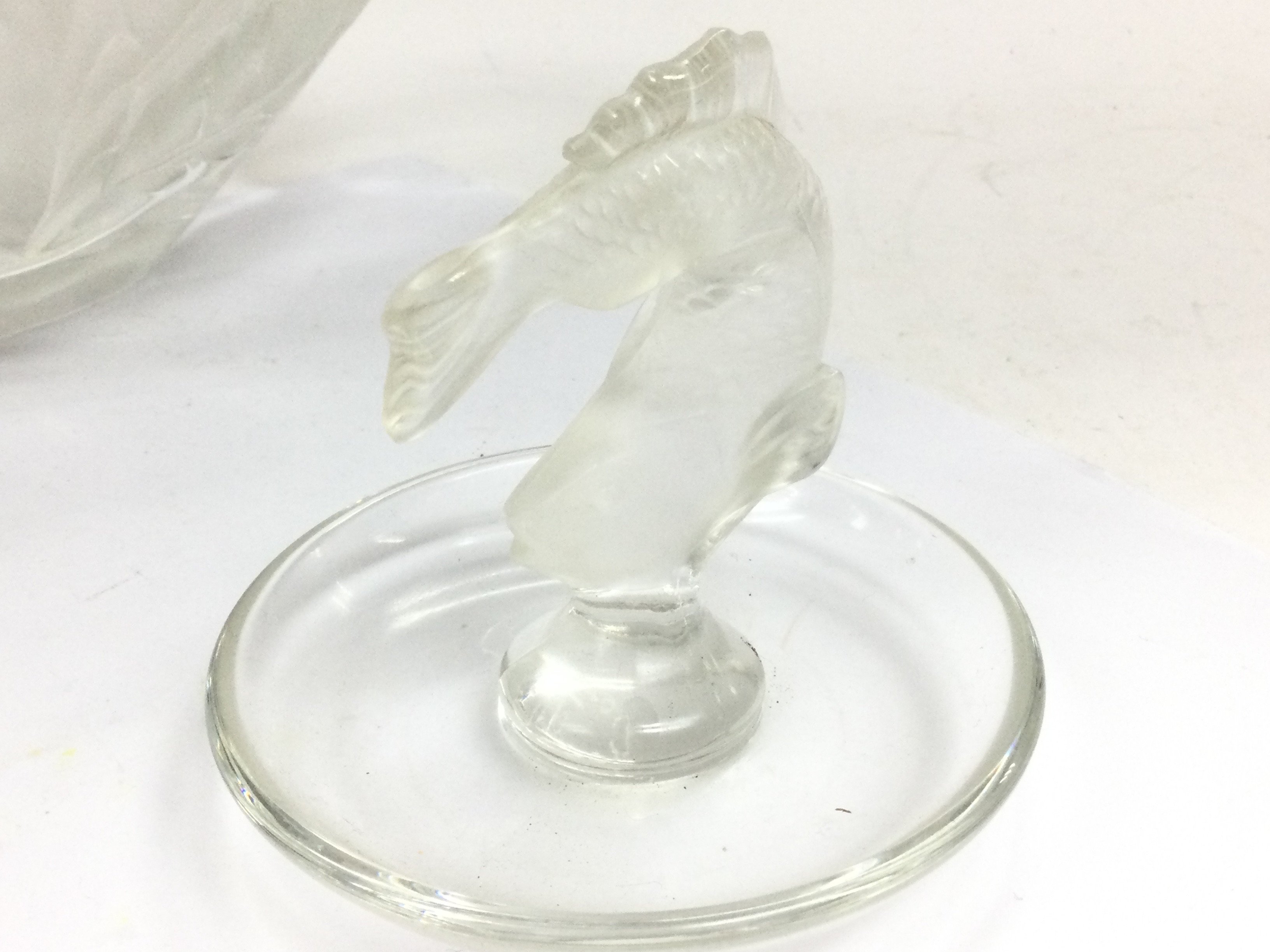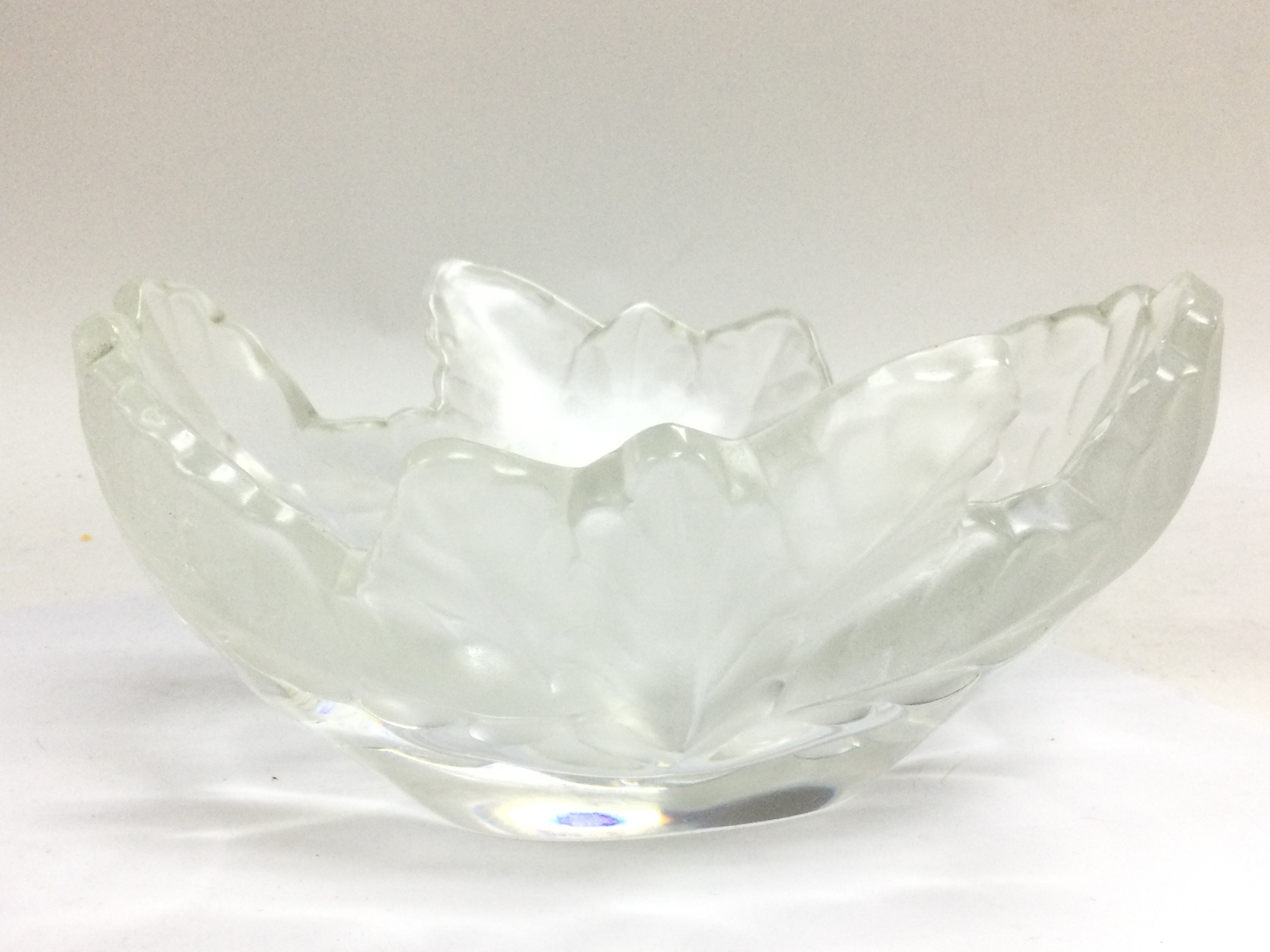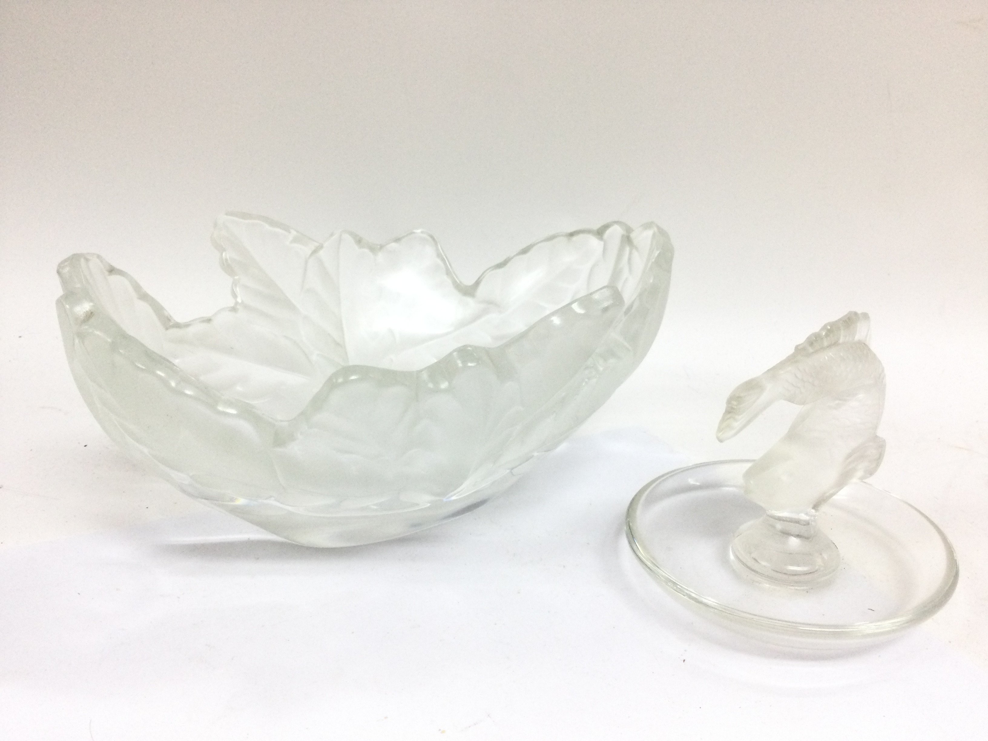 Lalique frosted glass ornaments including a leaf bowl and a fish pin dish , 10cm tall approx. This lot cannot be posted