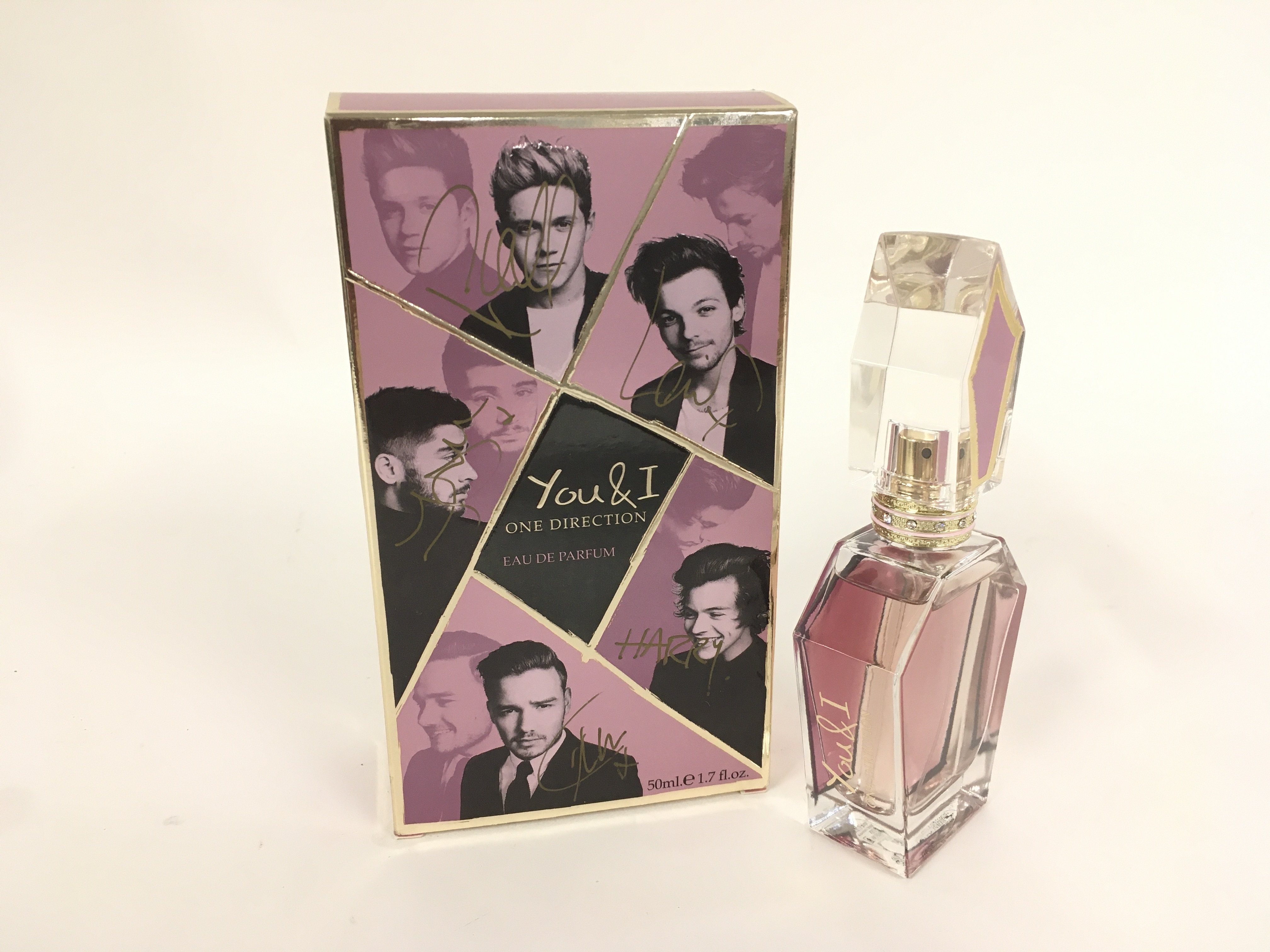 A fully signed One Direction 50ml 'You & I' perfume. In 2014 the vendor was gifted the item by Mike Edwards who was involved in the One Direction fragrance project.