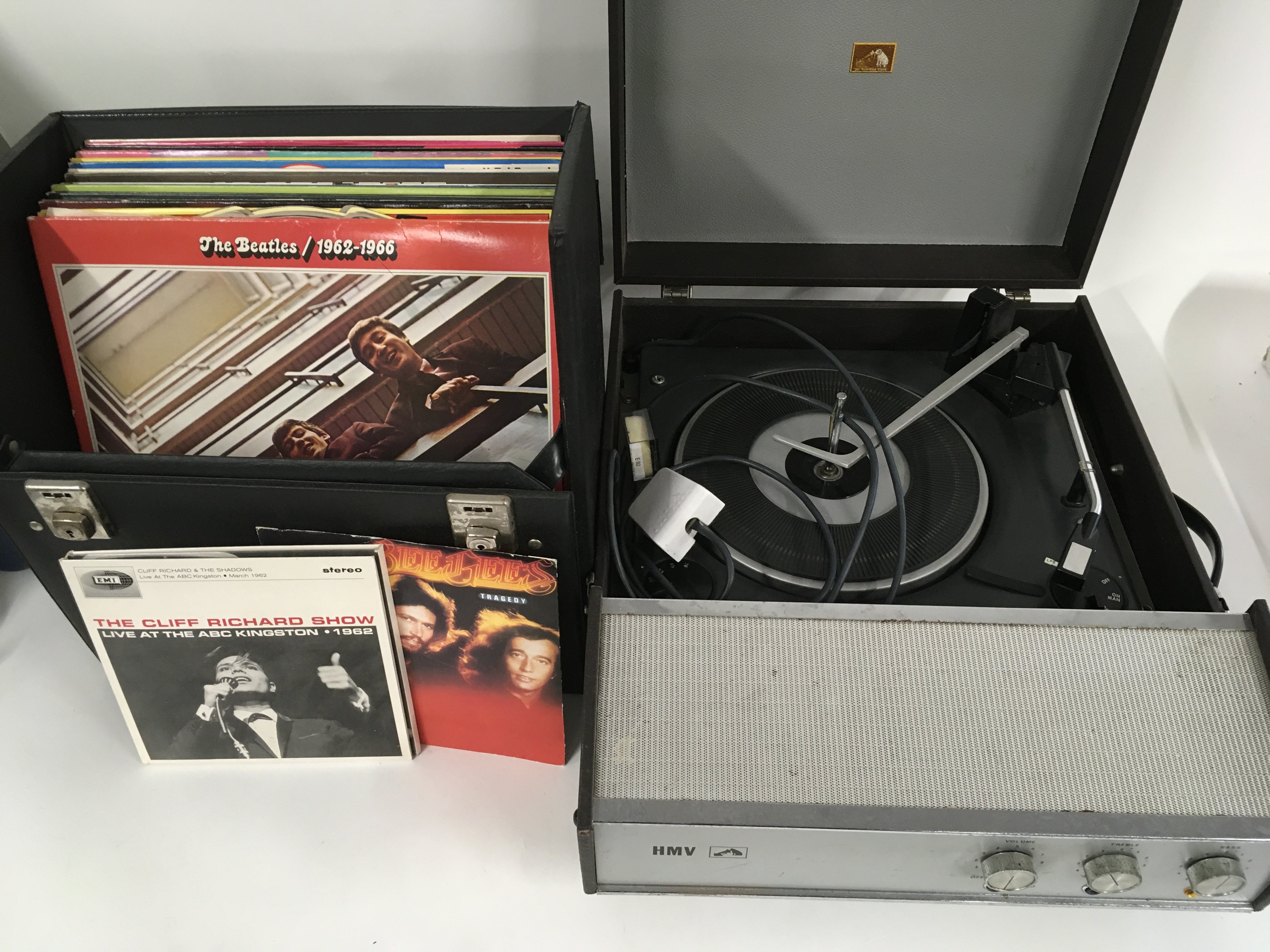 An HMV portable record player and a record case of LPs and 7" singles by various artists including The Beatles, Elvis Presley and rock n roll compilations.