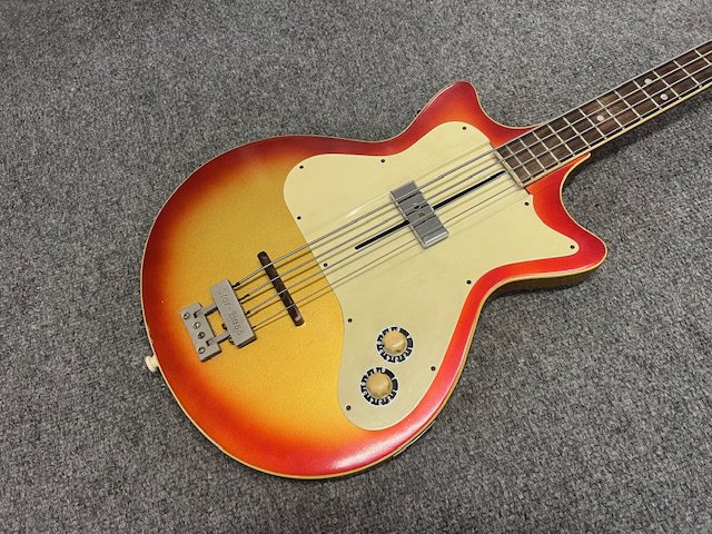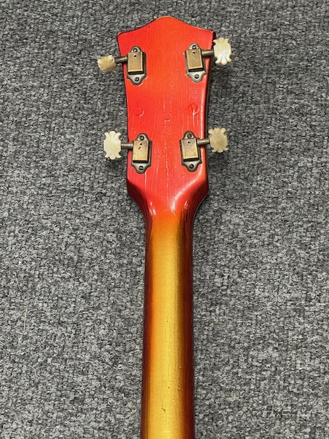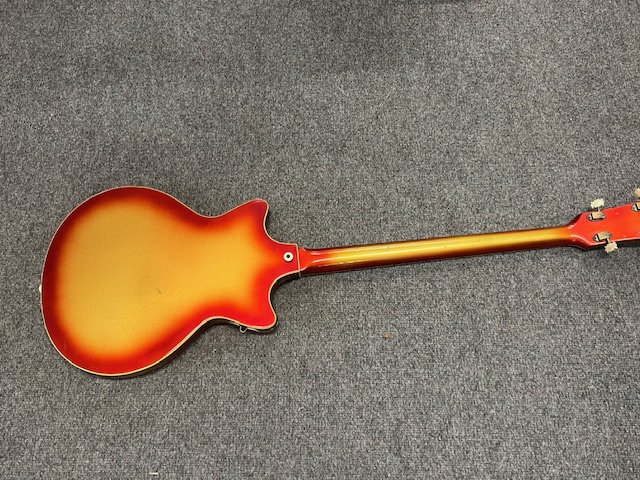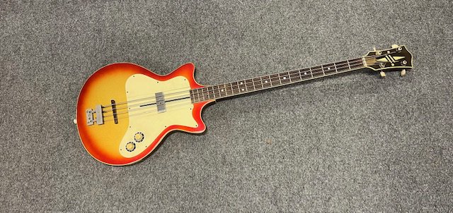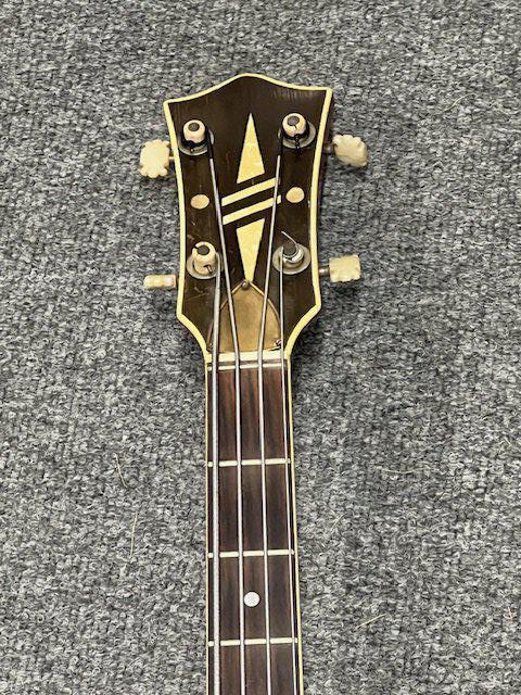 A 1959 Framus Hollywood Star Bass Ultra Short Scale Bass Guitar model number 5/148 and quite rare. Single sliding pickup metallic gold to red sunburst finish. All original with original Van Gent "star" tuners stamped Framus to housing. Some loss of paint to back and sides consistent with age and use. Comes with non original hard case as would have originally come with optional extra vinyl case.