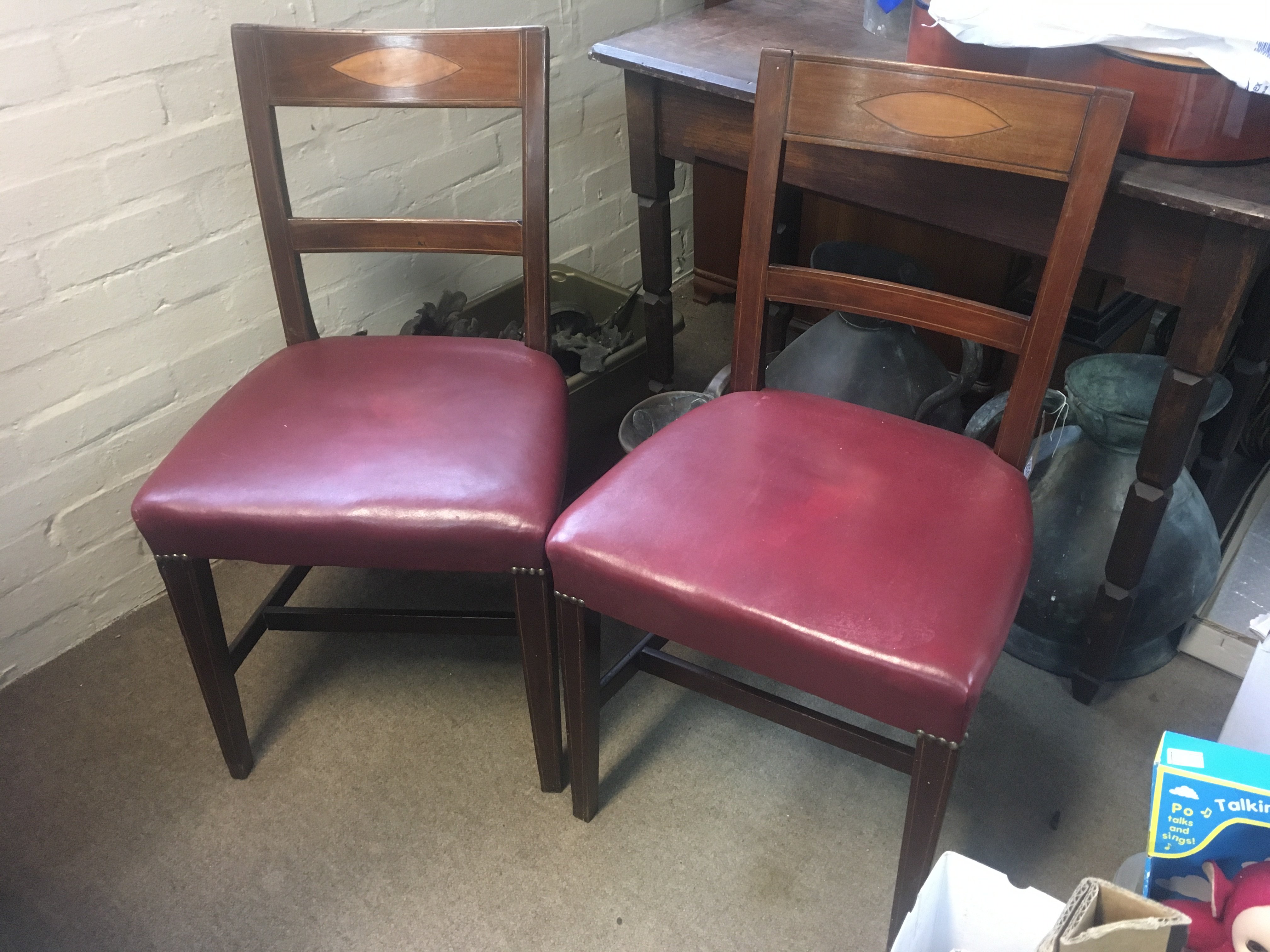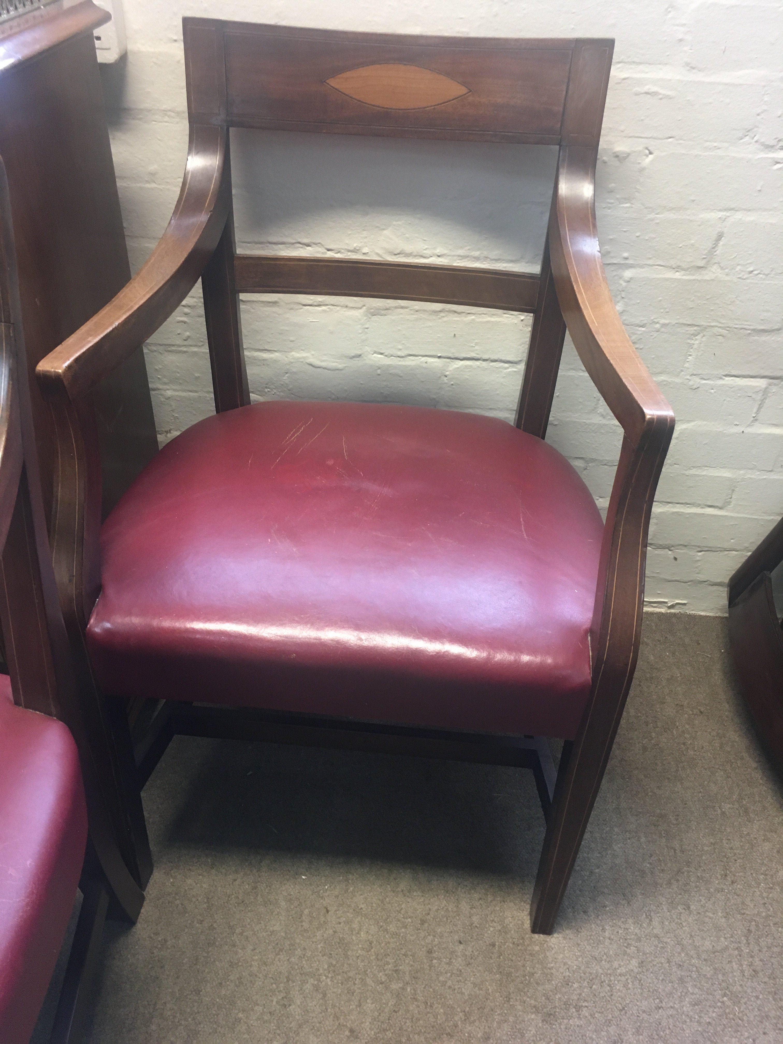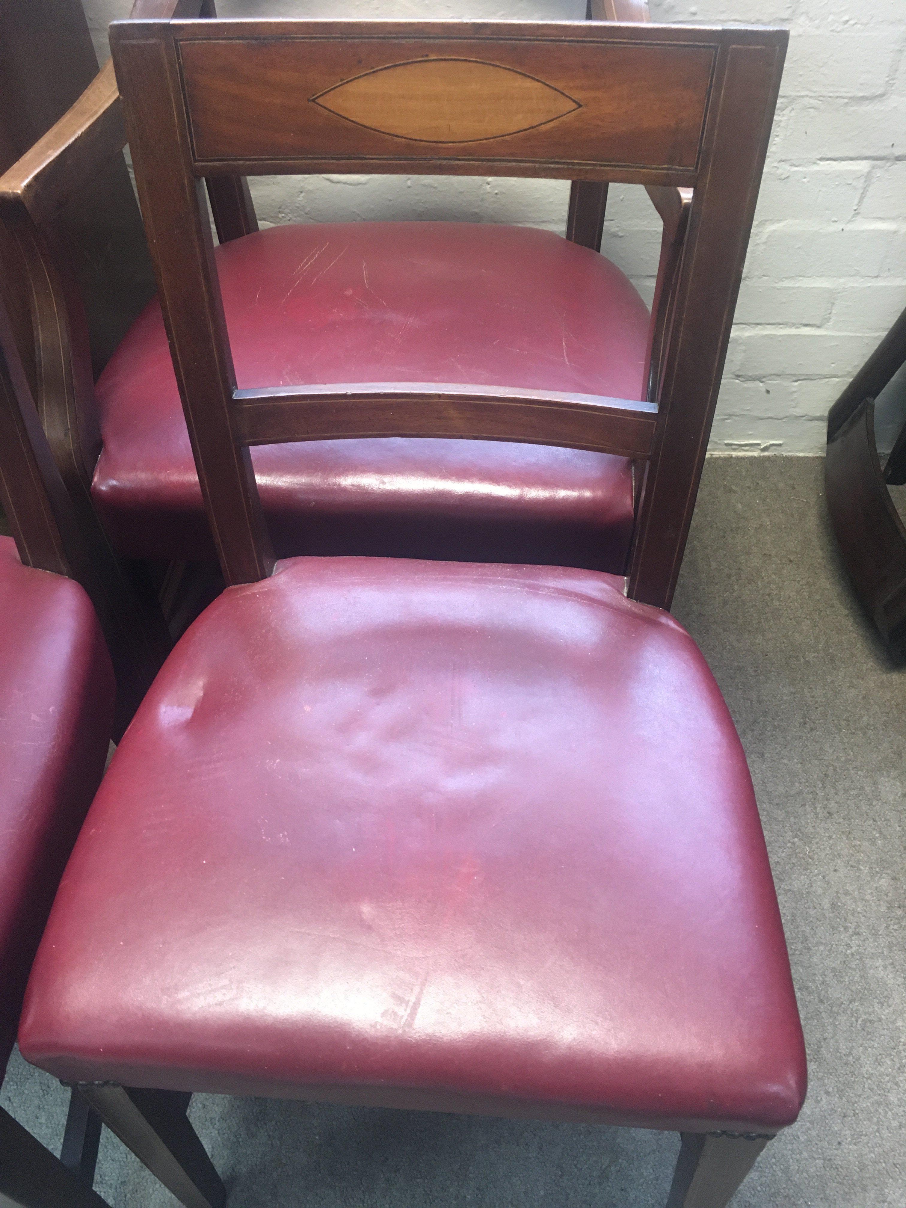 A set of eight Edwardian dining chairs including two carvers with red leather seats on square tapering legs .