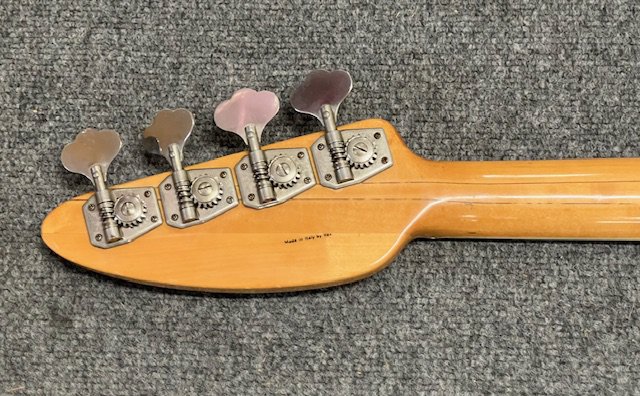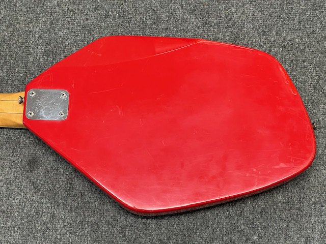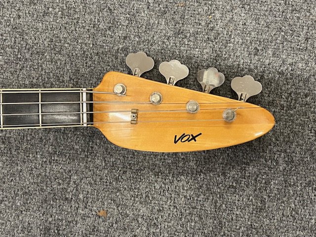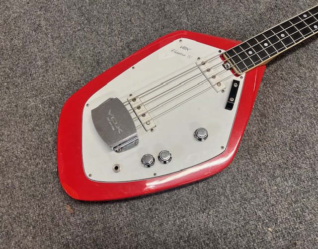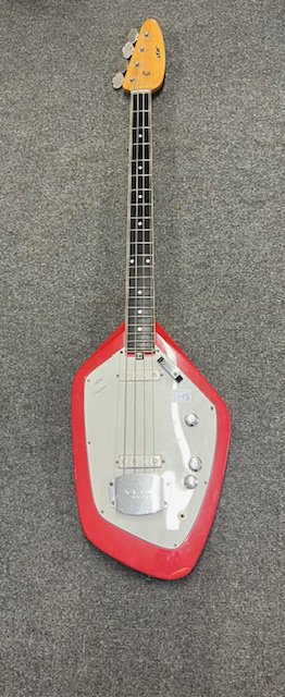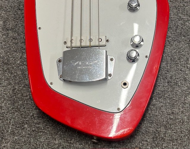 A 1965 Vox Phantom IV Bass Guitar. An Italian made Eko Factory Vox Phantom Bass V209 Model with the angular body shape. Red with all original parts. Some touch up paint to sides and missing rear back pad. General condition good with signs of playwear consistent with age and use.