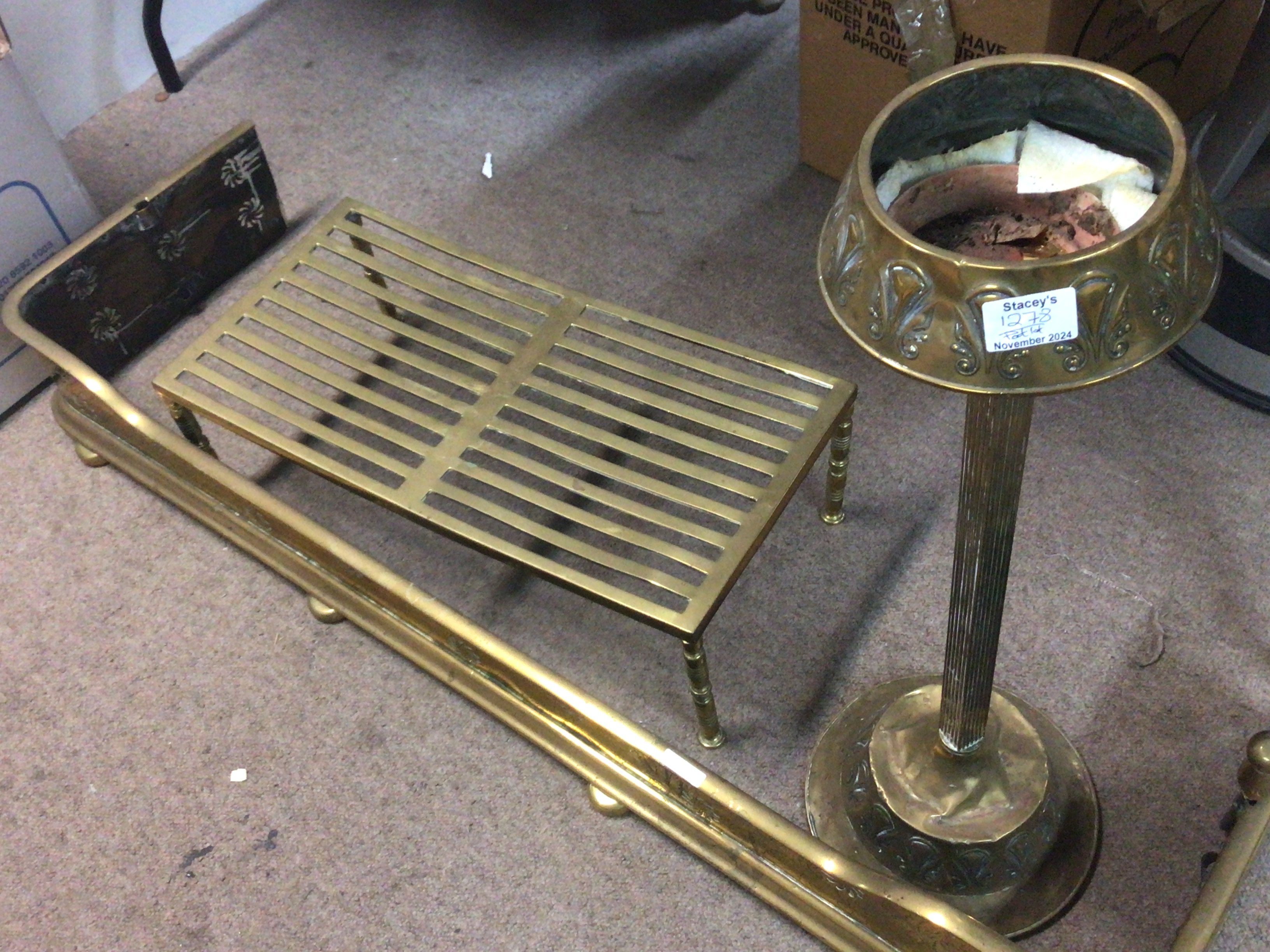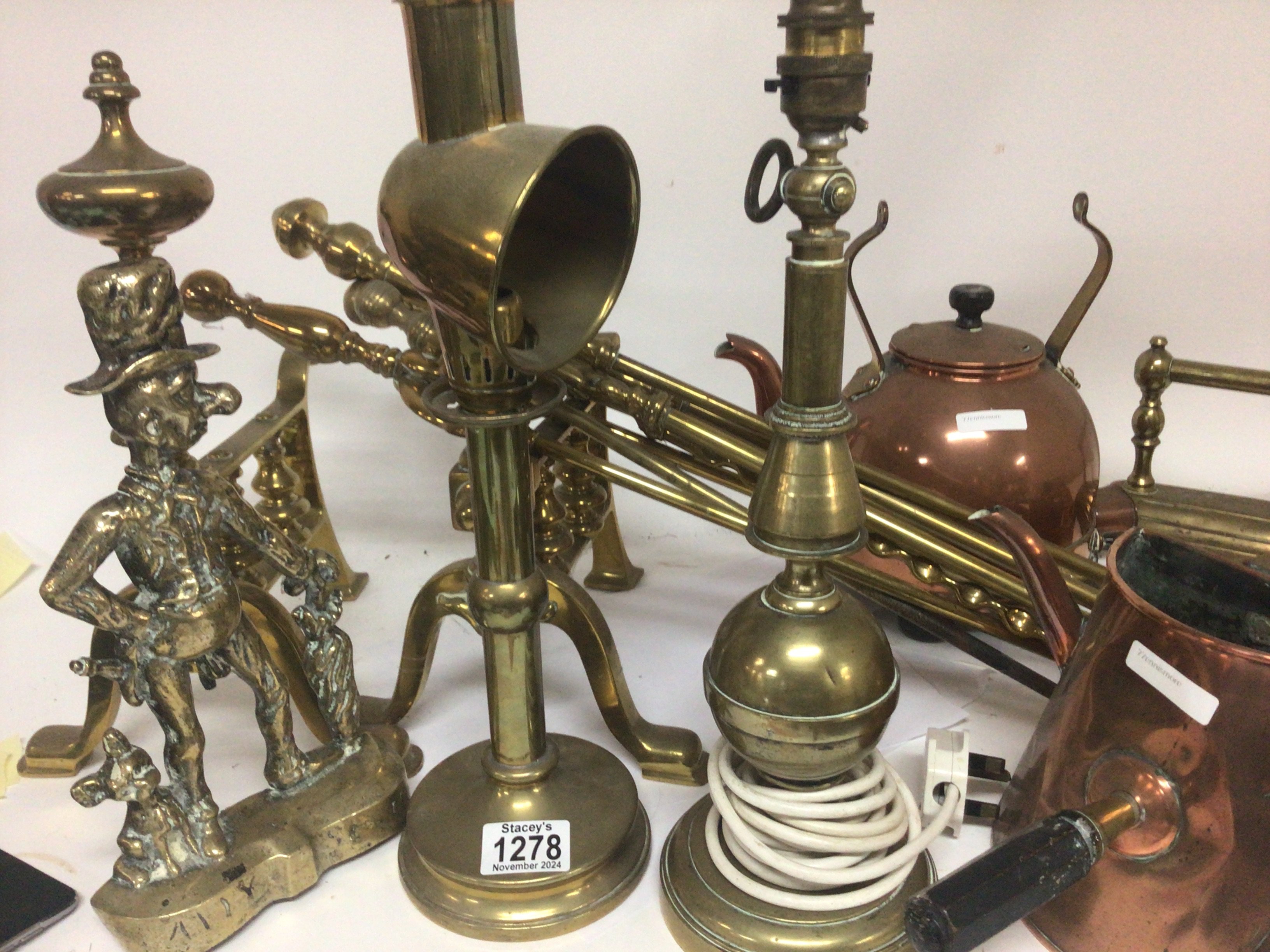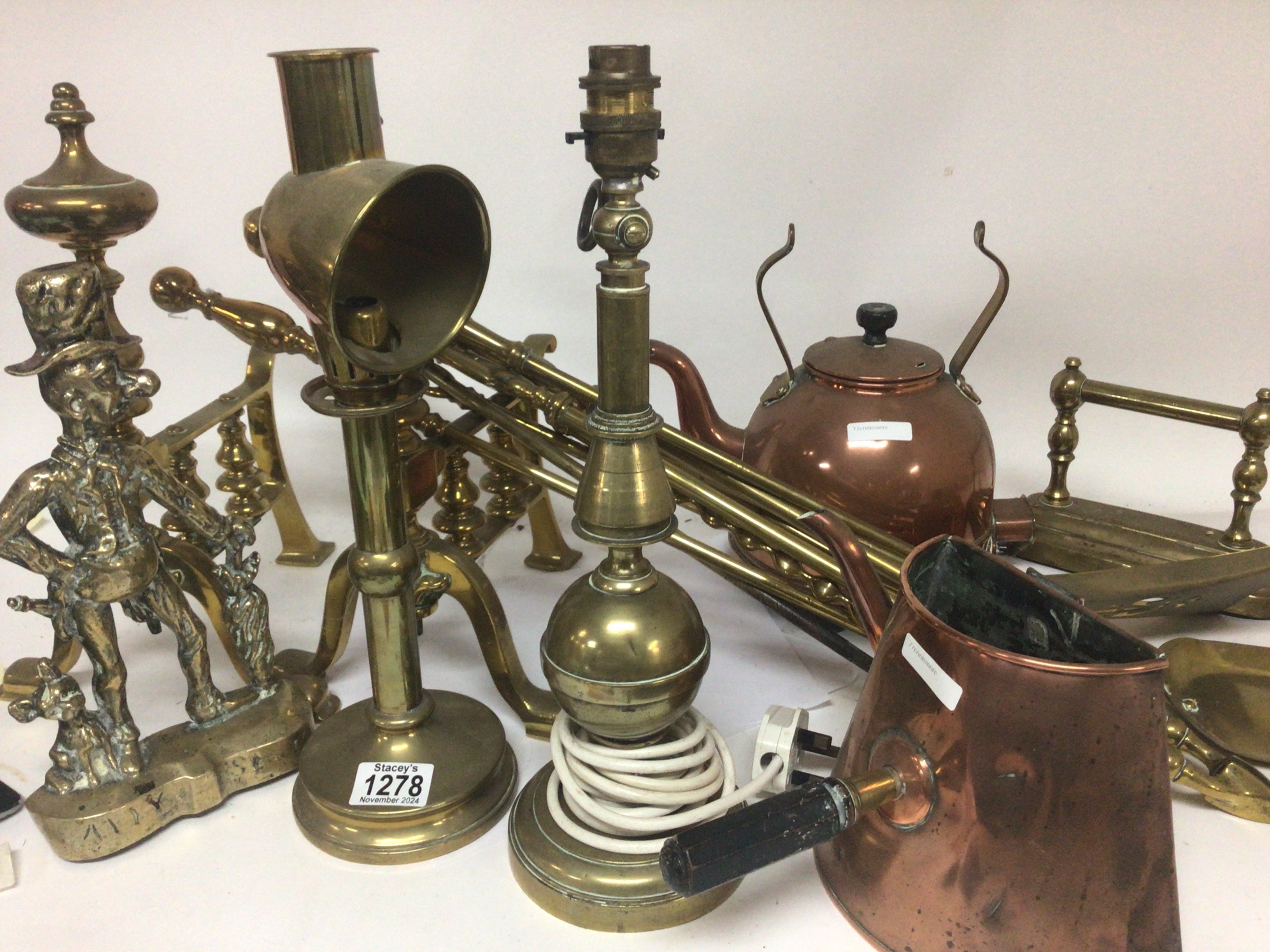 A collection of brass fire irons lamps a large brass trivia stand fire kerb and copper kettles.