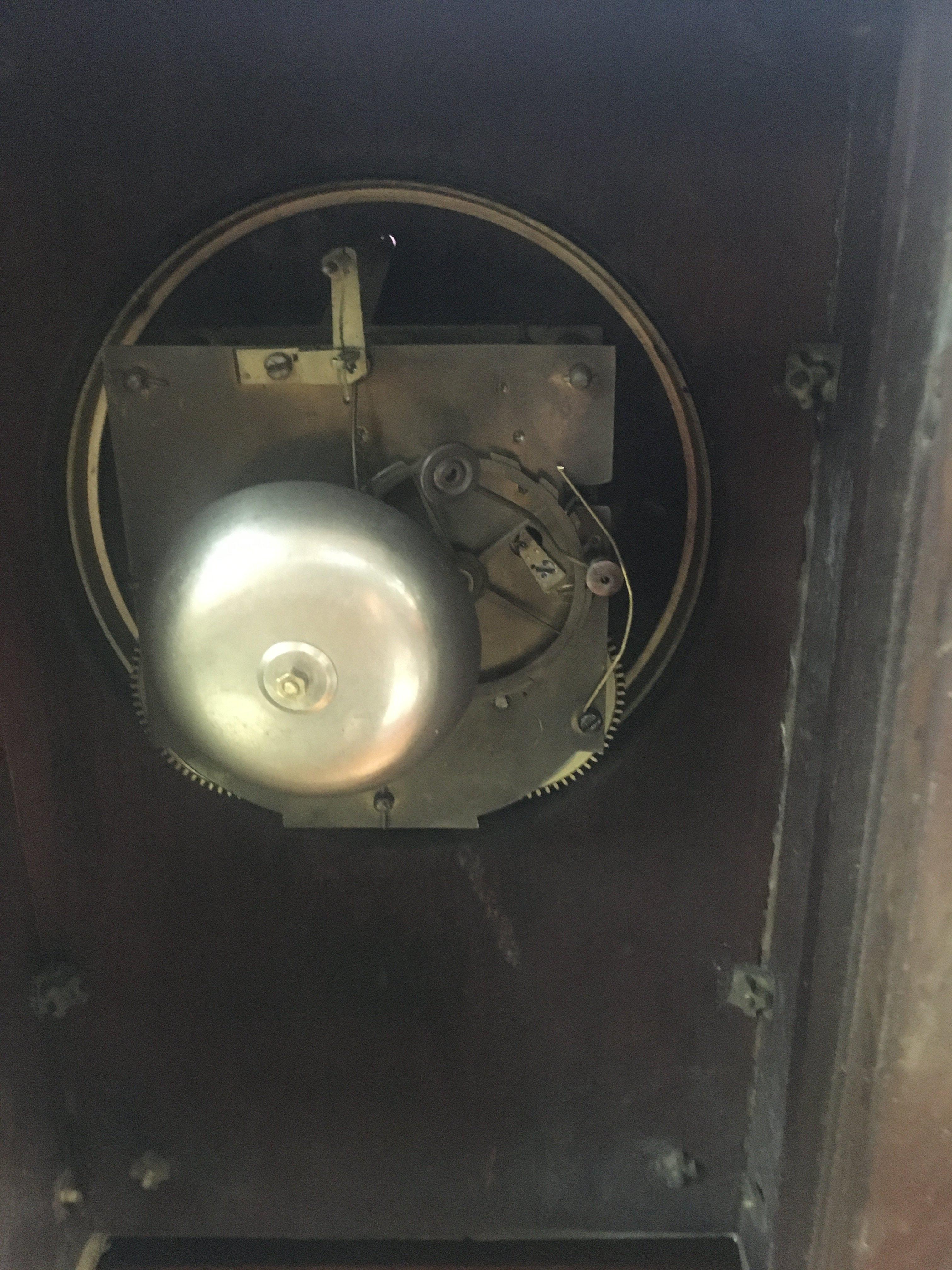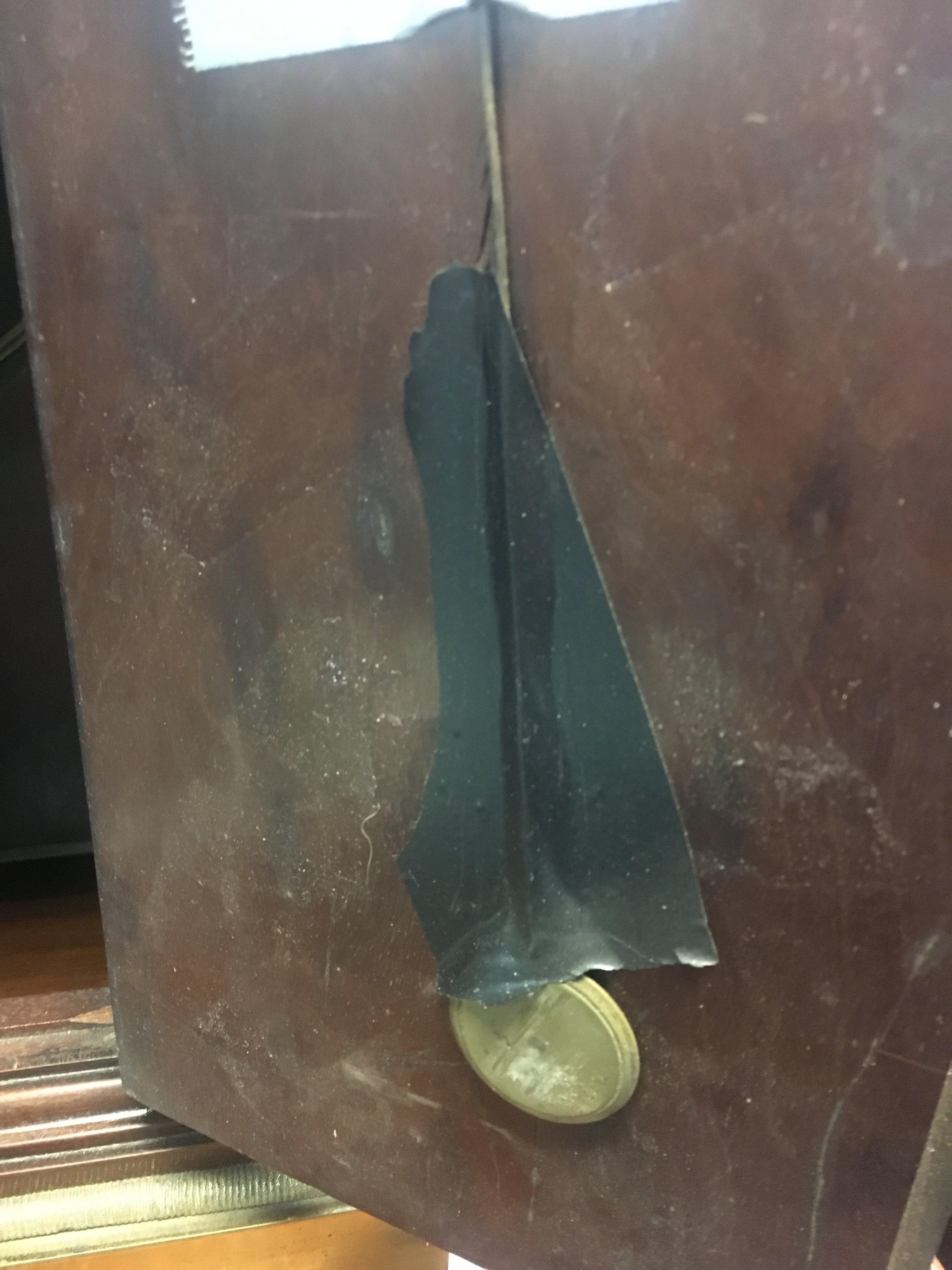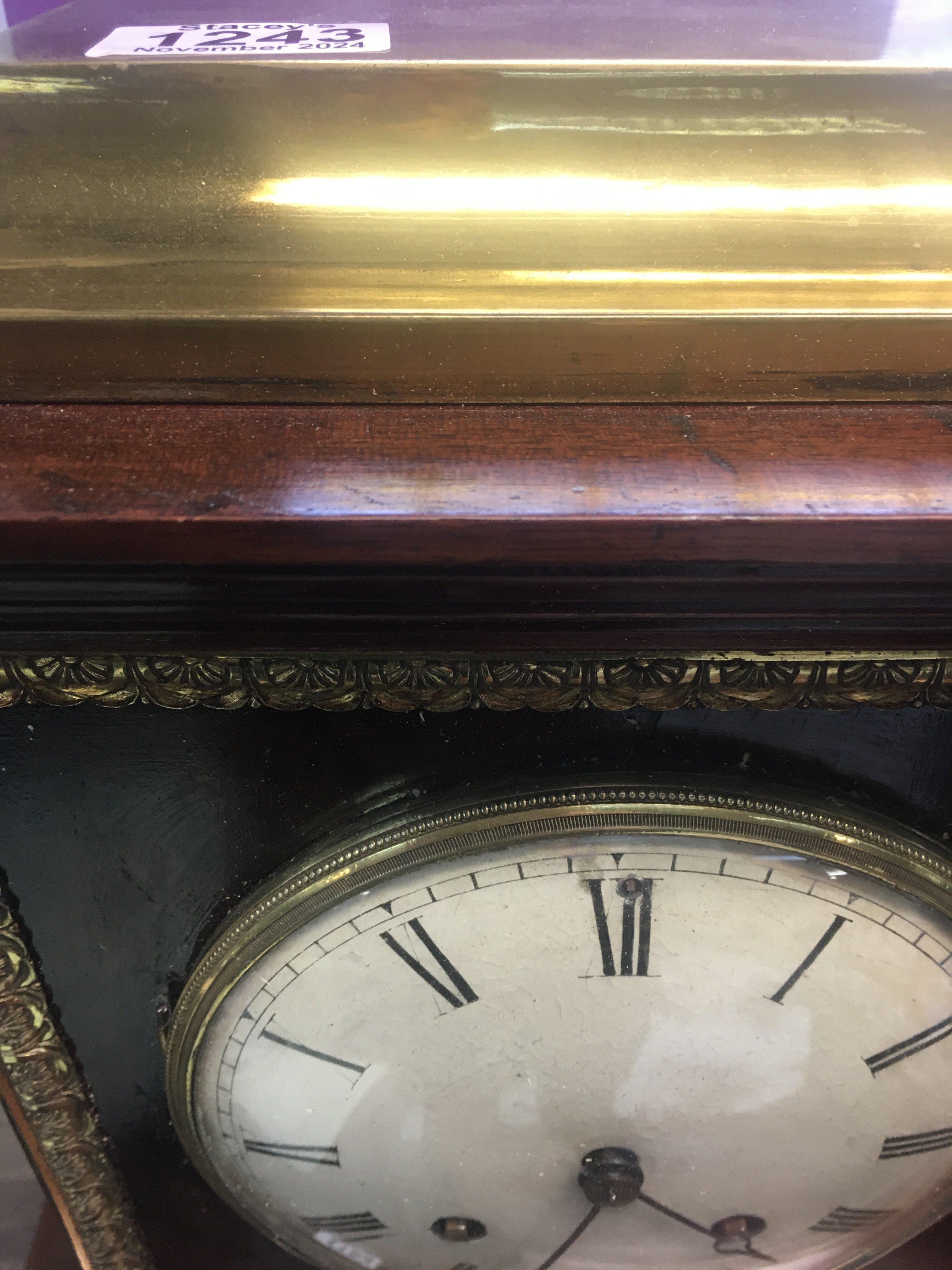 A 19h century French silk suspension table clock the bur and ormaloo cases inset with dial with Roman numerals the movement striking on a bell 43 cm .