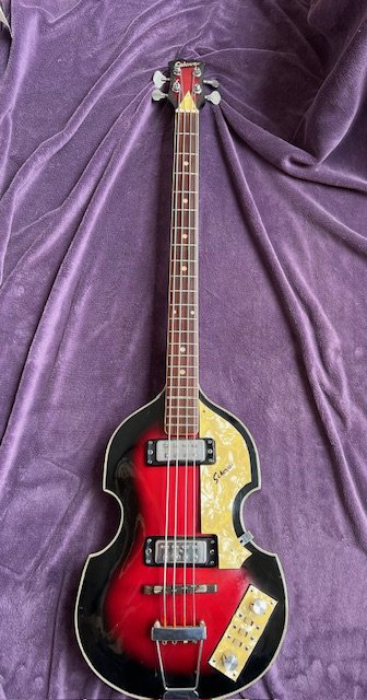 A Sekova Lawsuit era Japanese manufactured bass guitar designed to be a replica of a Hofner Beatle Bass. Average condition with black plastic hard type case.
