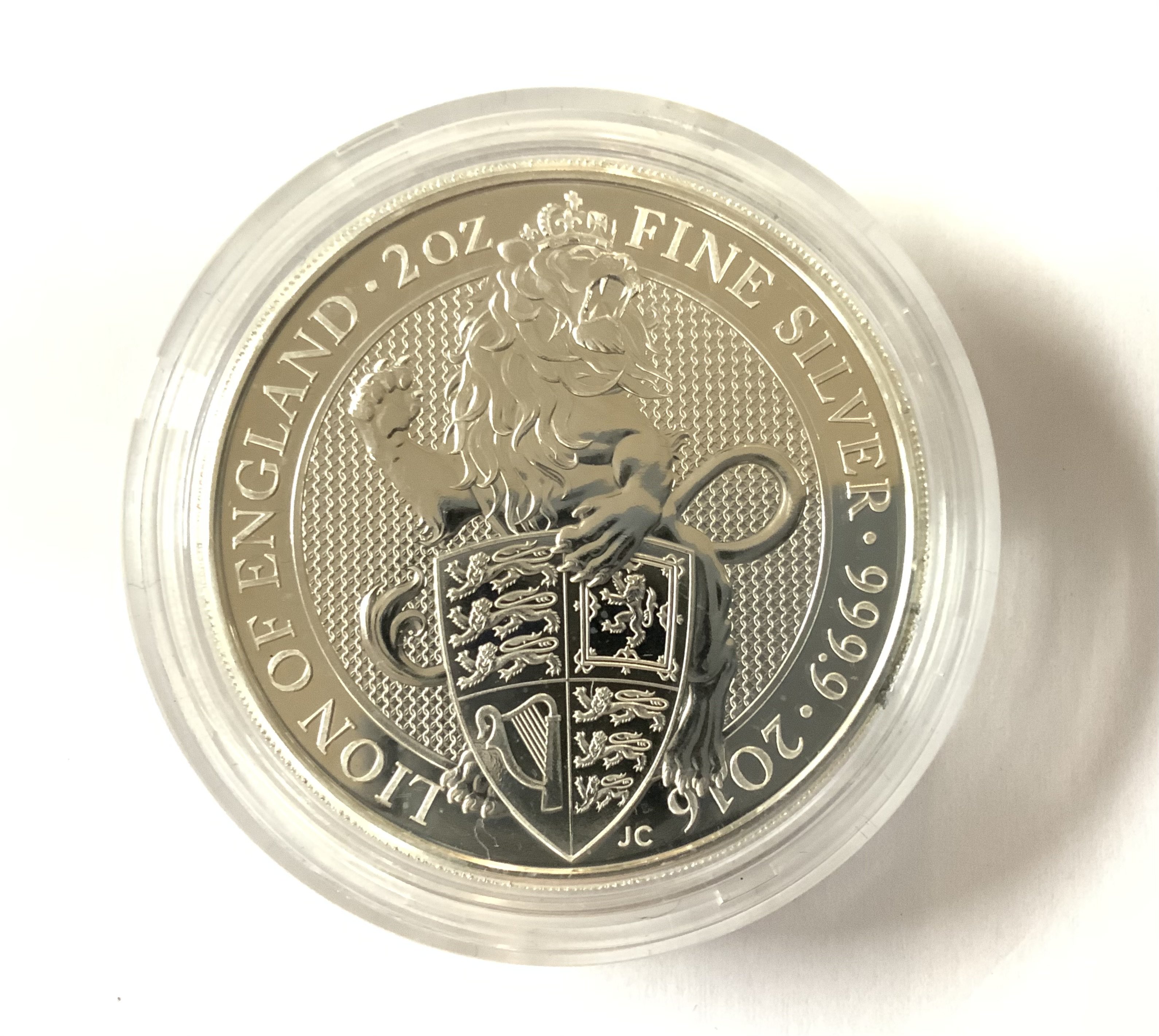 A 2016 Queens Beasts, the Lion of England 2oz fine silver coin. (A)