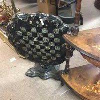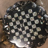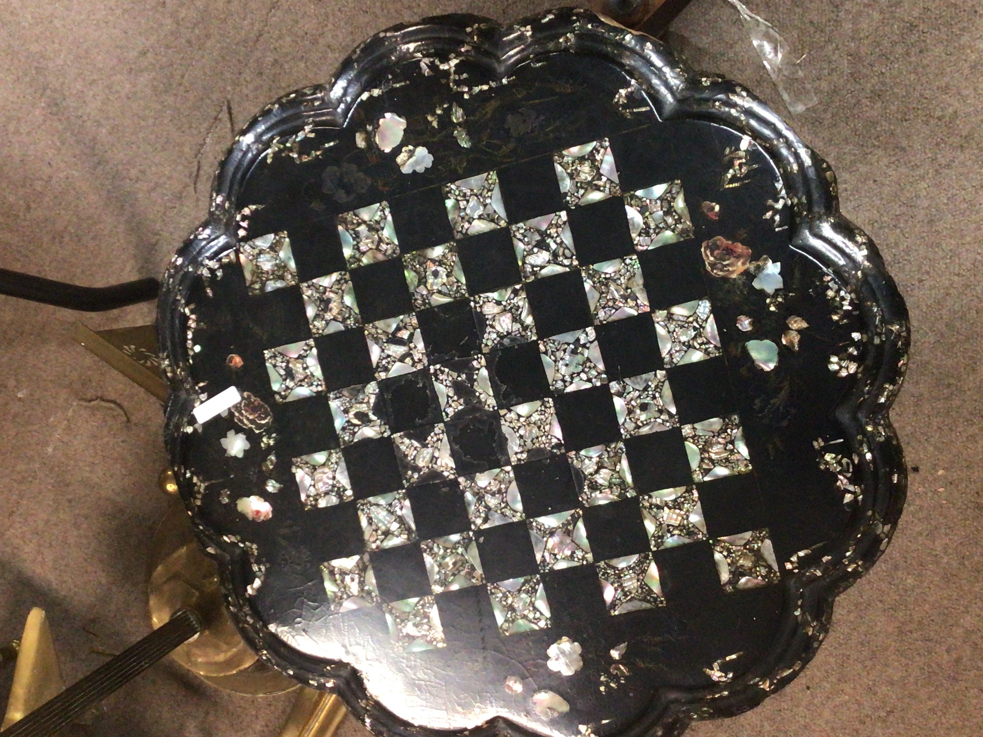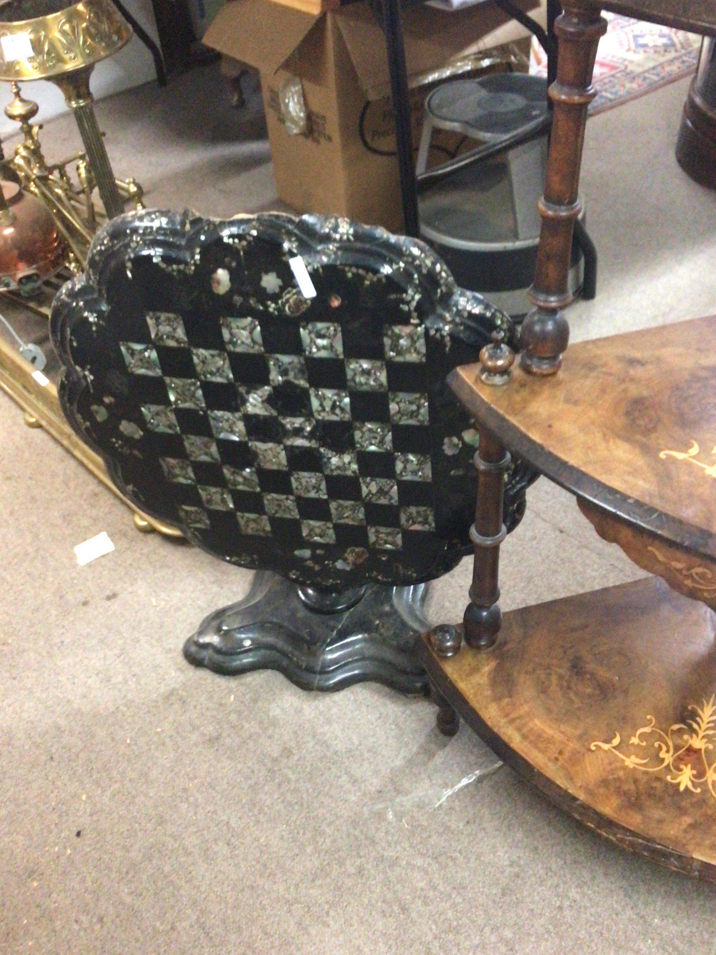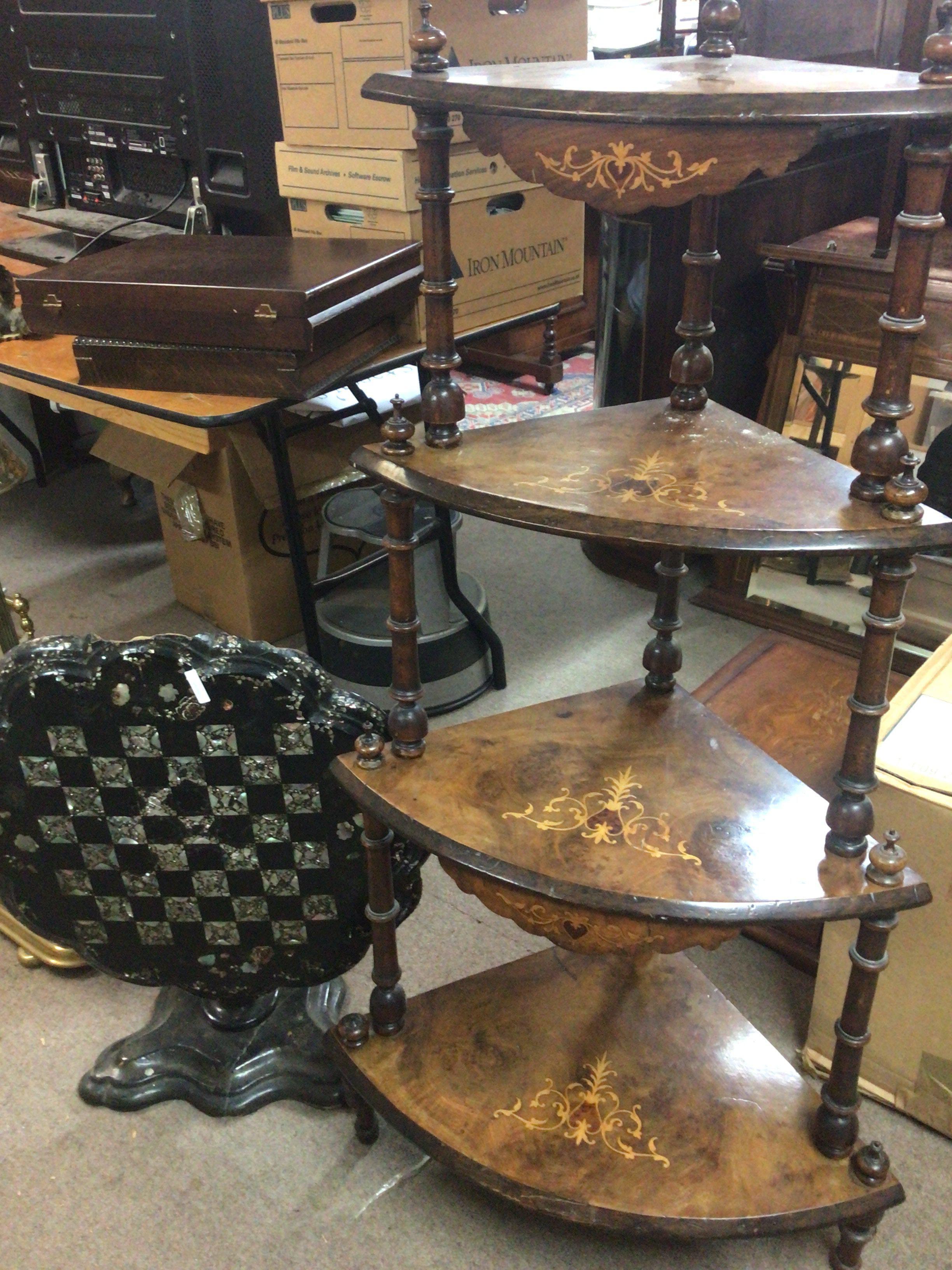 A Victorian burr walnut corner whatnot stand and a Victorian paper mache table (2)
