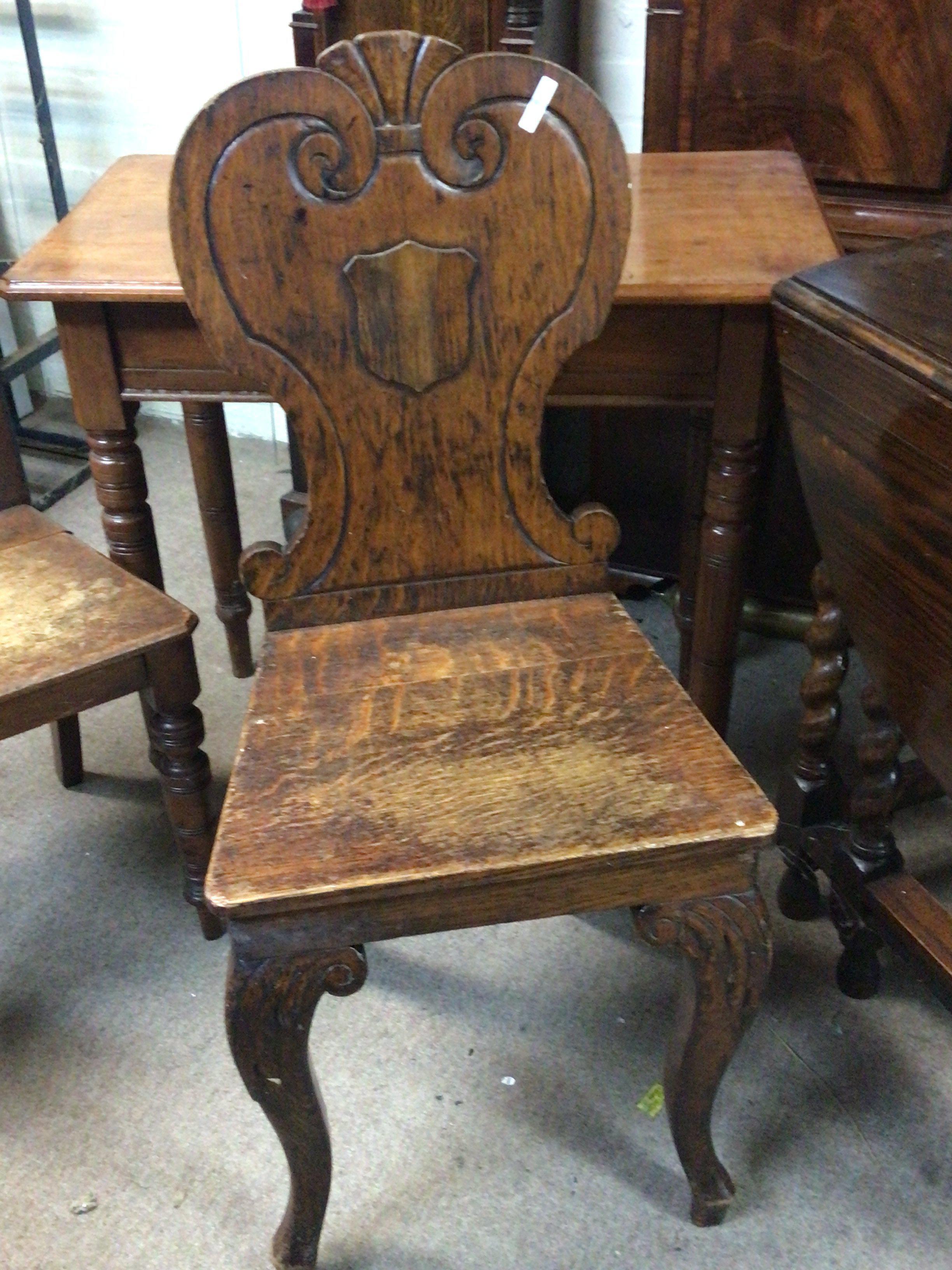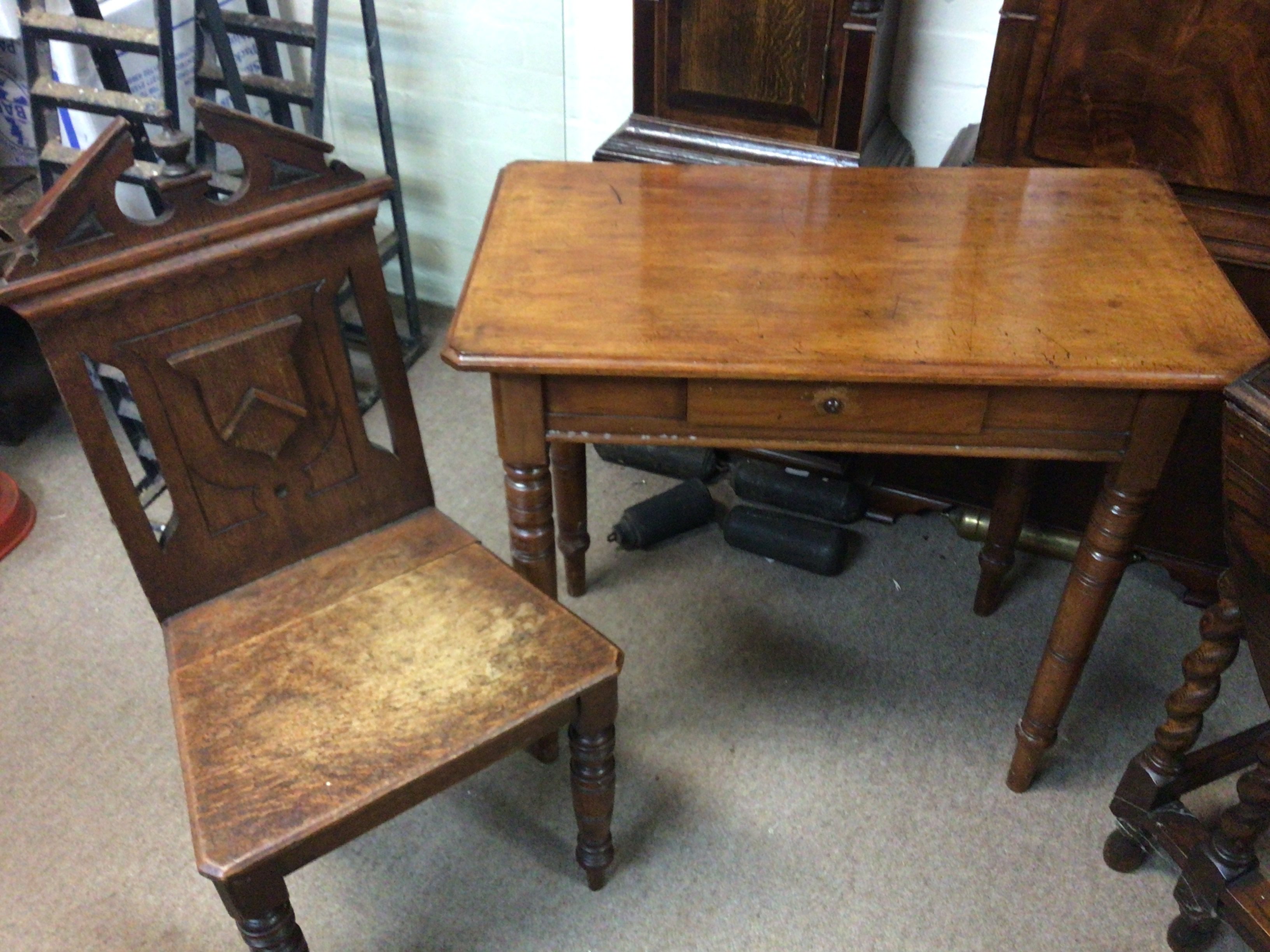 An oak drop leaf dining table an Edwardian walnut table with a single drawer and and two oak Victorian hall chairs (4)