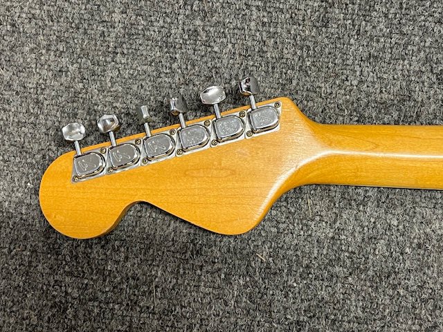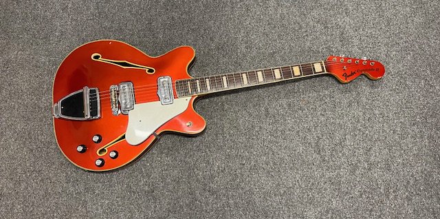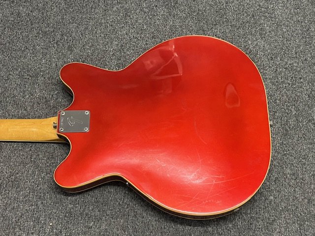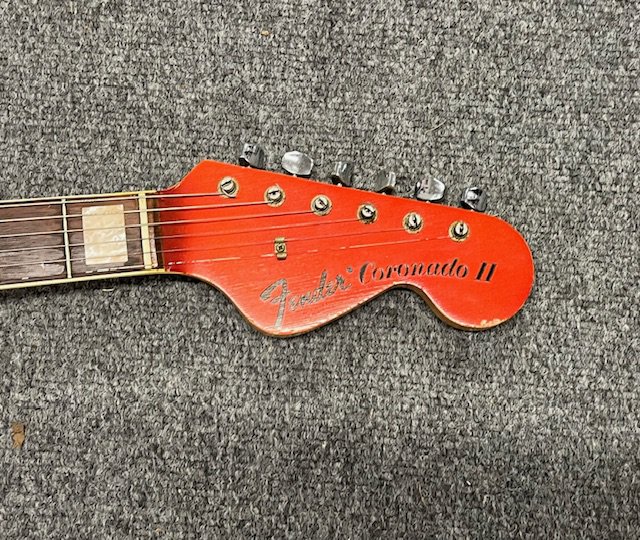 A 1967 Fender Coronado II 6 string electric guitar. Candy Apple Red metallic with matching headstock. Finish has aged with yellowing to clearcoat lacquer. All original parts. Extensive playwear. Some edgewear to back, sides and headstock. Significant playwear and tarnishing to frets and fingerboard. Comes with non original gig bag.