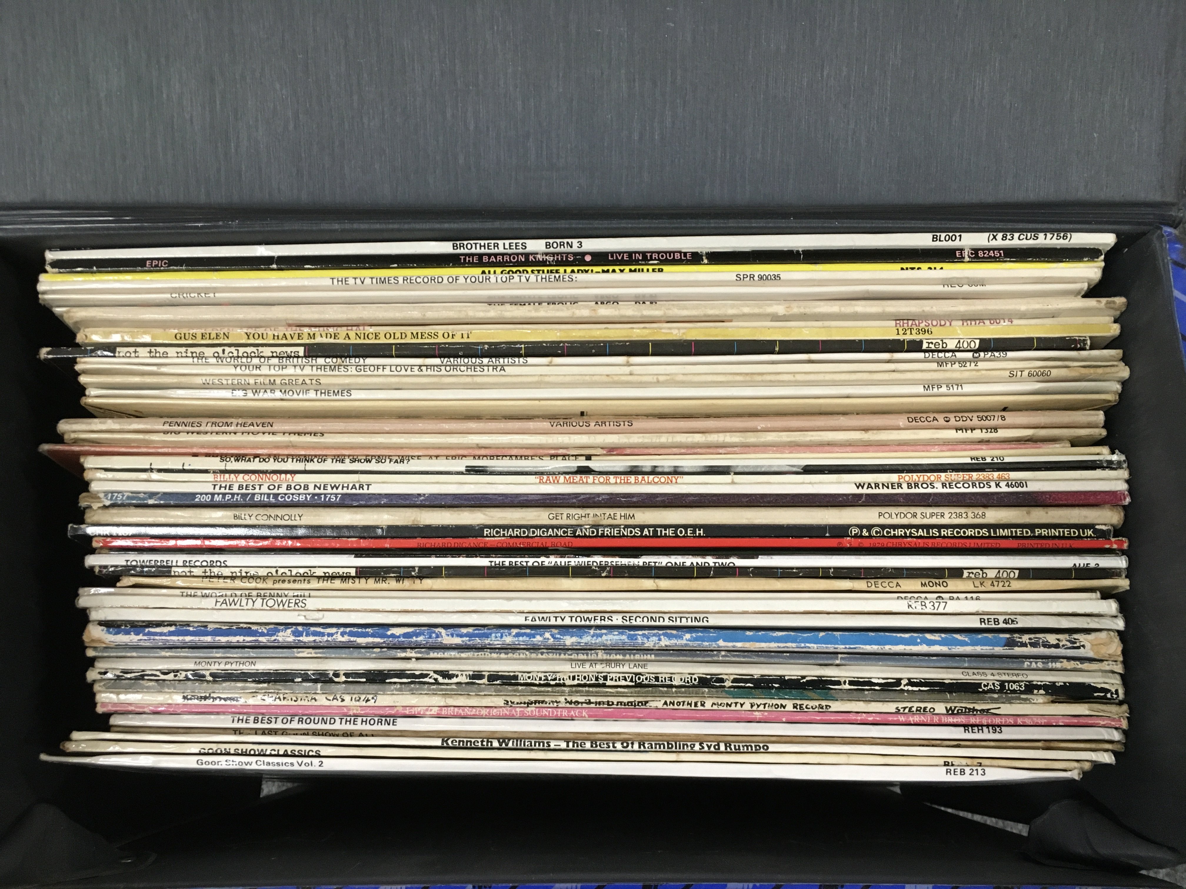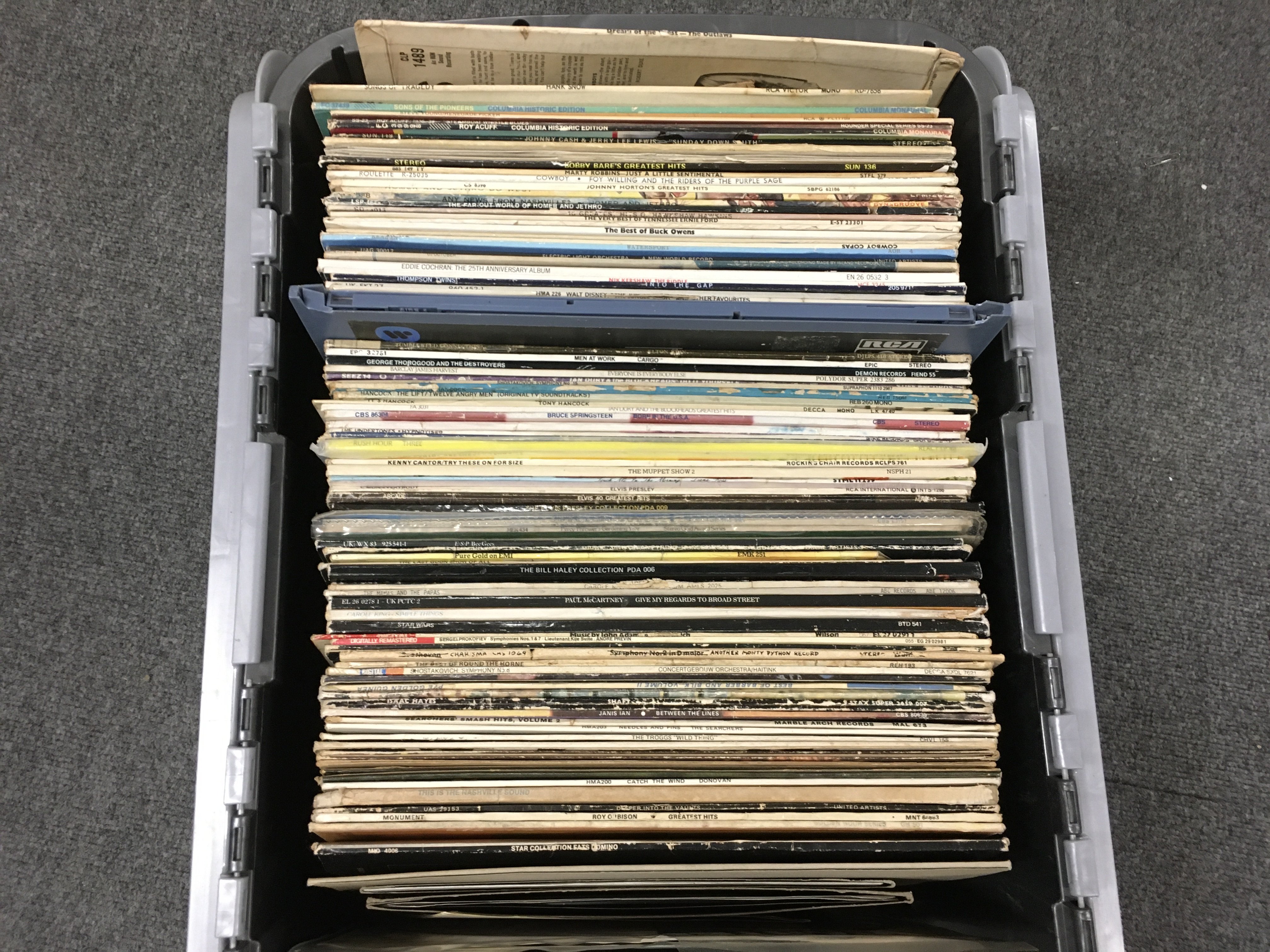 A box and a record case of LPs by various artists including Bruce Springsteen, Elvis Presley, Eddie Cochran and others.