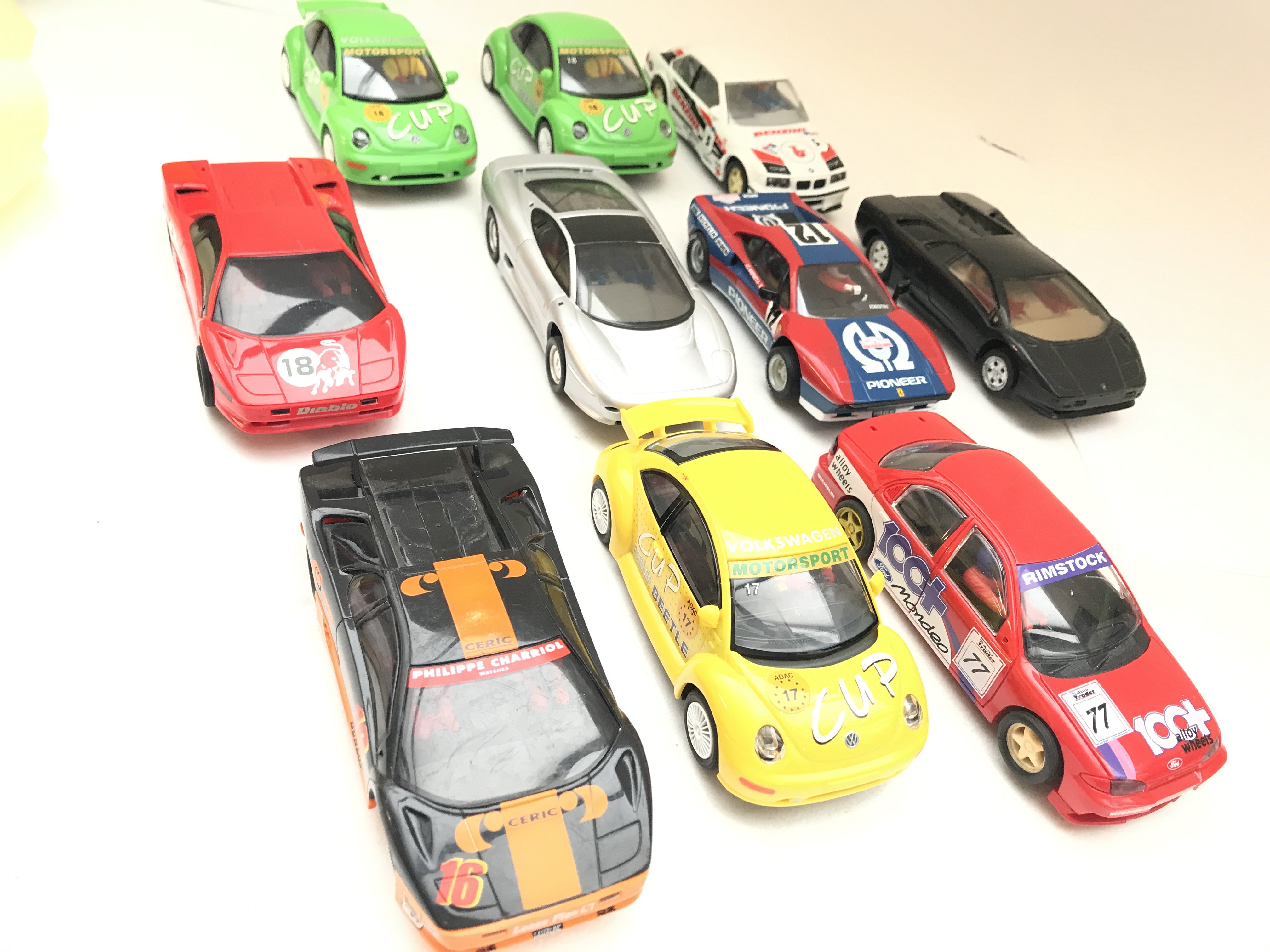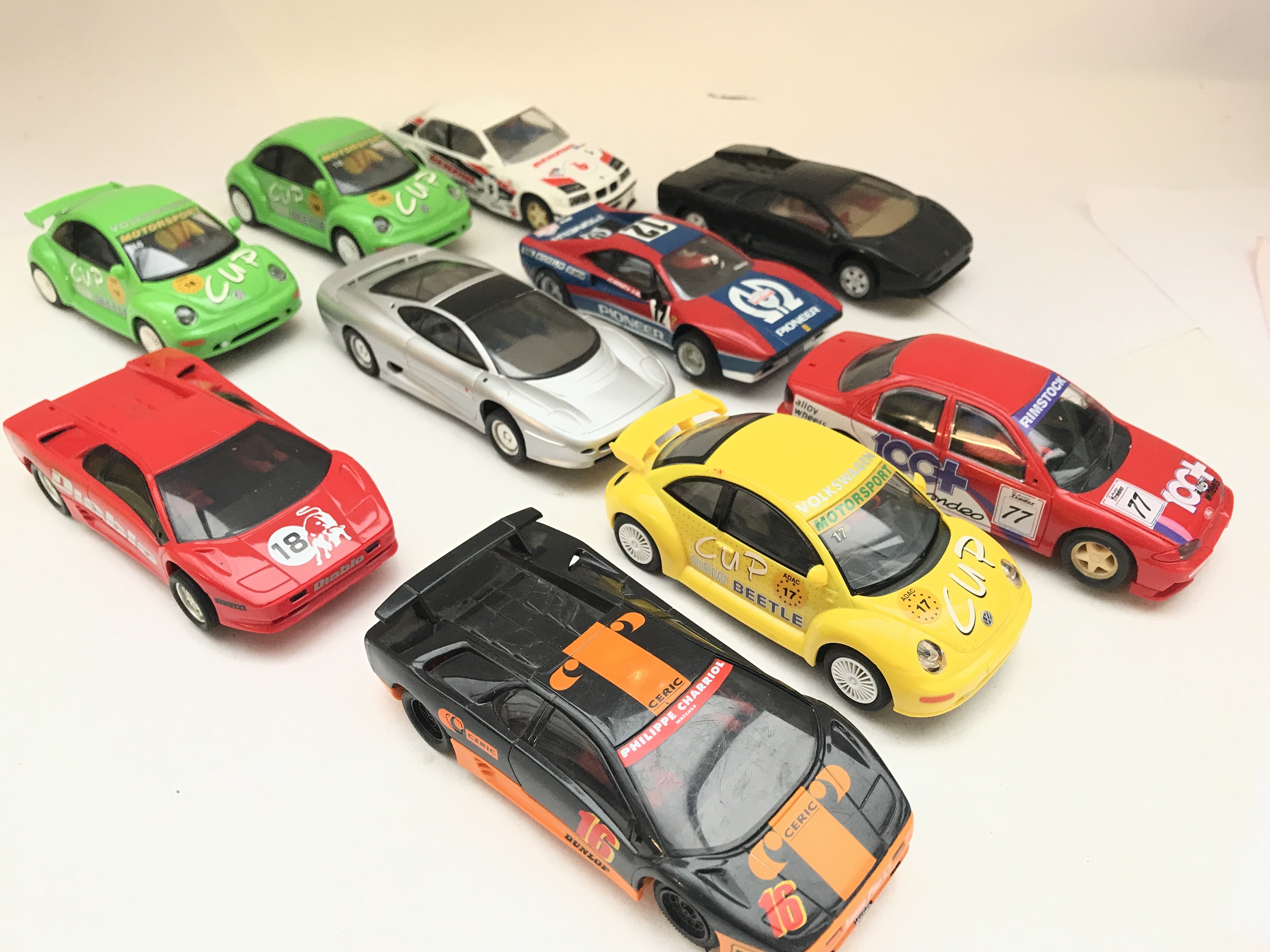 A Collection of 10 Scalextric Cars. Including VW Beatles. Ferrari etc.