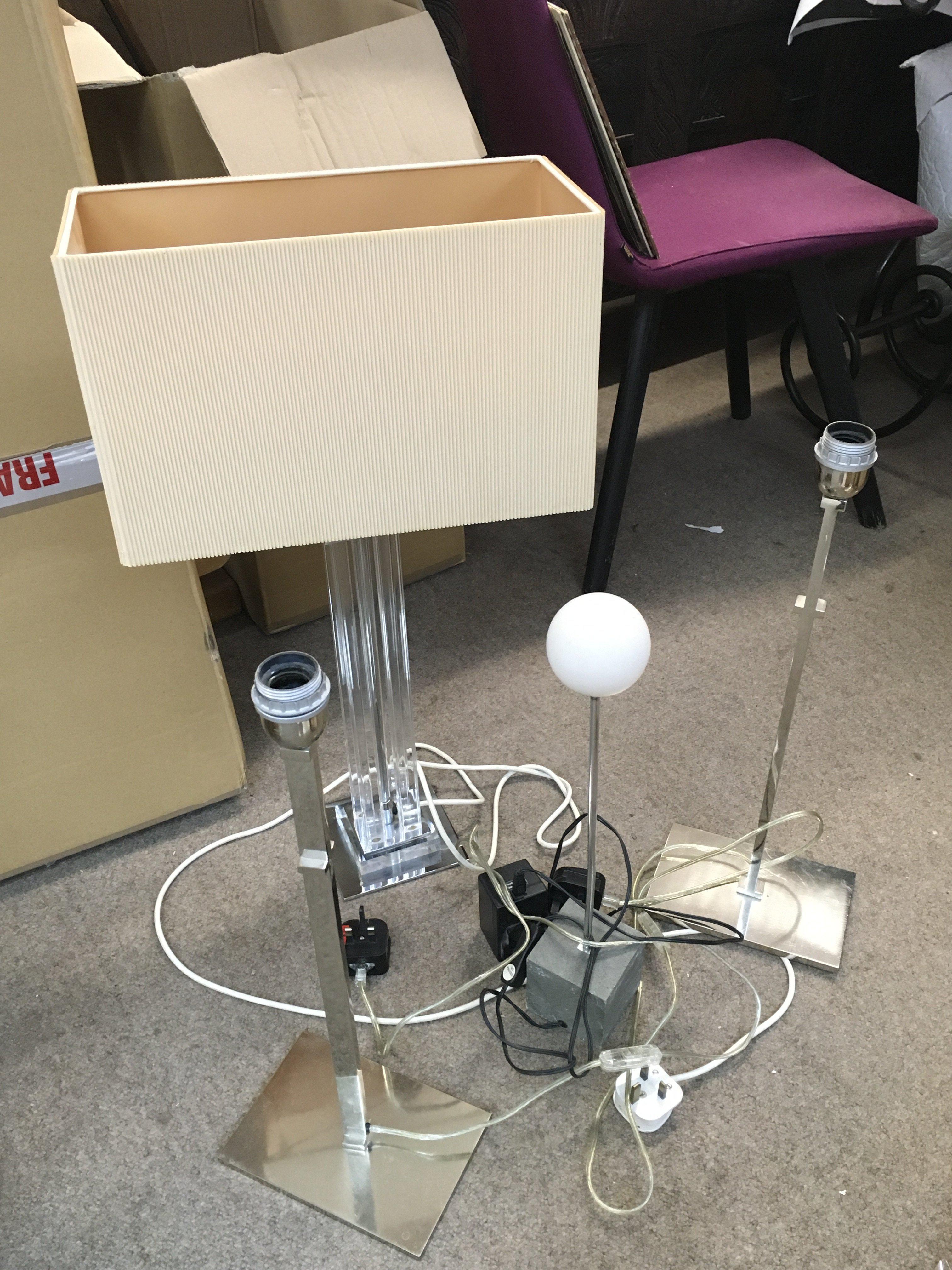 A Collection of modern table lamps including a perspex example and a pair of chrome lamps. 53 and 69cm tall. Postage category C