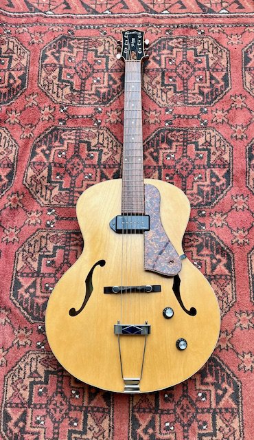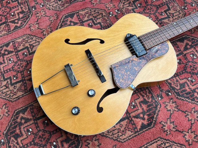 An early 2000's Godin Kingpin archtop guitar with P90 Pickup in natural. Made in Canada. All original. Ply Maple Body Flamed Maple Neck and Rosewood Fingerboard. Evidence of very light playwear. Comes with Godin Original shaped case.