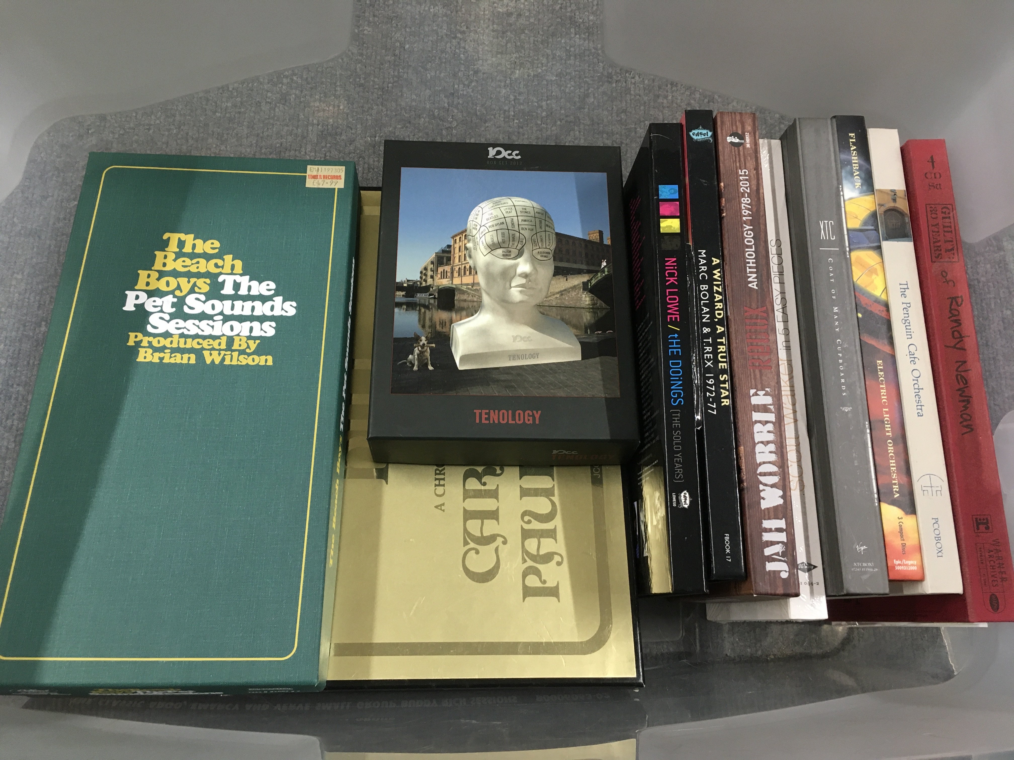 A box of CD box sets by various artists including Marc Bolan, Scott Walker, The Beach boys and others.
