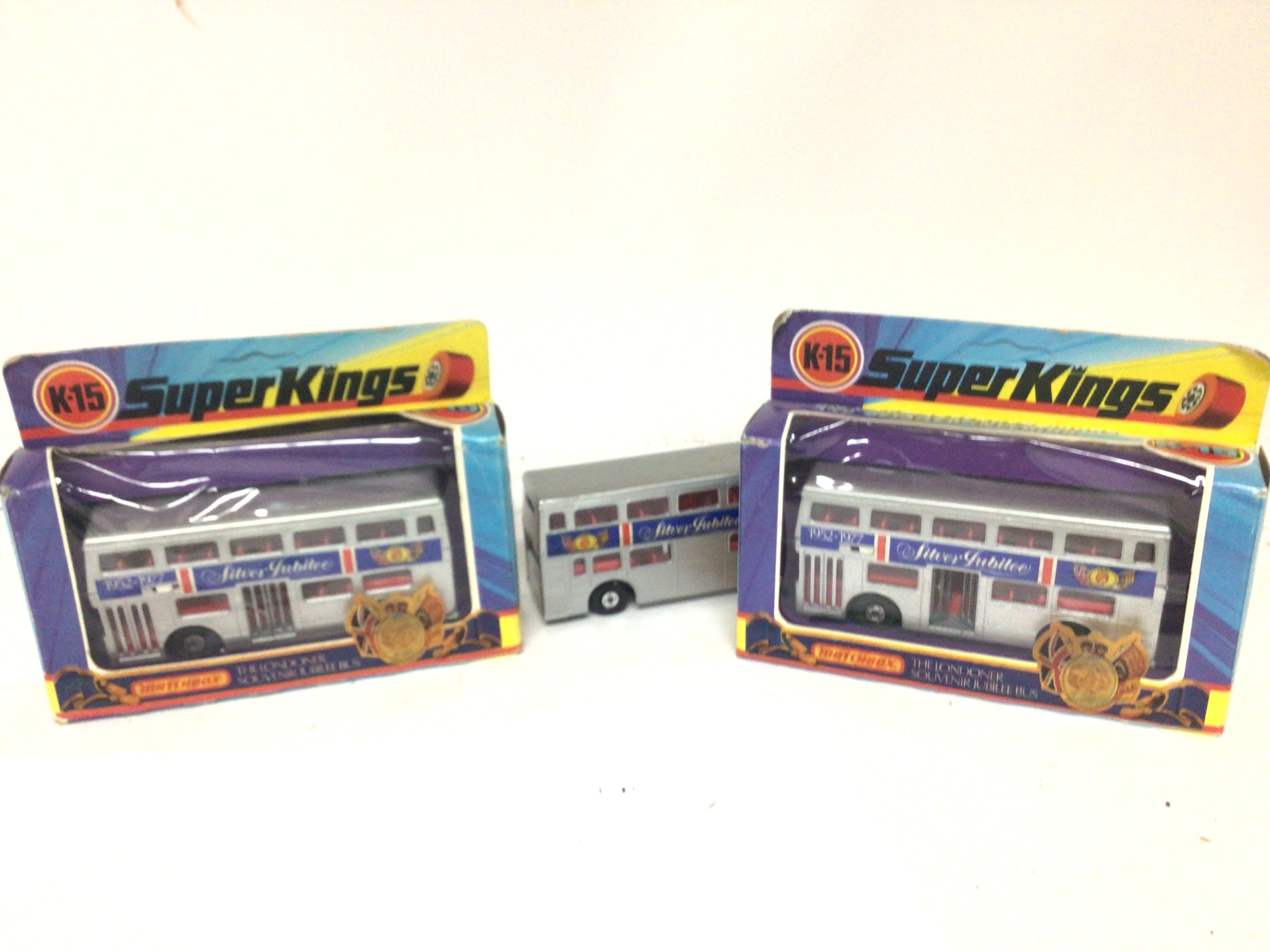 Two boxed Matchbox die cast Super King K.15 Silver jubilee buses and one unboxed.