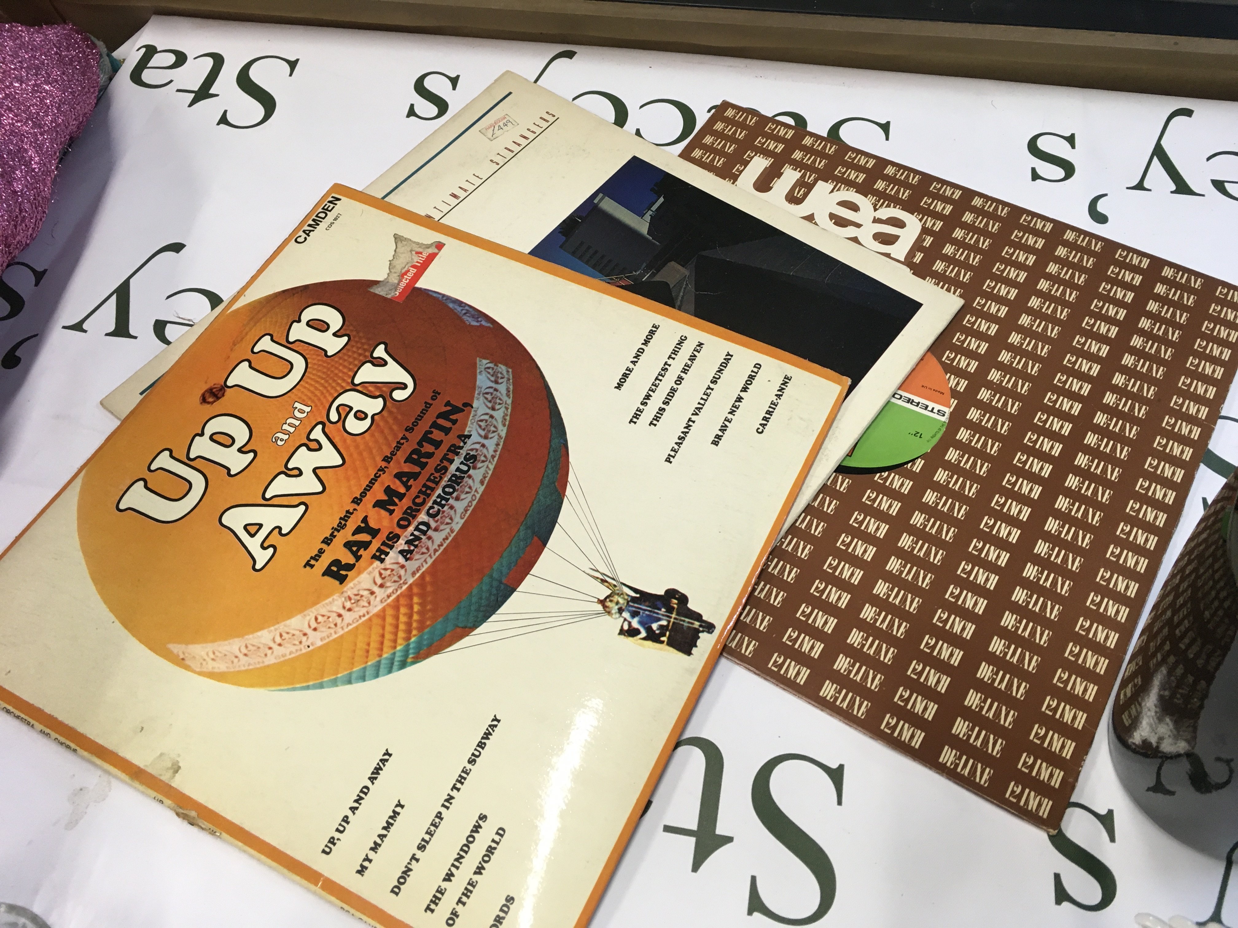 A Collection of assorted items including a Royal Worcester vintage car plate and cup, brass duck bowl, West German vase, collector of Vinyl records including Sister sledge, Tom Scott, Ray Martin, large silver plate tray.
