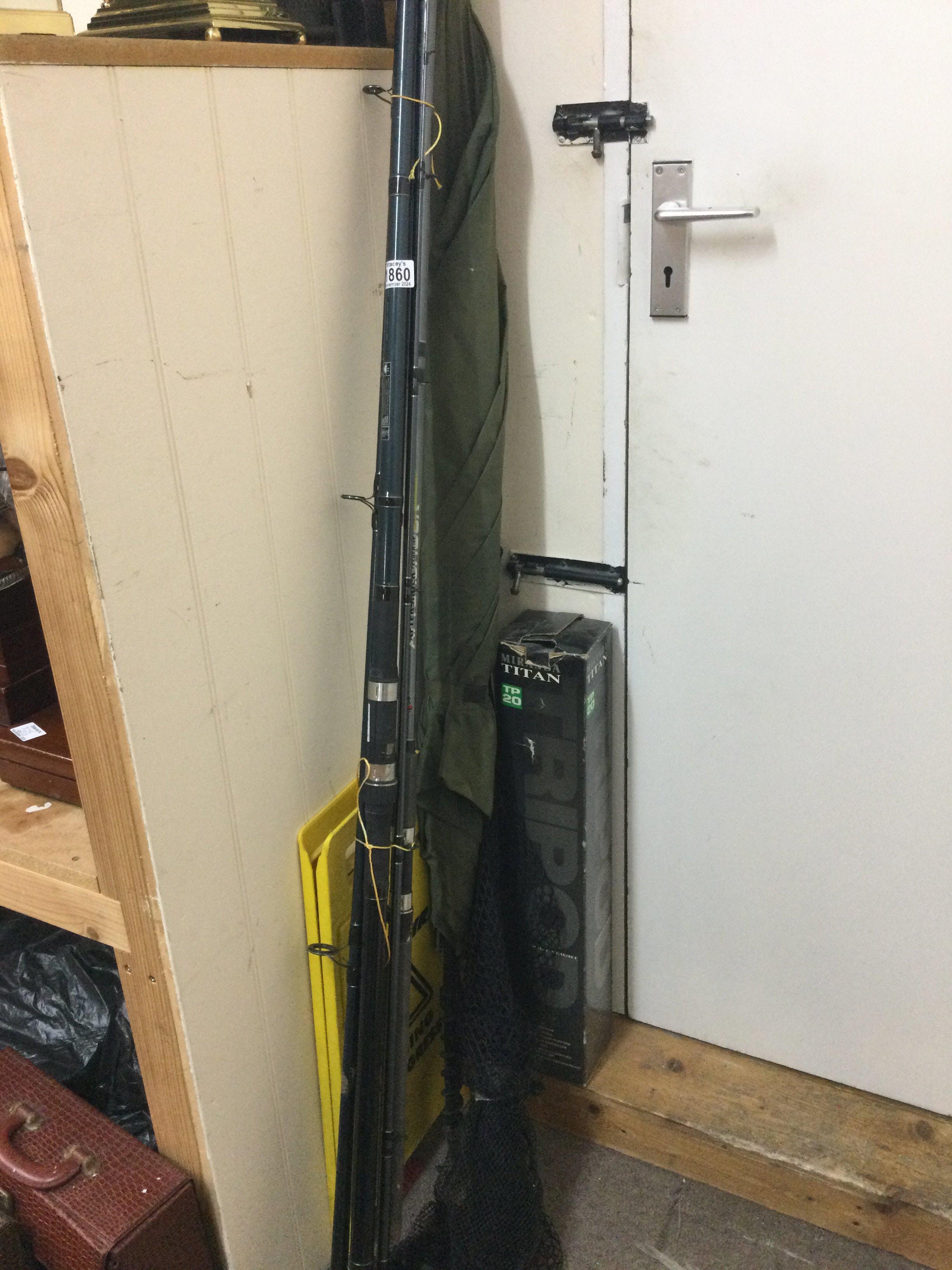 A collection of fishing equipment including fishing Rods , net and umbrella .