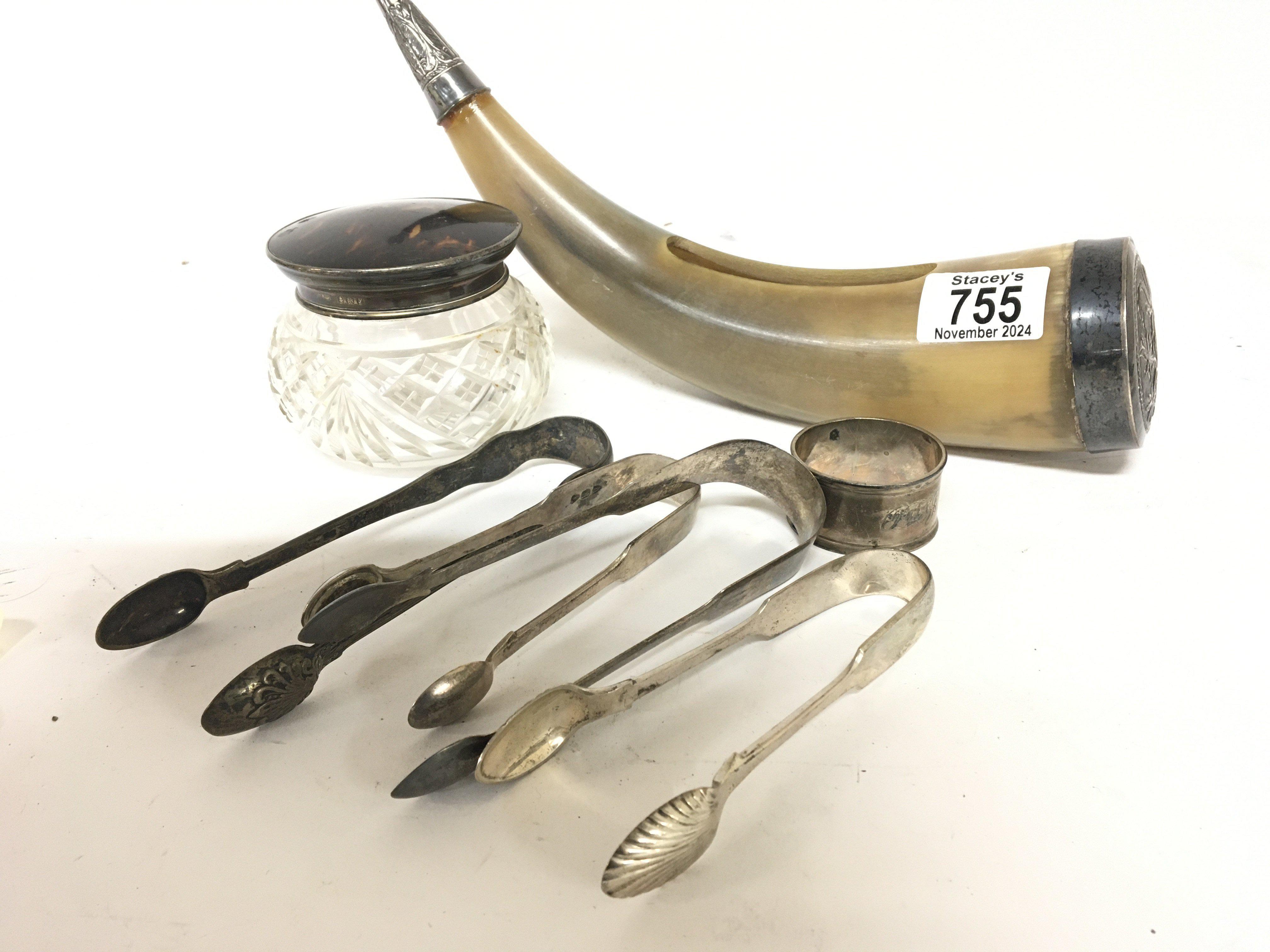 A collection of George III silver sugar tongs a silver and tortoise shell and cut glass jar a carved horn flower posy and other ornaments.