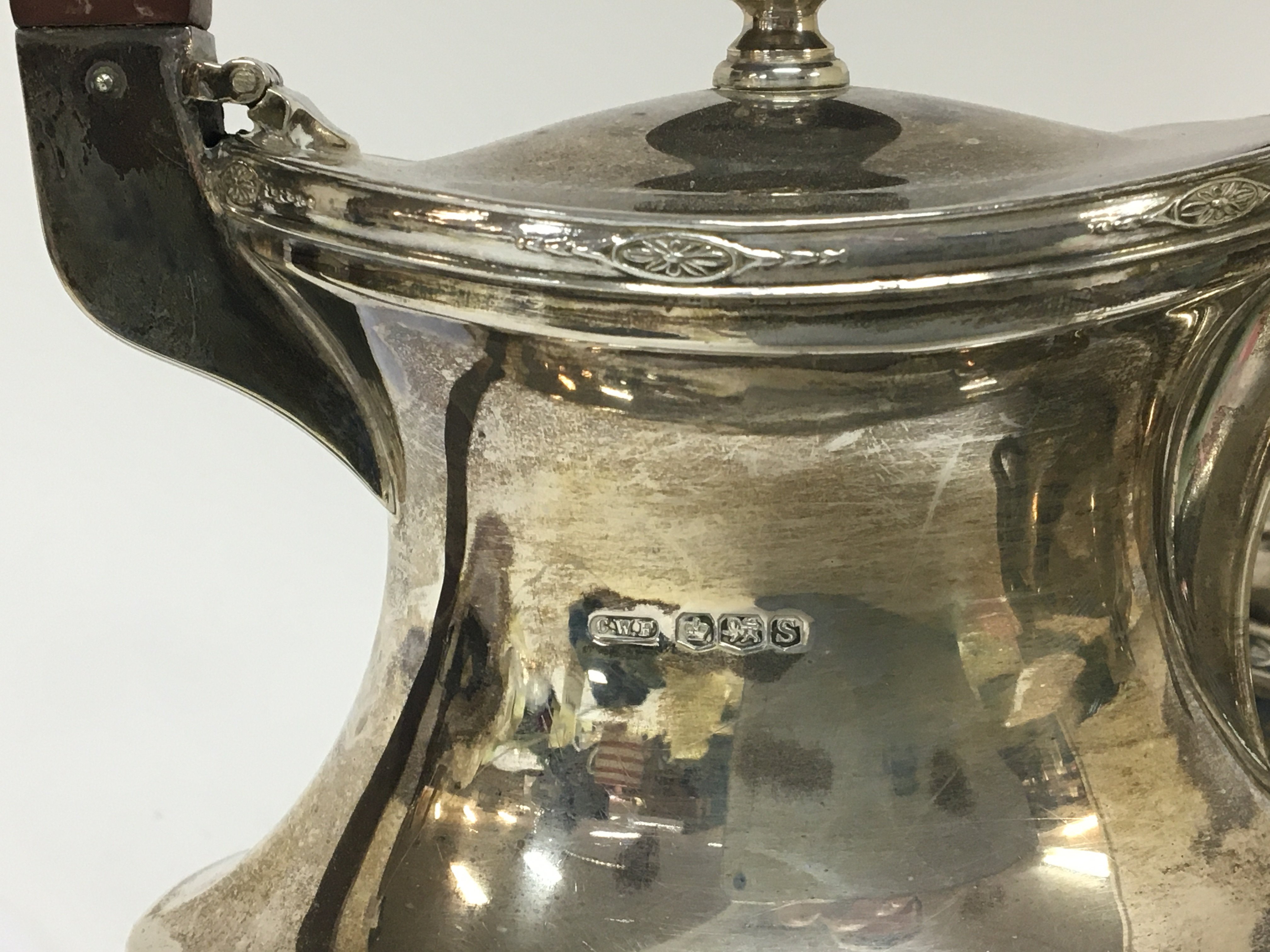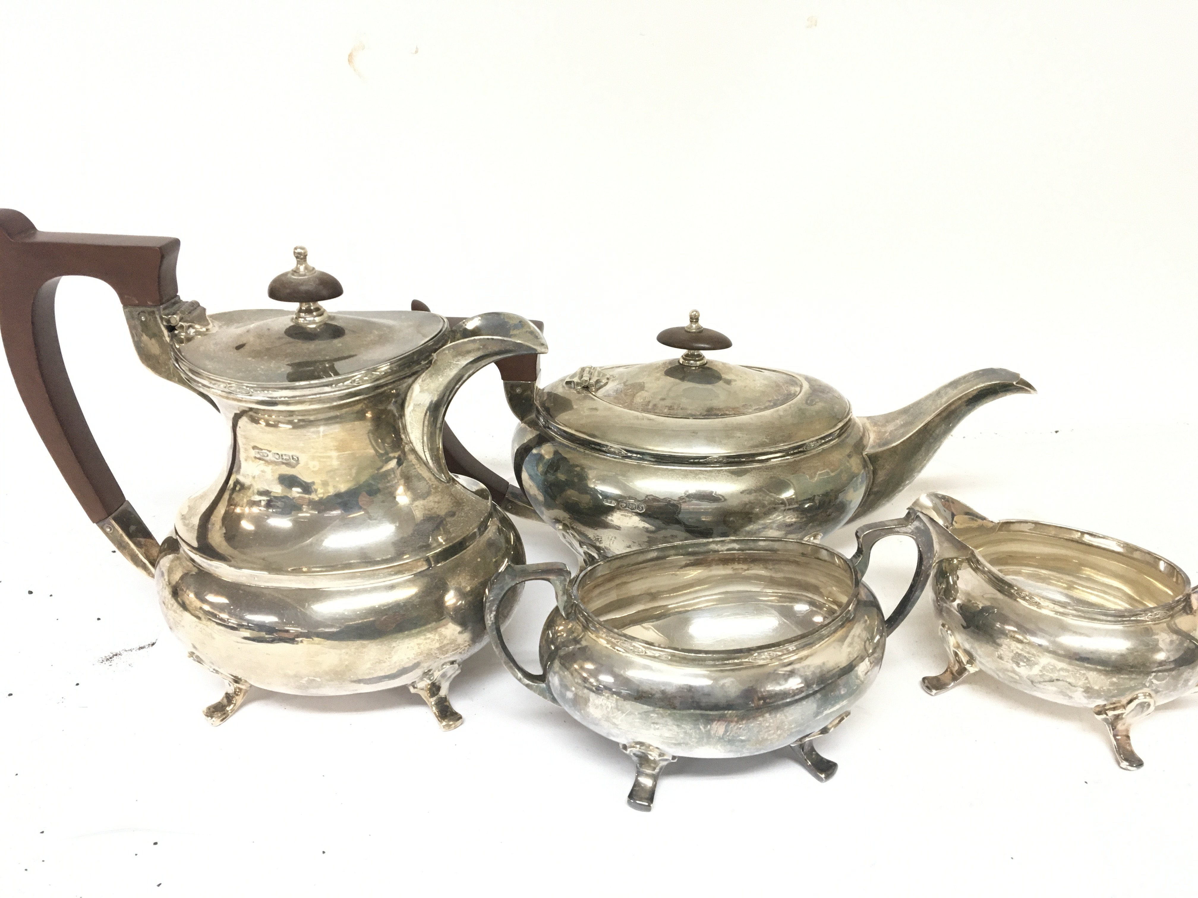 A Four piece silver tea set with hot water jug tea pot cream jug and sugar bowl Sheffield hallmarks good condition total weight approximately 1995g.