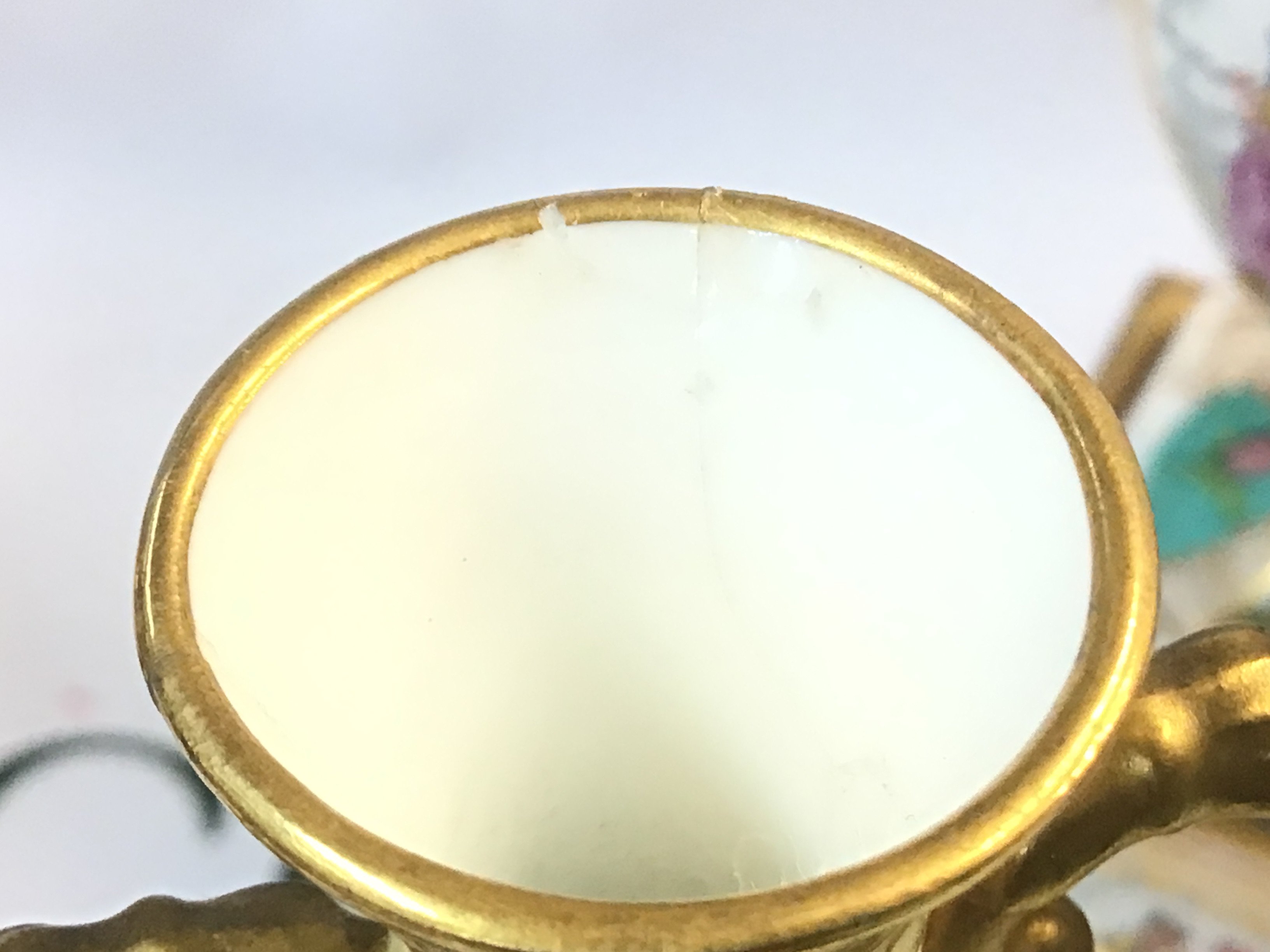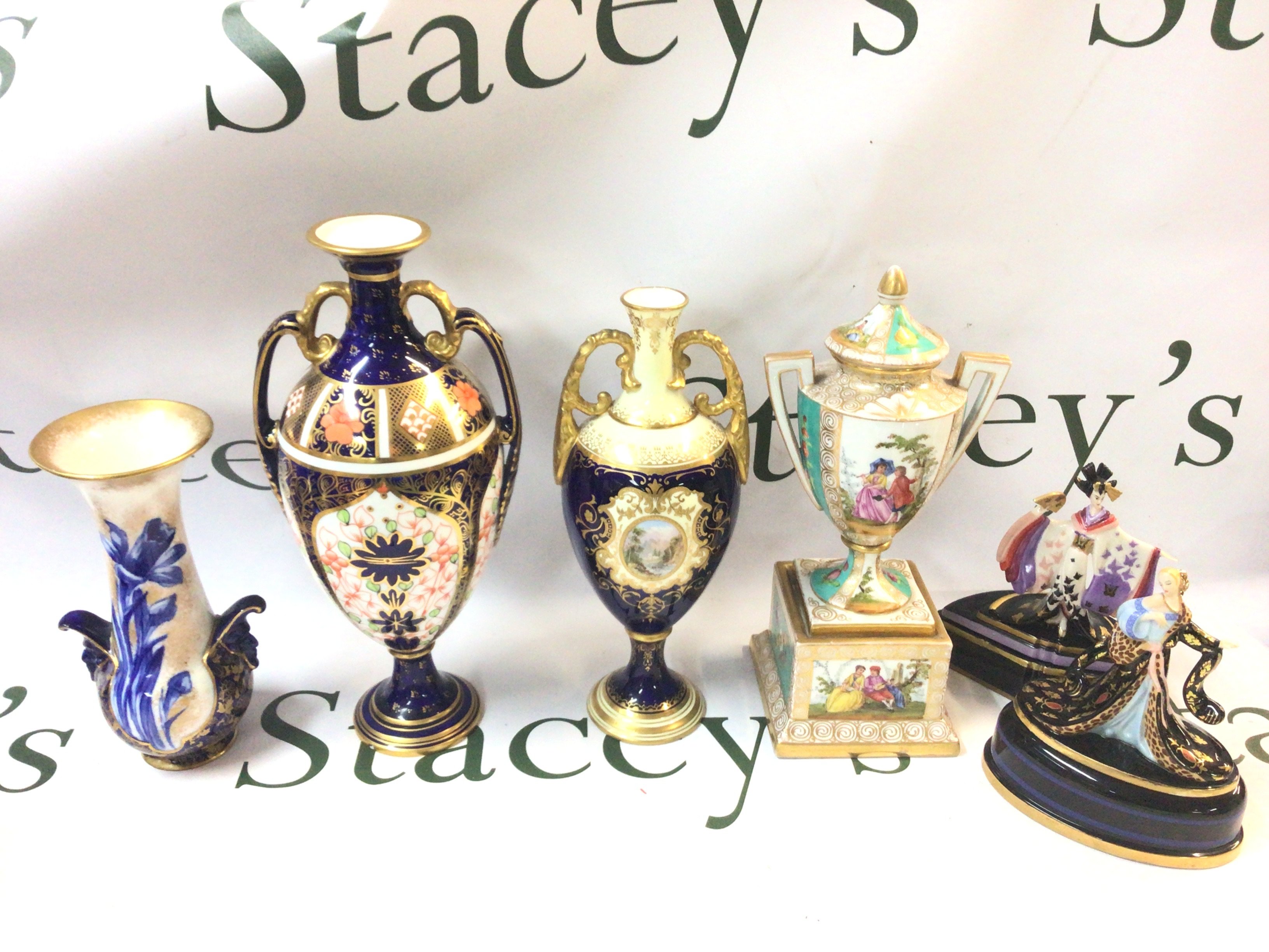 A collection of vases including Royal Crown Derby, Coalport twin handled vase decorated with painted nature scenes , Royal Doulton Iris vase & House of Erte Franklin Mint figures, 12 to 23cm tall. Some damage