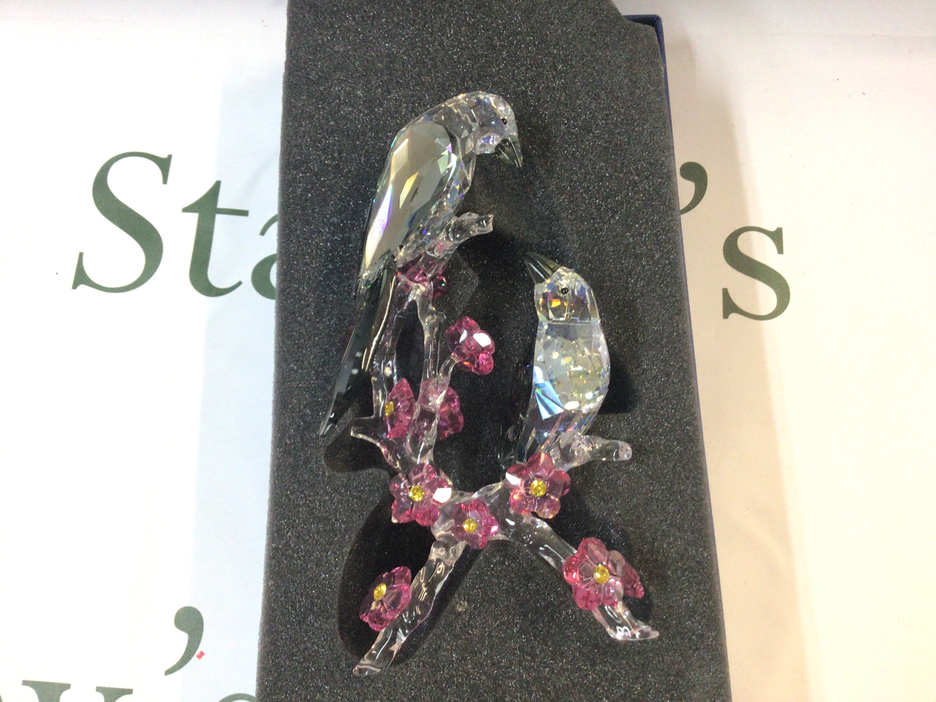 Swarovski Crystal glass figure group, Tutelary Spirit Loving Magpies. Incomplete box. 18cm tall. This lot cannot be posted