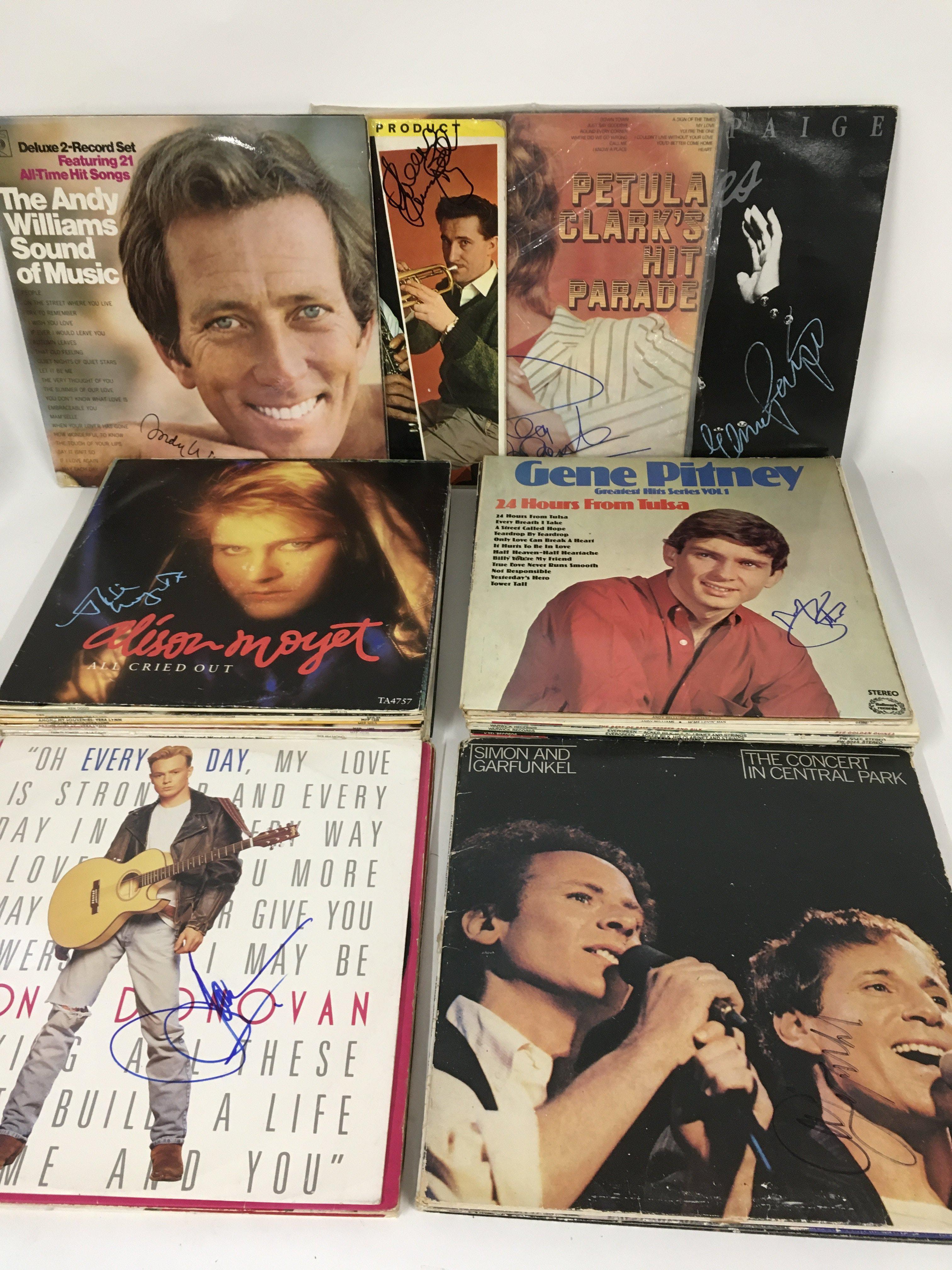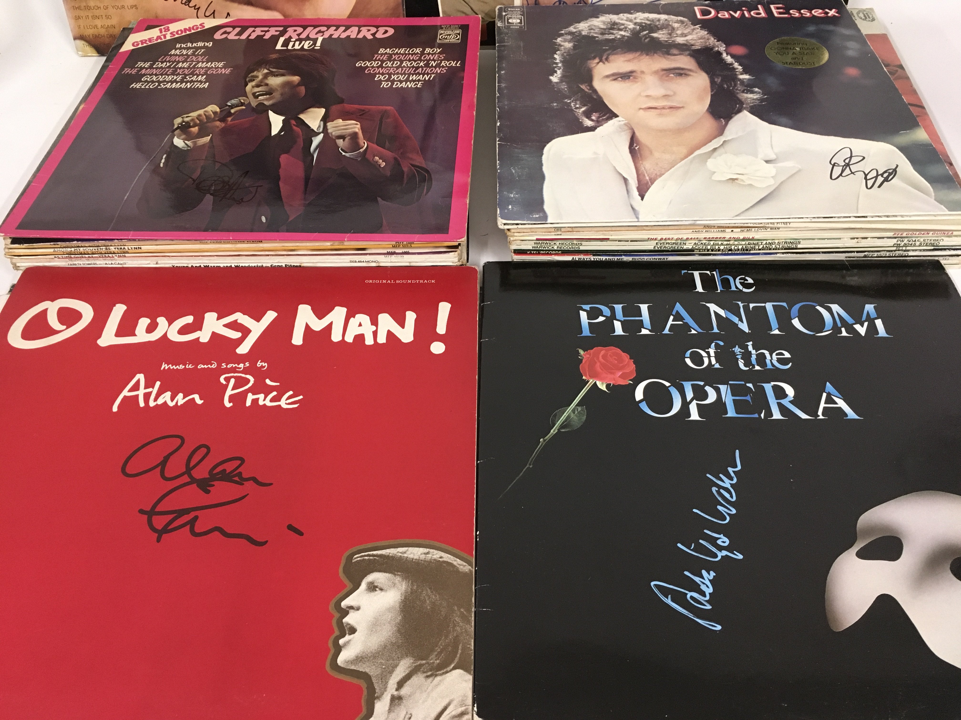A collection of signed LPs by various artists including Art Garfunkel, Alison Moyet, Cliff Richard, Jason Donovan, David Essex, Andrew Lloyd Webber and others.