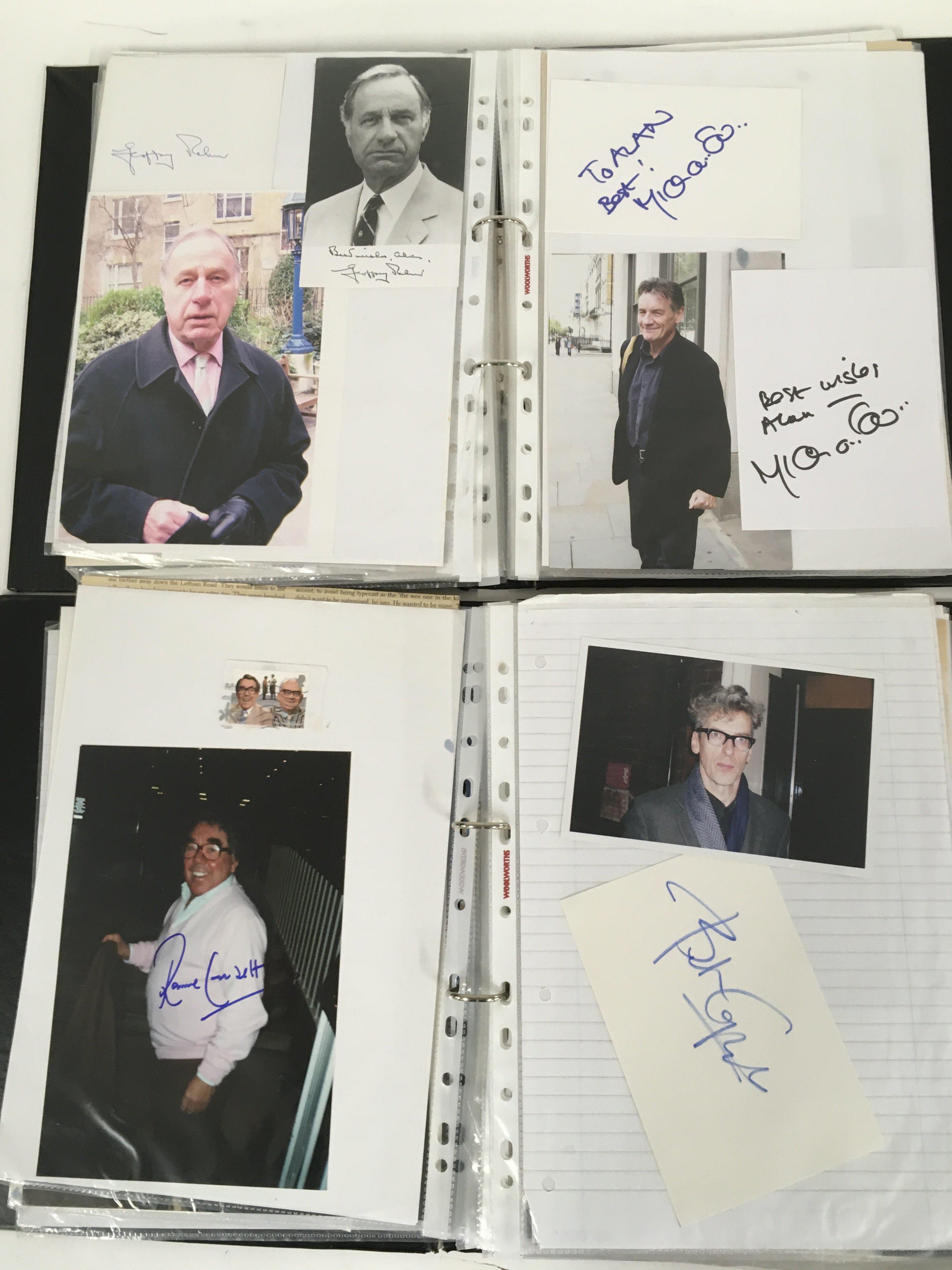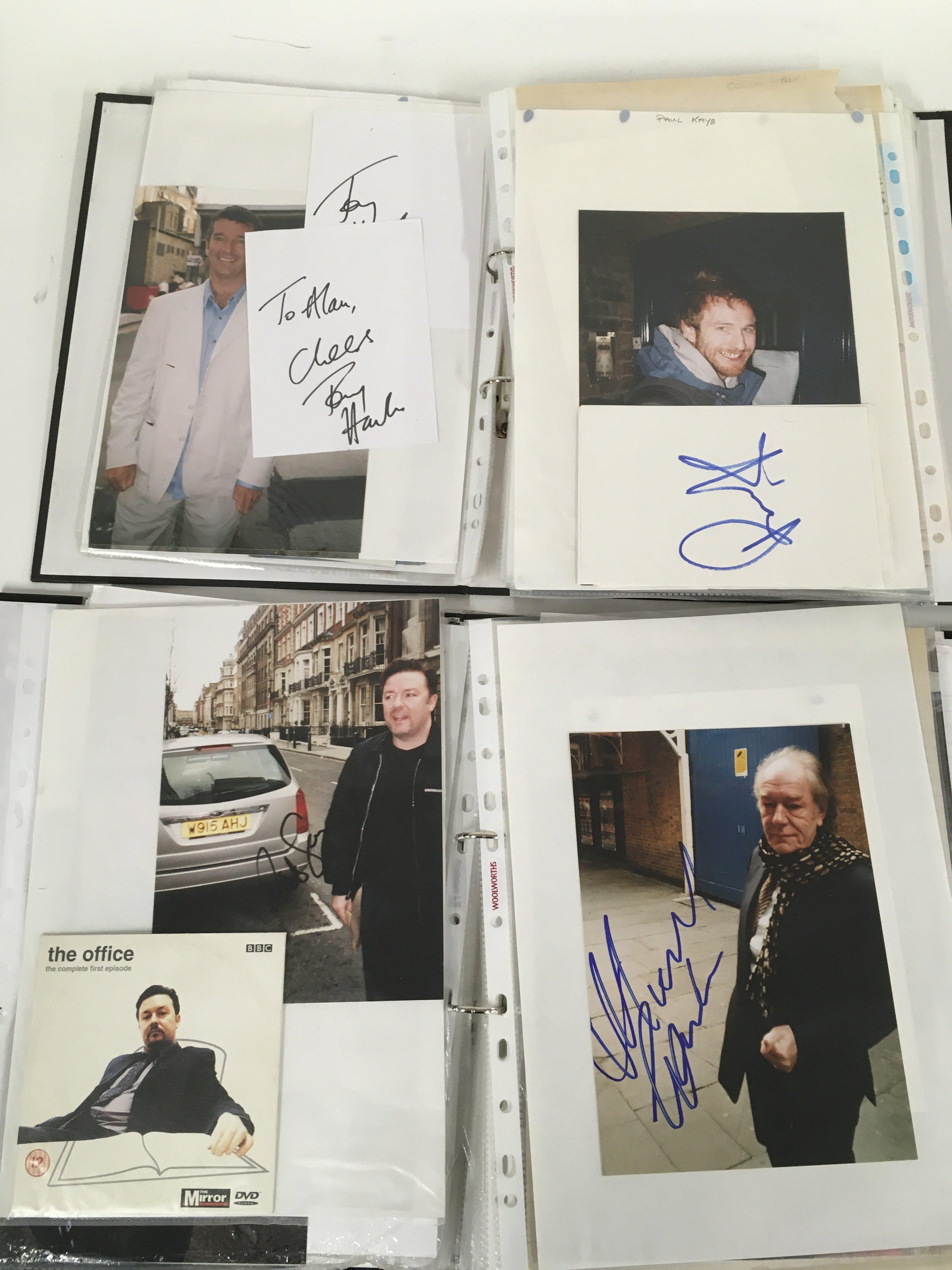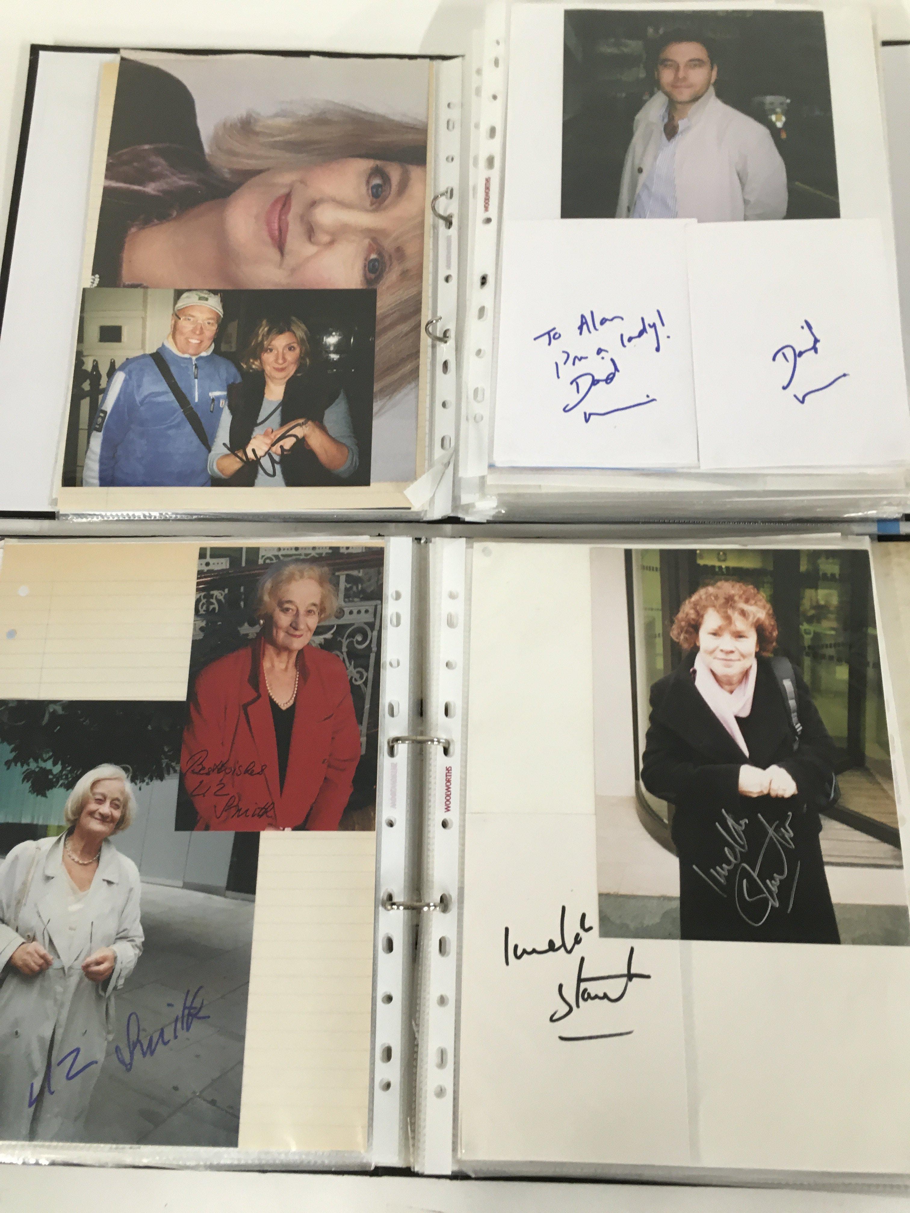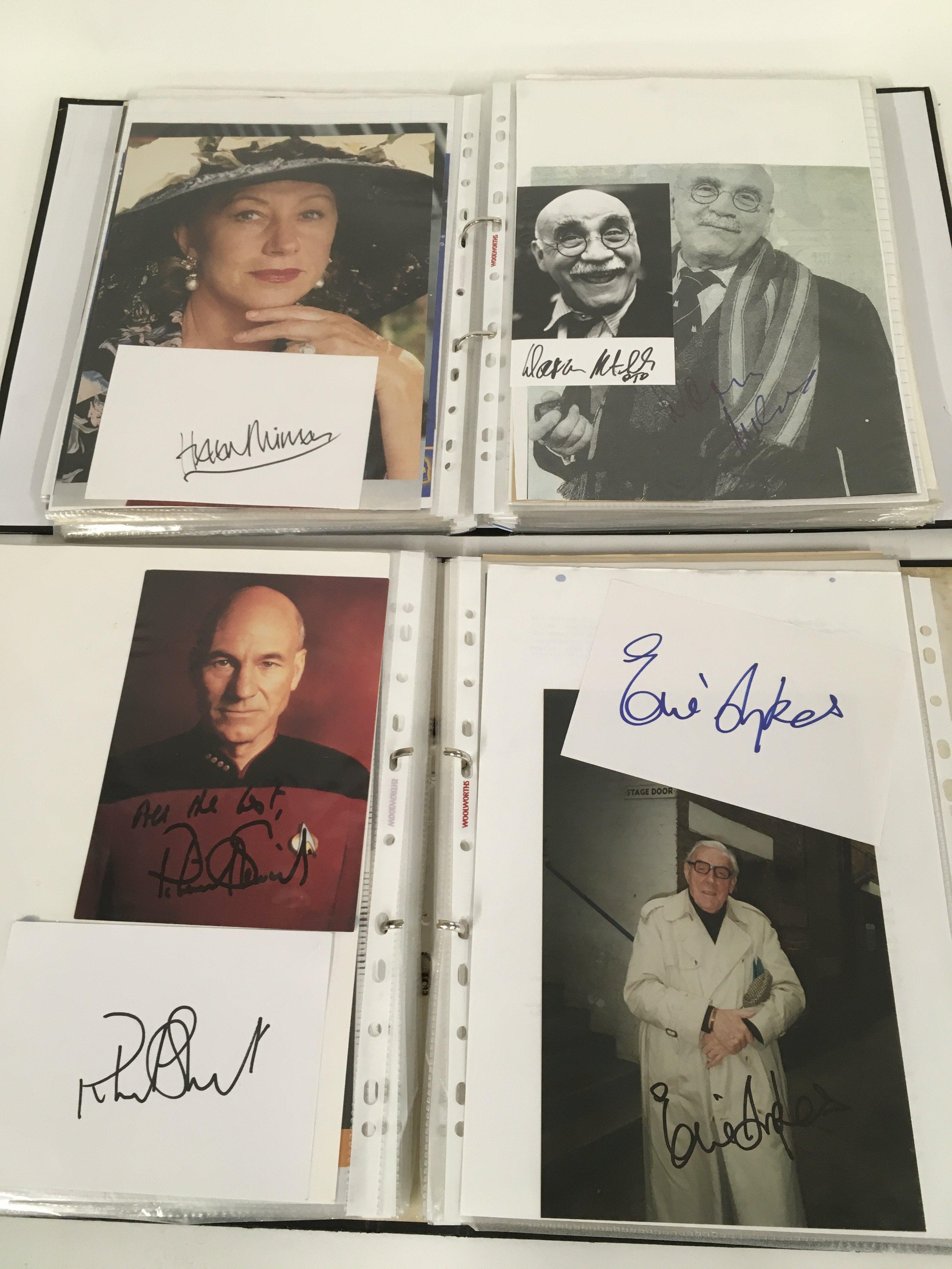 A box of 9 binders of autographs of actors and entertainers comprising Maggie Smith, Diana Rigg, Allan Rickman, Christopher Lee, Rik Mayall, Eric Sykes, Patrick Stewart, Helen Mirren, Martin Sheen, Ricky Gervais, Victoria Wood, Michael Palin, Richard Briers, Sean Bean and many more.