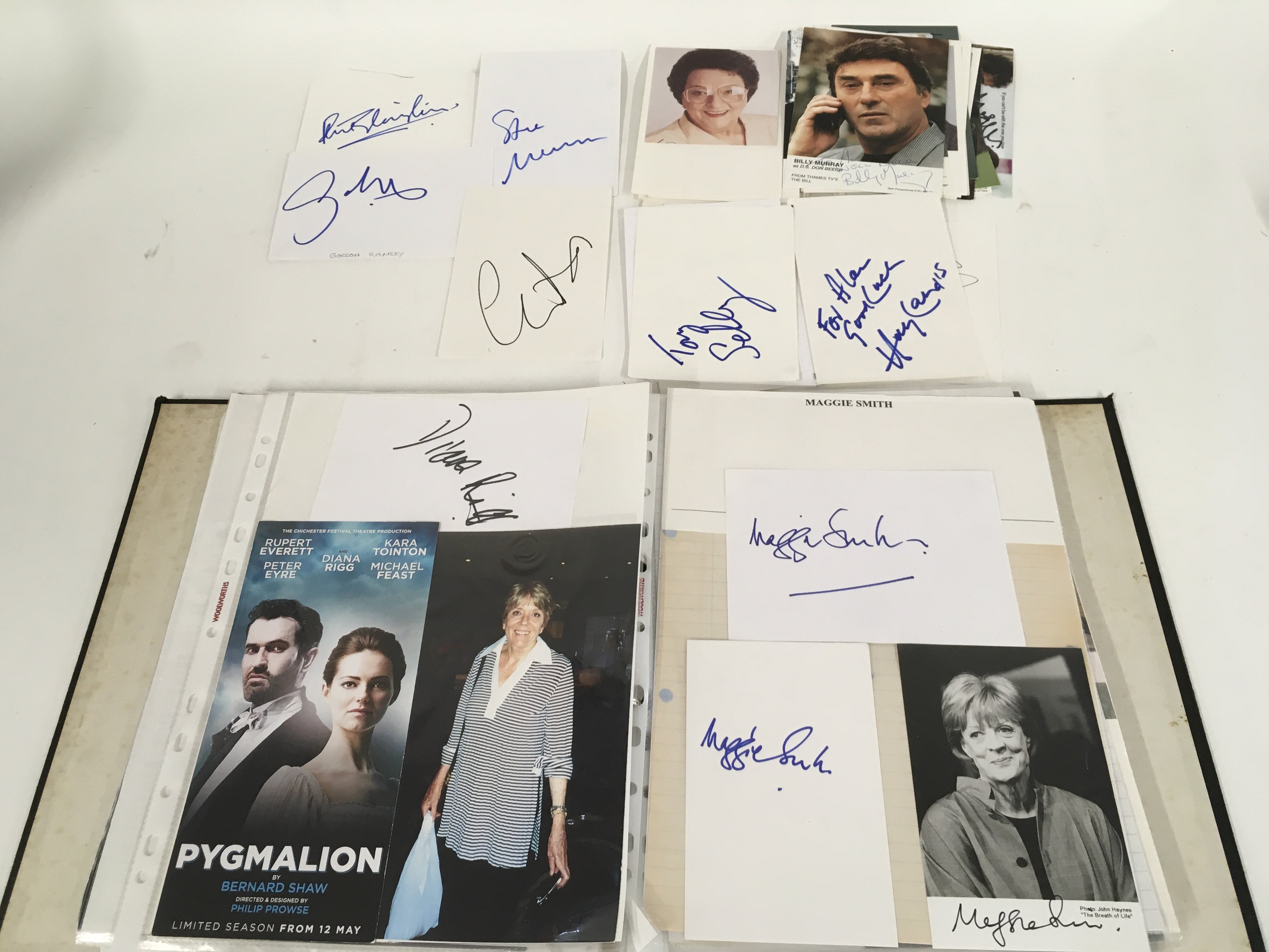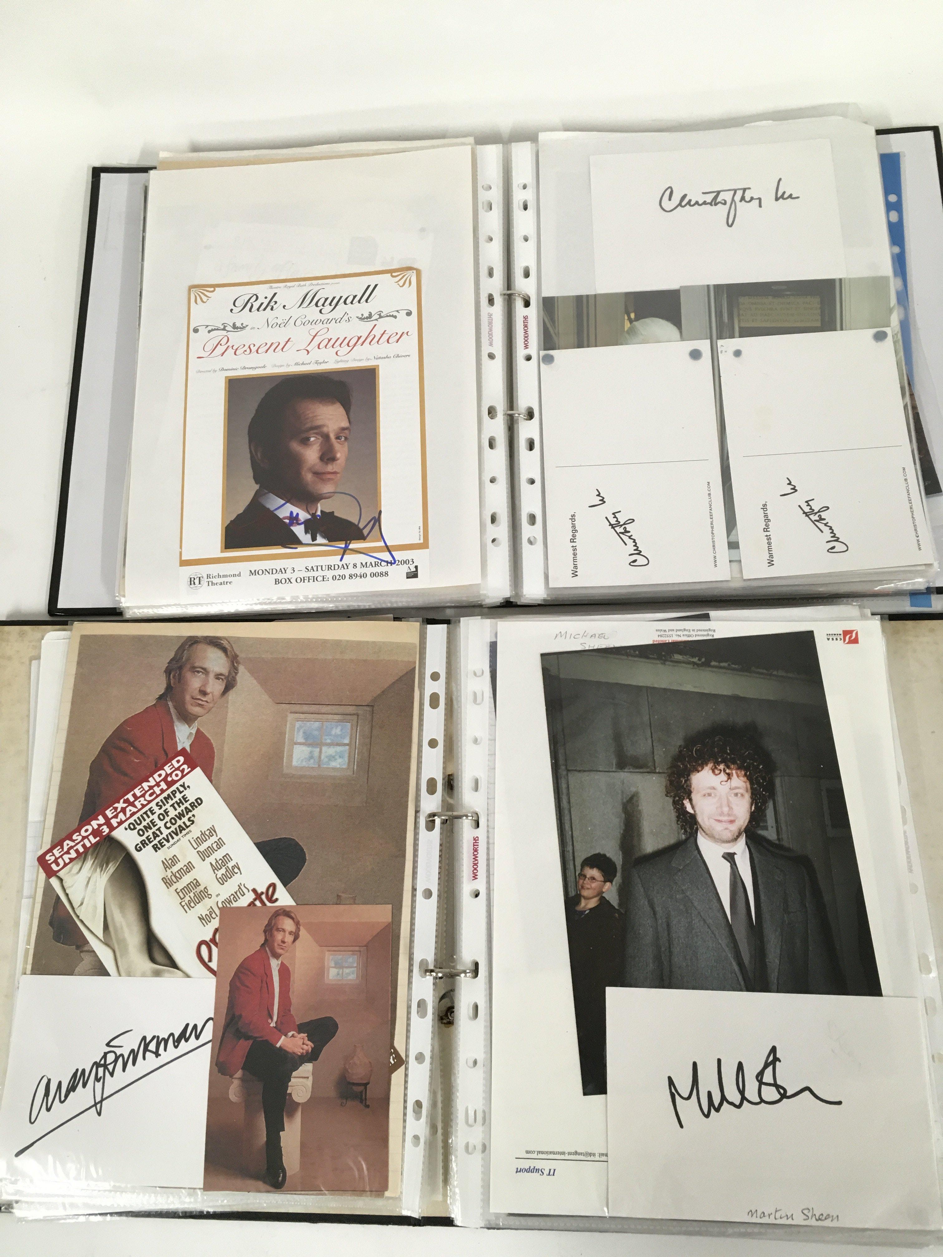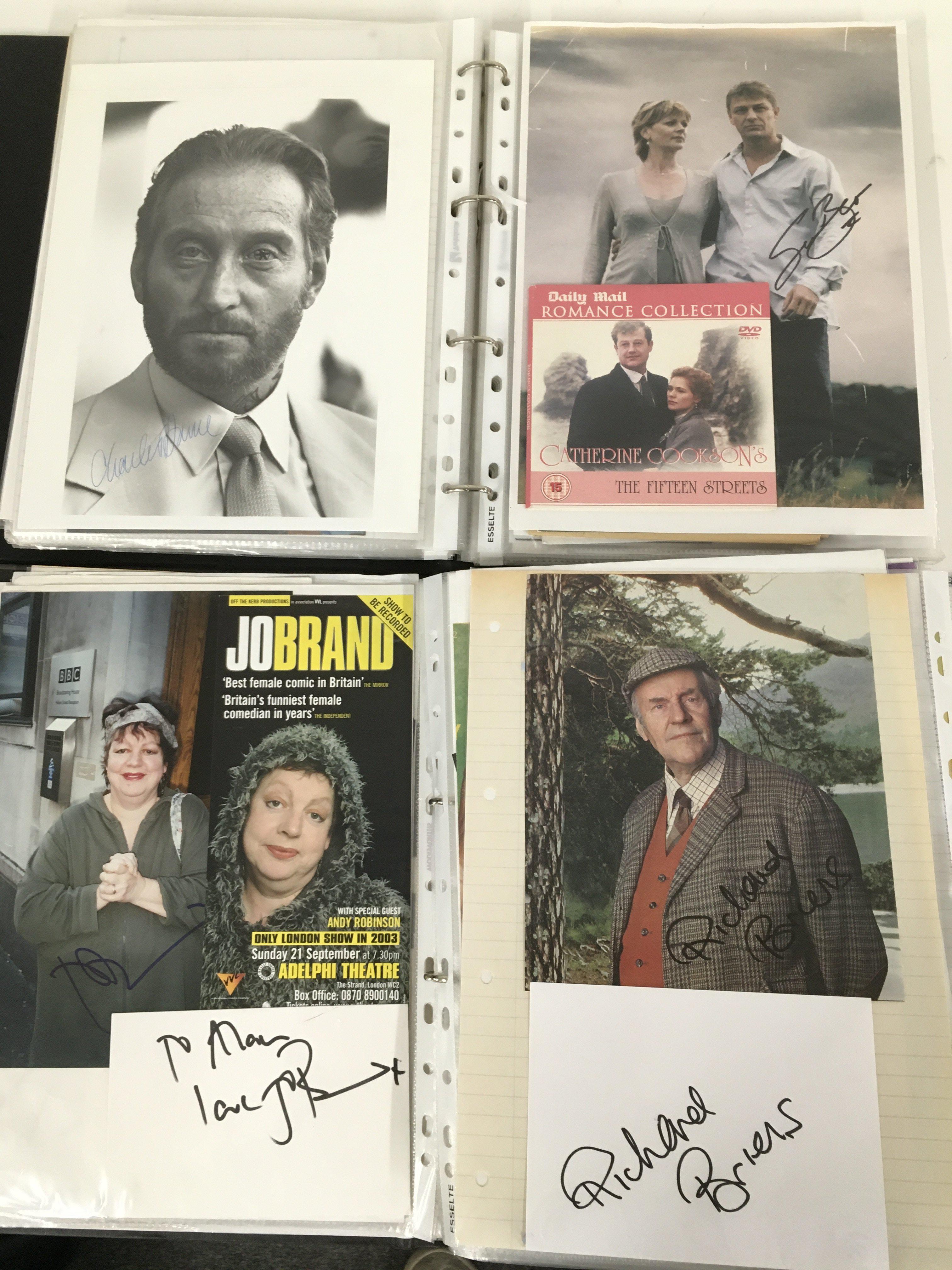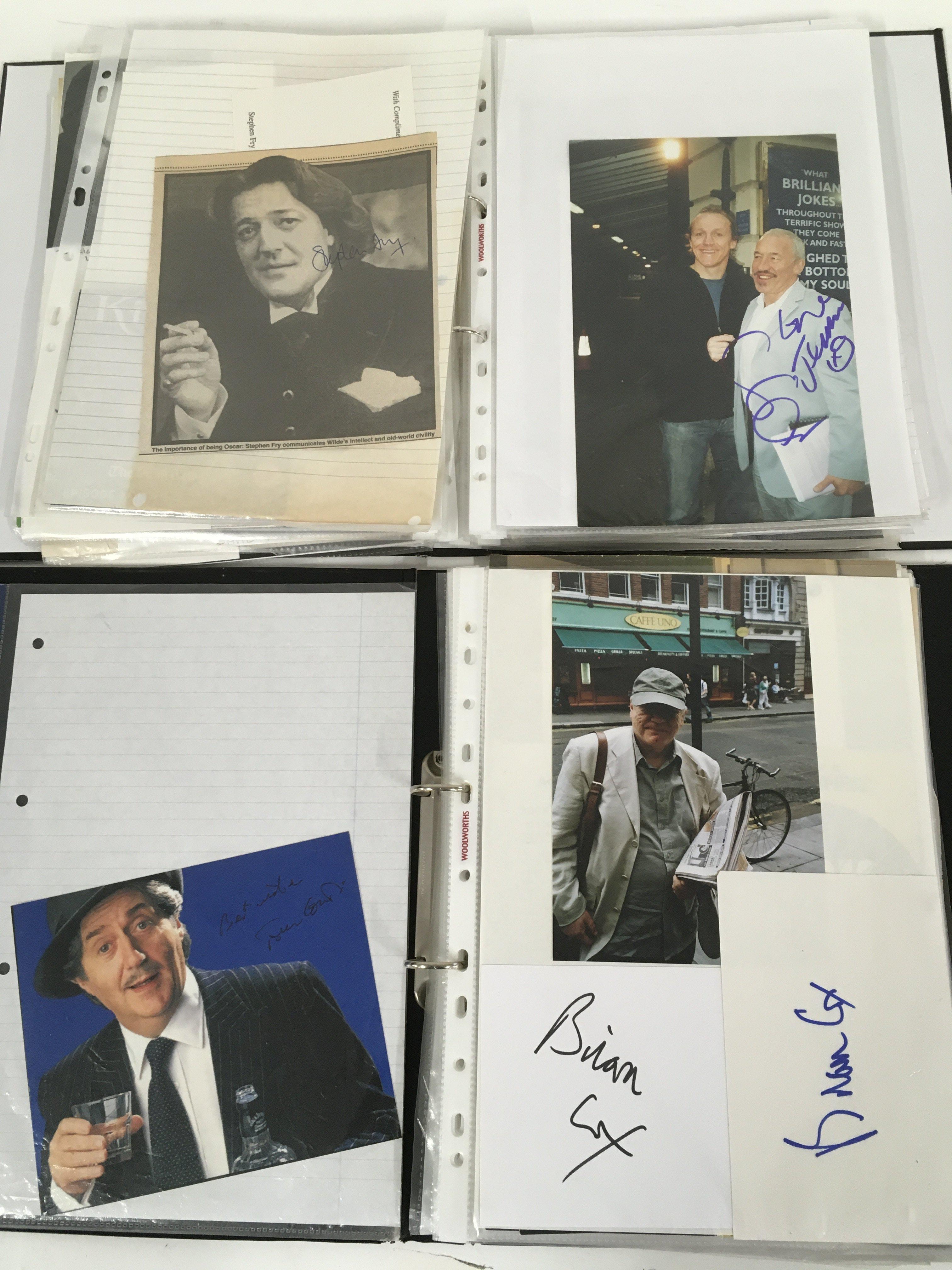 A box of 9 binders of autographs of actors and entertainers comprising Maggie Smith, Diana Rigg, Allan Rickman, Christopher Lee, Rik Mayall, Eric Sykes, Patrick Stewart, Helen Mirren, Martin Sheen, Ricky Gervais, Victoria Wood, Michael Palin, Richard Briers, Sean Bean and many more.