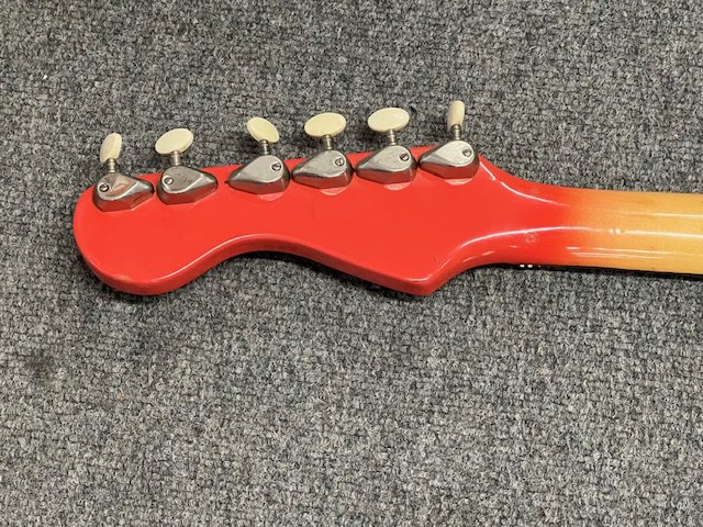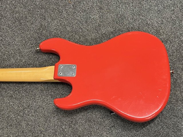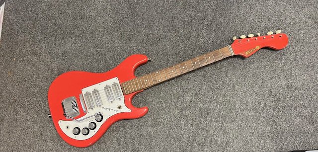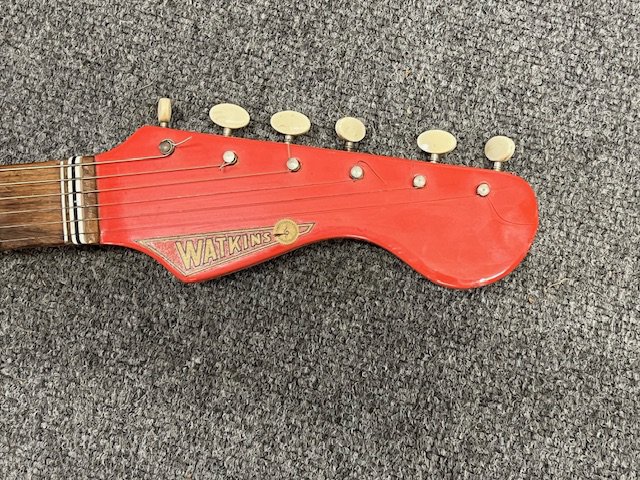 An all original 1963 Watkins Rapier 44 - the top of the line in the Rapier models the 44 having 4 foil toaster type pickups. This is in all original condition with larger 1962 to1963 Hi Lo Badge on the HiLo fulcrum blade vibrato. Arm still in place. Original pickups, parts, controls bright work. Teardrop backed Van Gent Tuners and triangular gold Watkins Treble Clef decal on the headstock. All original finish with nice patina but no evidence of heavy playwear. Some edge wear in the form of damage to the upper lower edge to lower body otherwise fine . A very nice early 1960s British Beat Boom era in very good + condition for its age. No Case