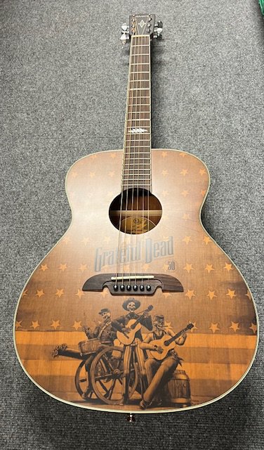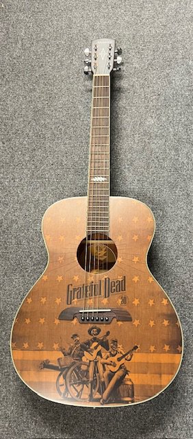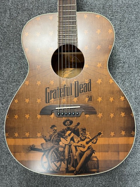 An Alvarez GDF 1965 1122 Grateful Dead Themed Limited Edition Acoustic Guitar - OM Size body with Grateful Dead Themed Graphics - in mint as new condition. Still in original packaging with no evidence of any real playwear.