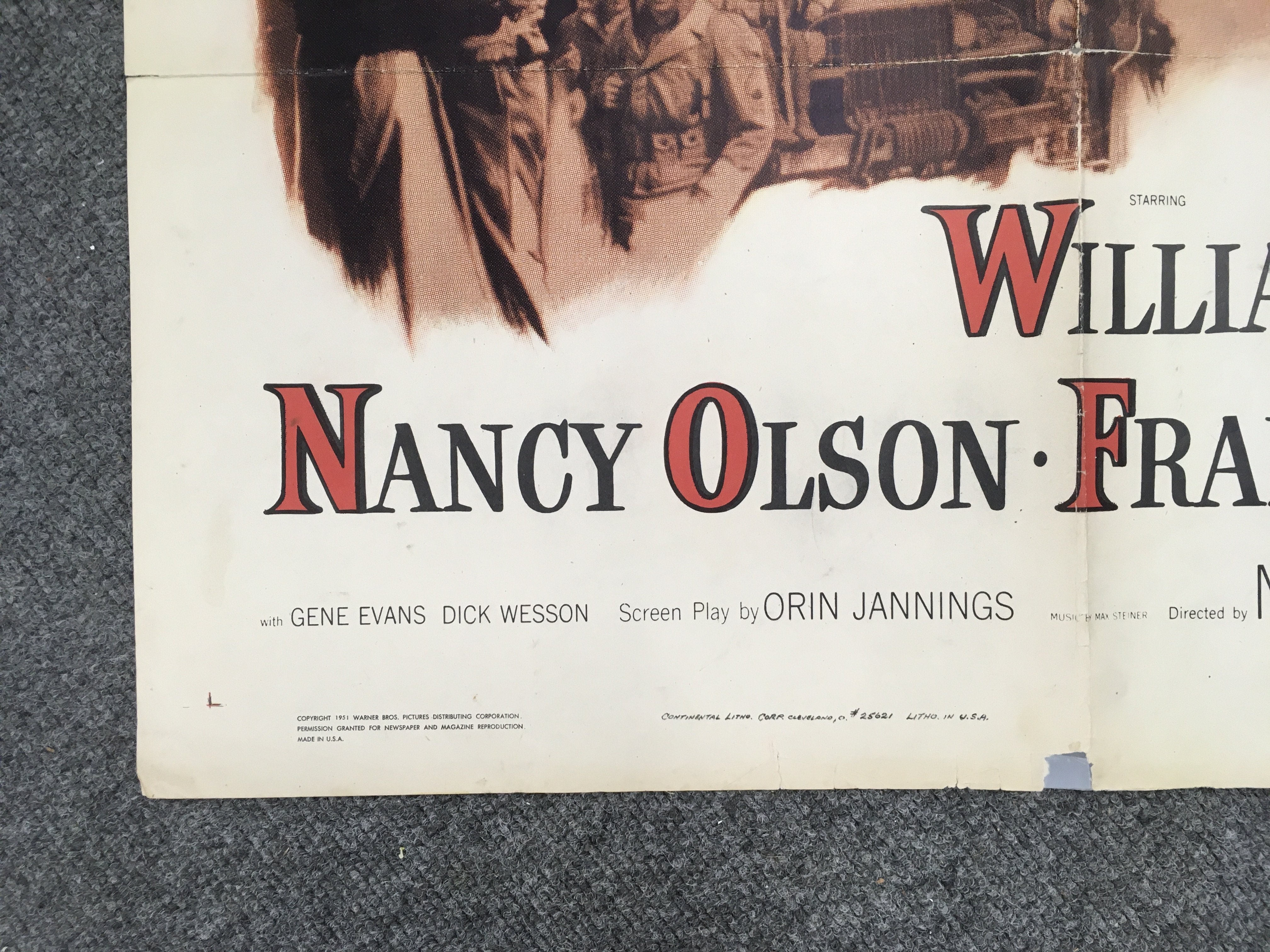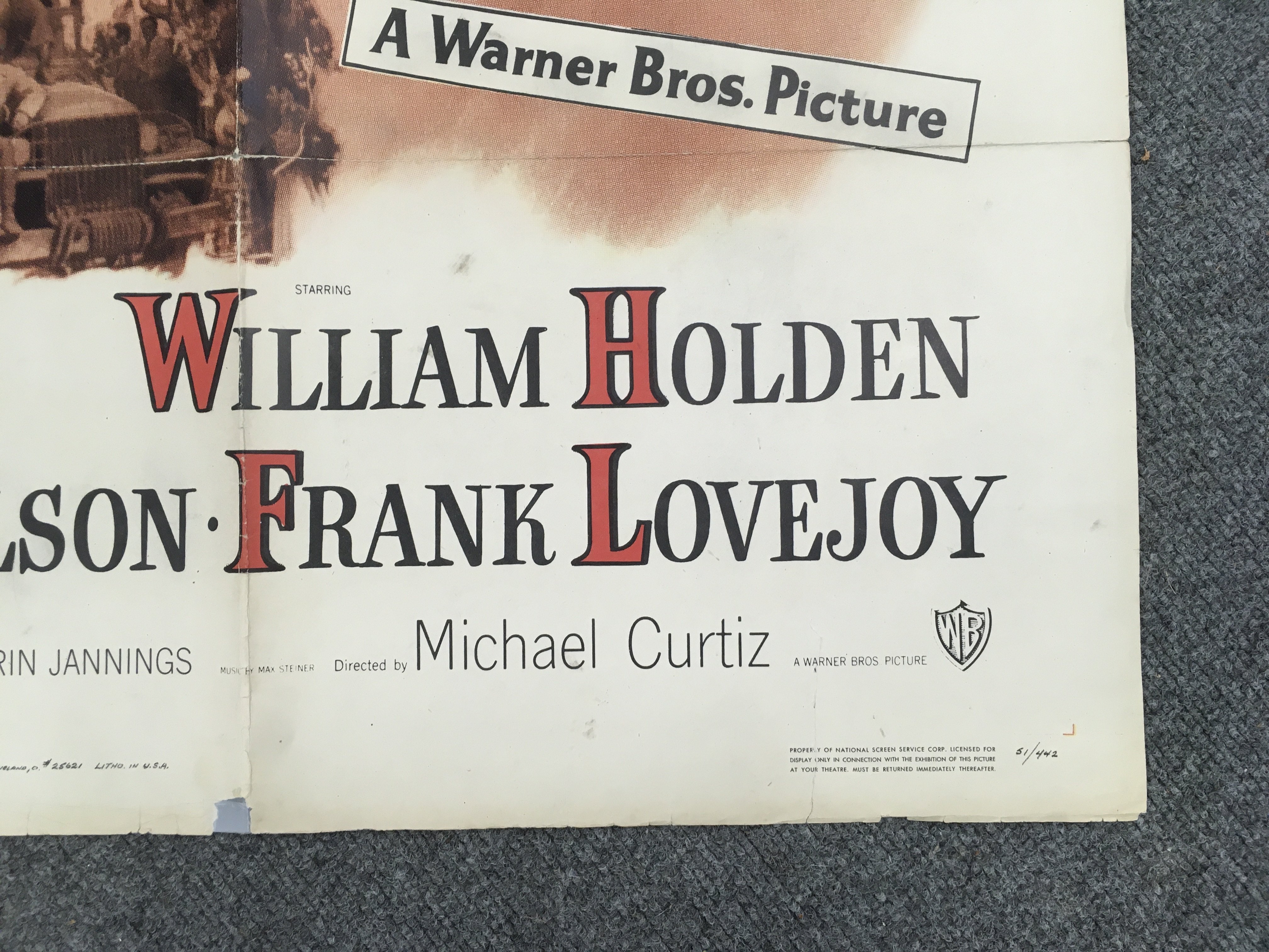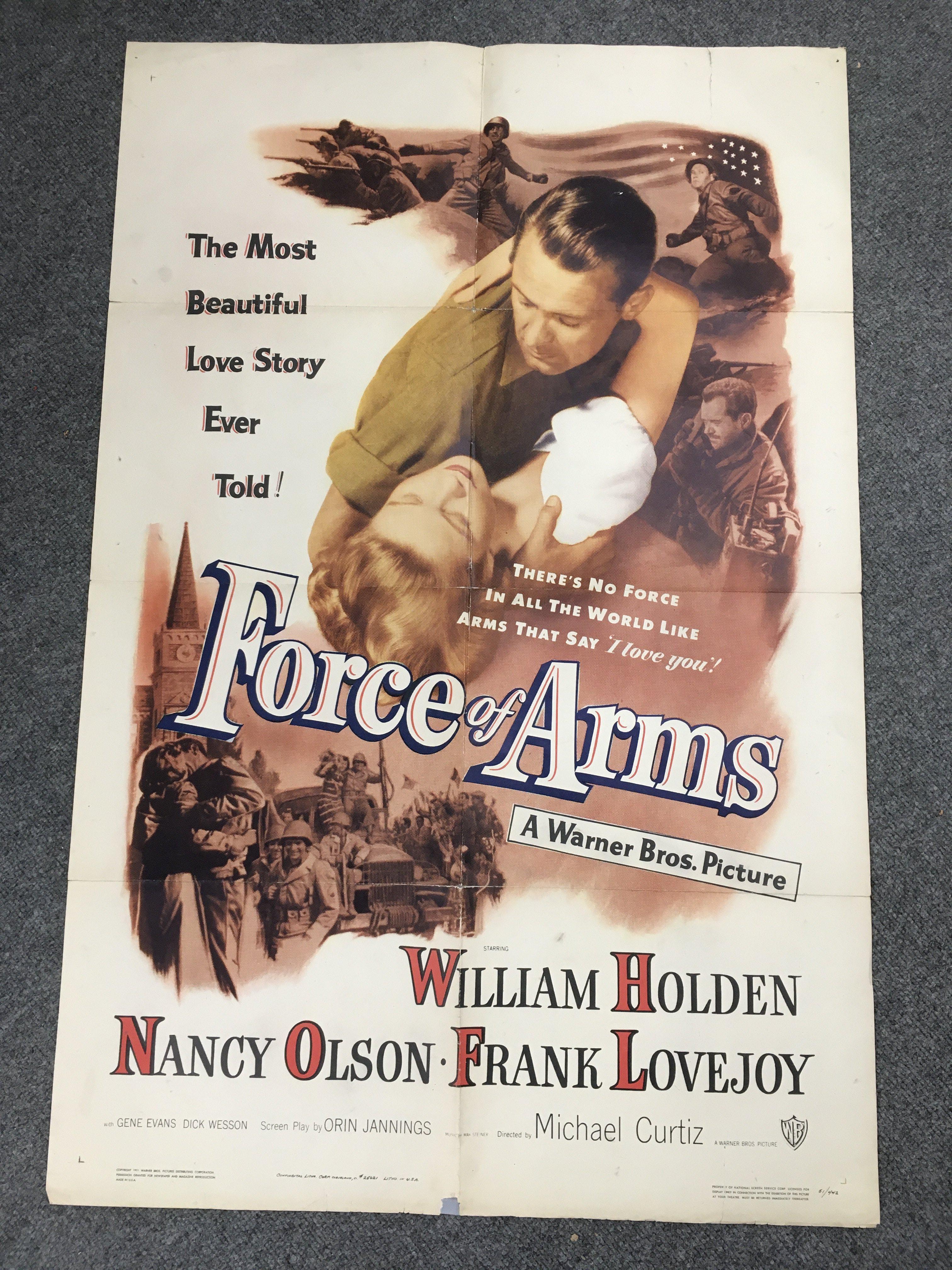 Four movie posters comprising Force Of Arms approx 68cm x 104cm, Bad Men Of Missouri approx 68cm x 103cm, Savage Frontier approx 68cm x 104cm and a double feature for Hell Below Zero and Cockleshell Heroes approx 101cm x 76cm. All folded. Various condition issues.
