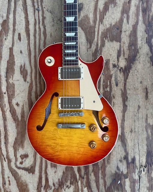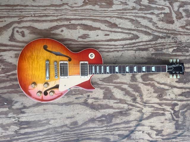 A 2015 Gibson ES Les Paul Hollow Light Burst electric guitar with flame maple top. 2 humbucker pickups - all original. These were only manufactured between 2014 -and 2015. The guitar comes with Original Brown Gibson Case and certificate in very good overall condition. Very light wear to back, light playwear overall. serial number 11465730