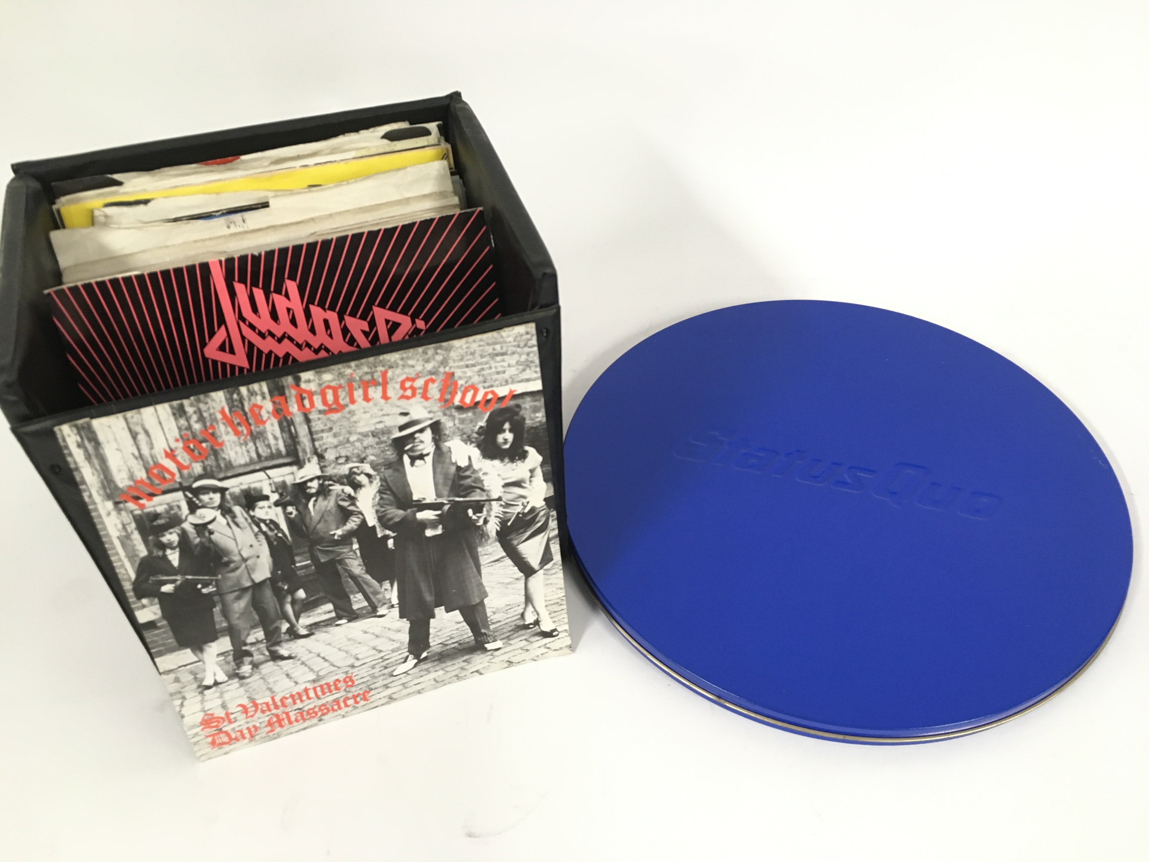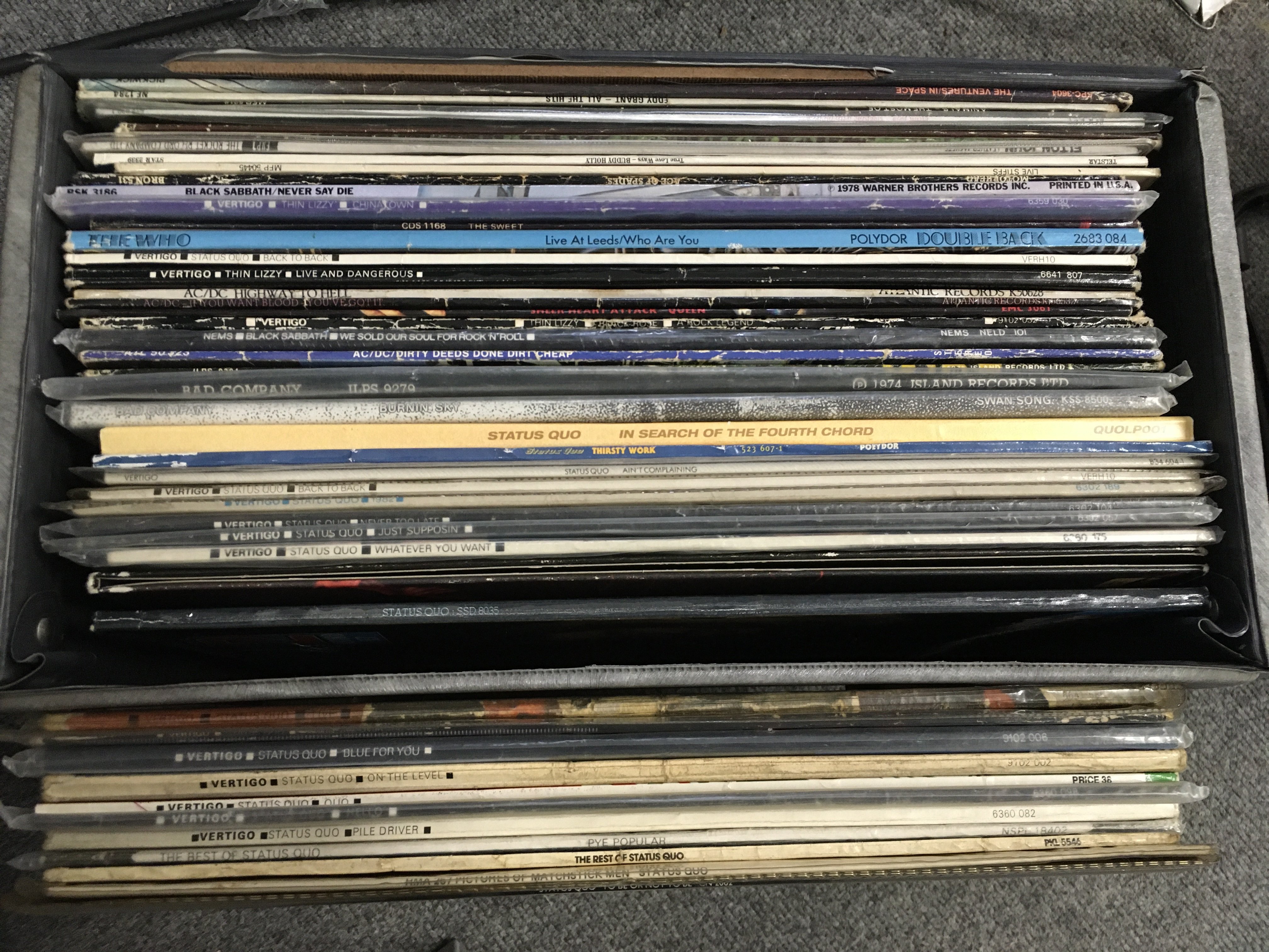 A record case and a bag of LPs and a record case of 7" singles by various artists including Black Sabbath, Thin Lizzy, Status Quo and many more,