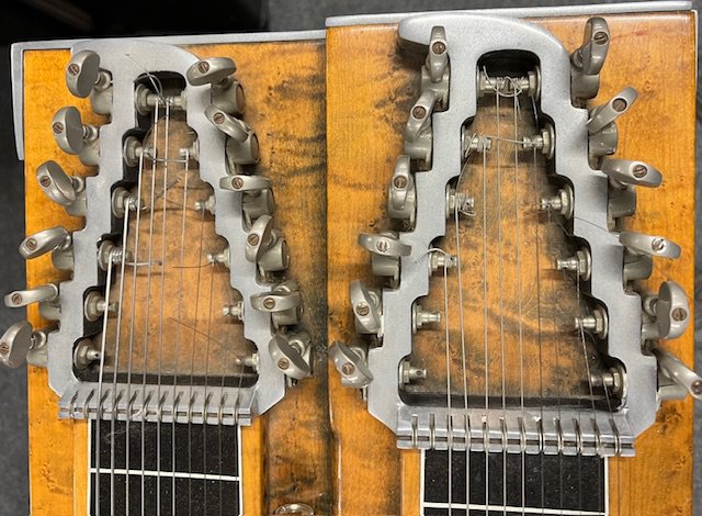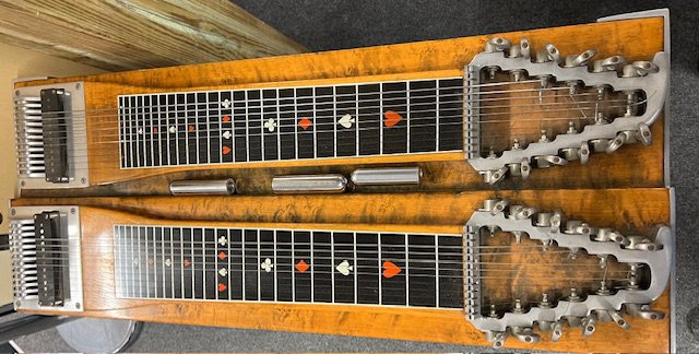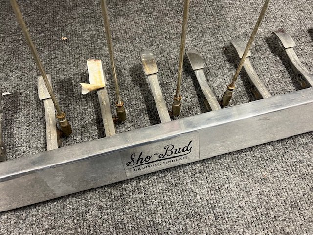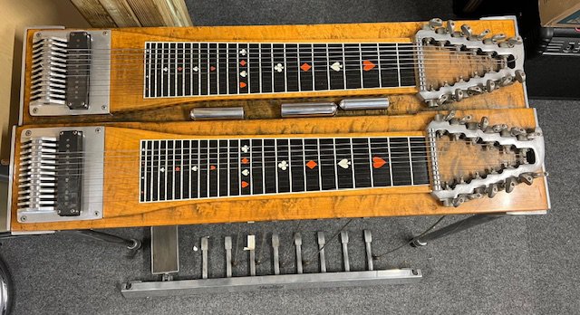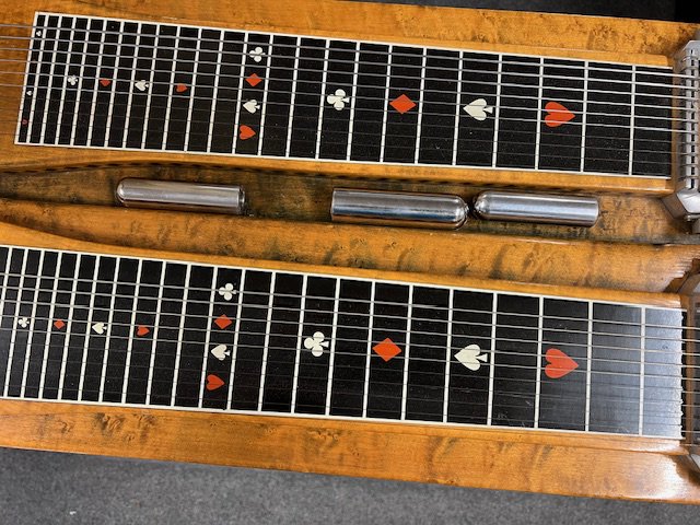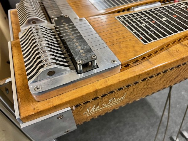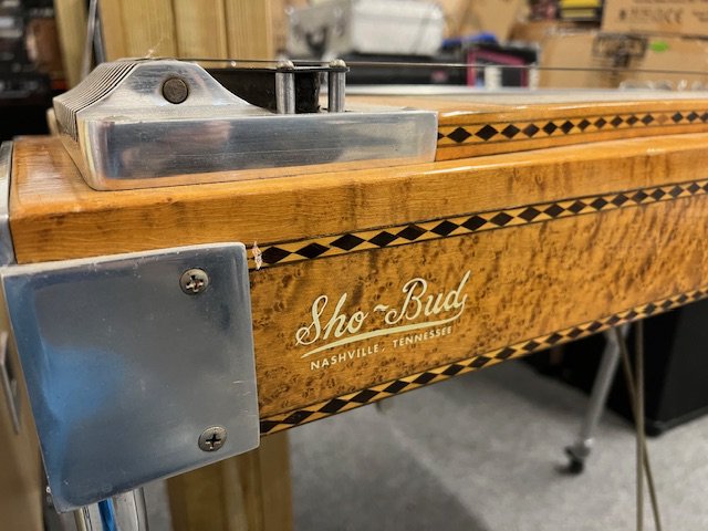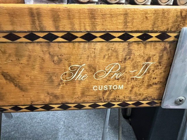 This is an all original 1970's Sho Bud Pro II Custom Pedal Steel Guitar in very good condition. It comes with a hard case and tutor books, slides and picks. Birds Eye maple veneer finish and "Gambler" pack of card design position markers. Pedal assembly in chrome with rods. This is a top of the range Nashville USA manufactured pedal steel in very good condition. Will require a restring and set up to the individual player's personal specification.