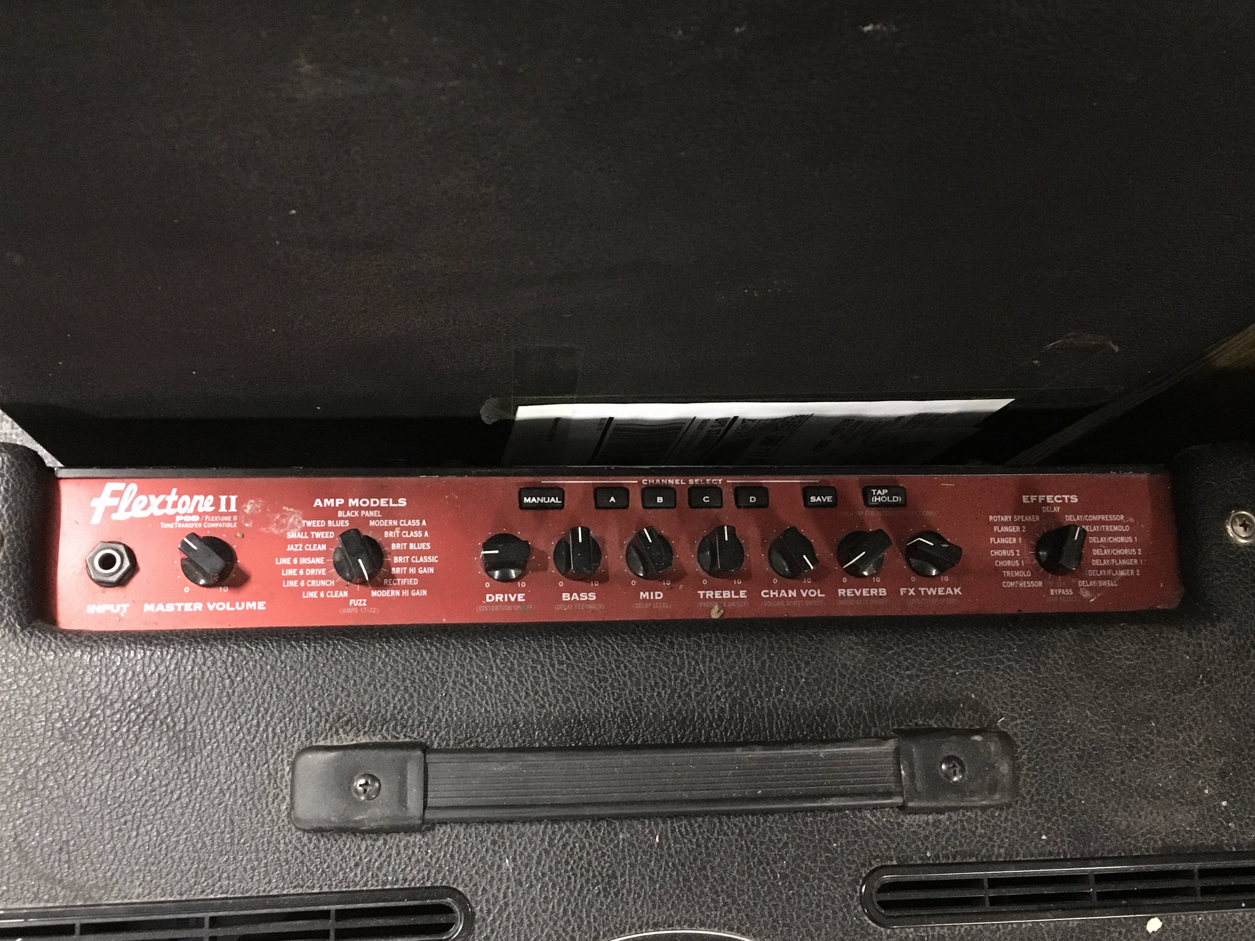 A Line 6 Flextone II plus amplified.