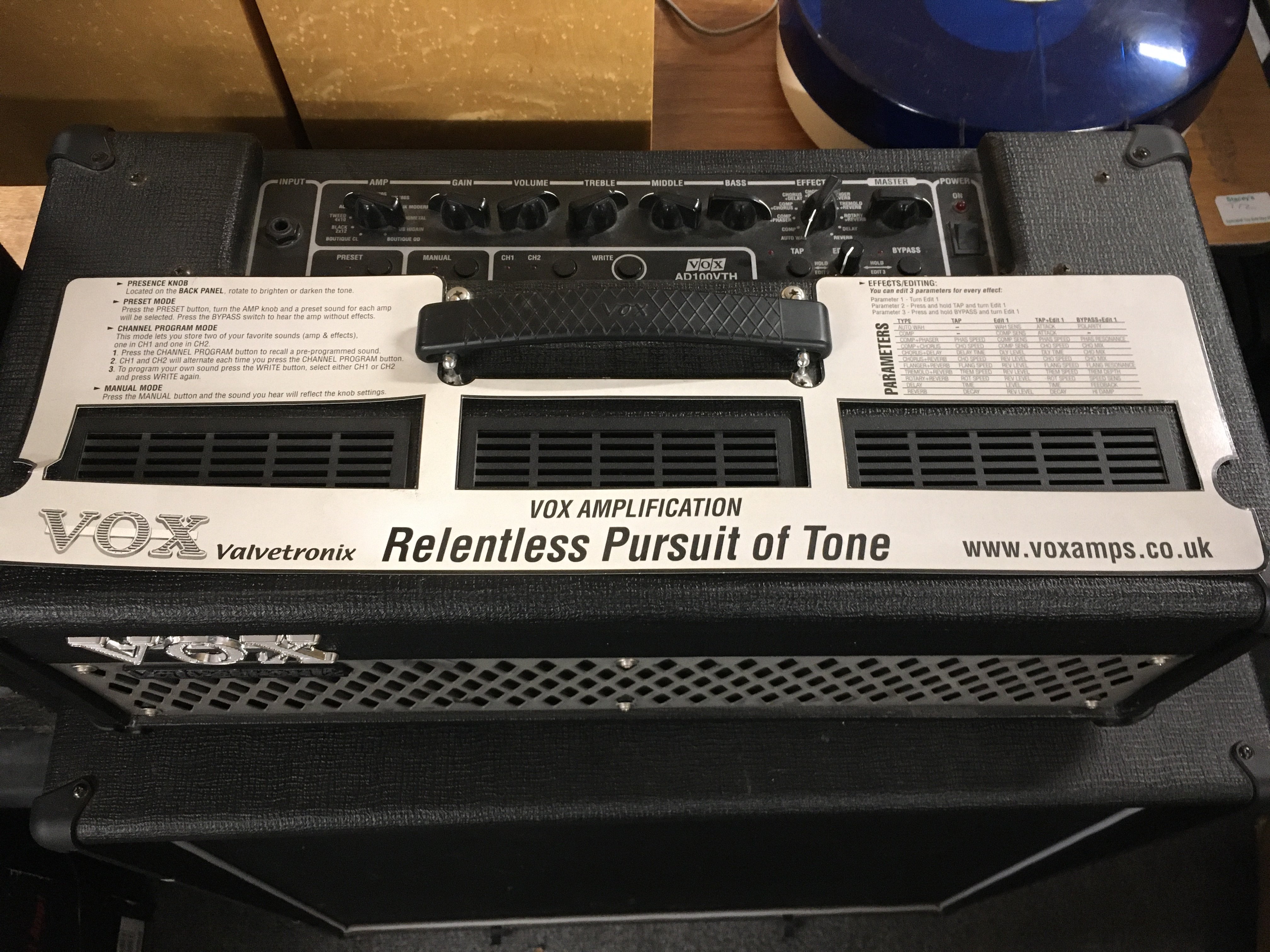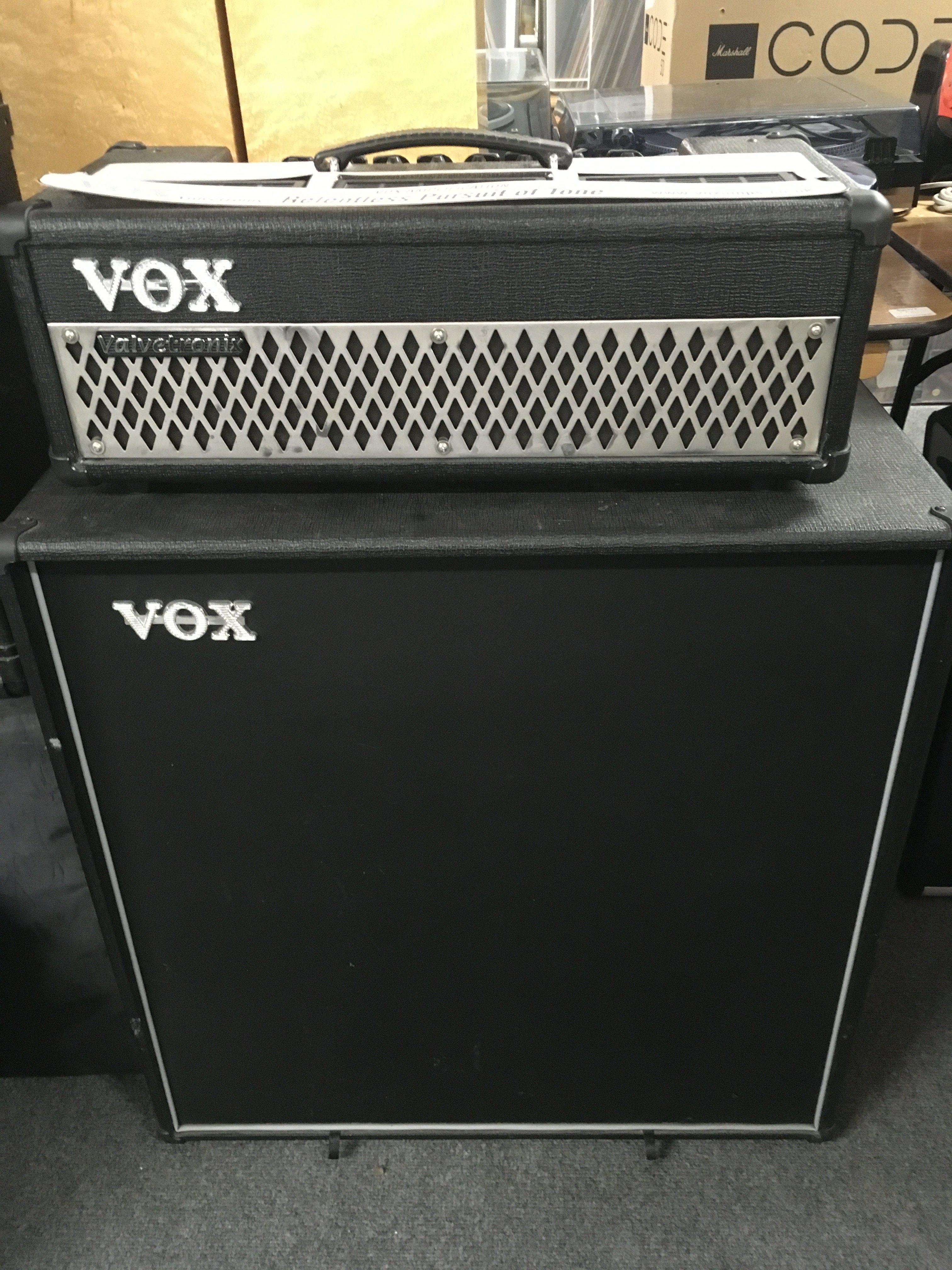 A Vox Valvetronix amp head and a Vox 412BK amplifier cabinet (2). Comes with a flight case for the head.