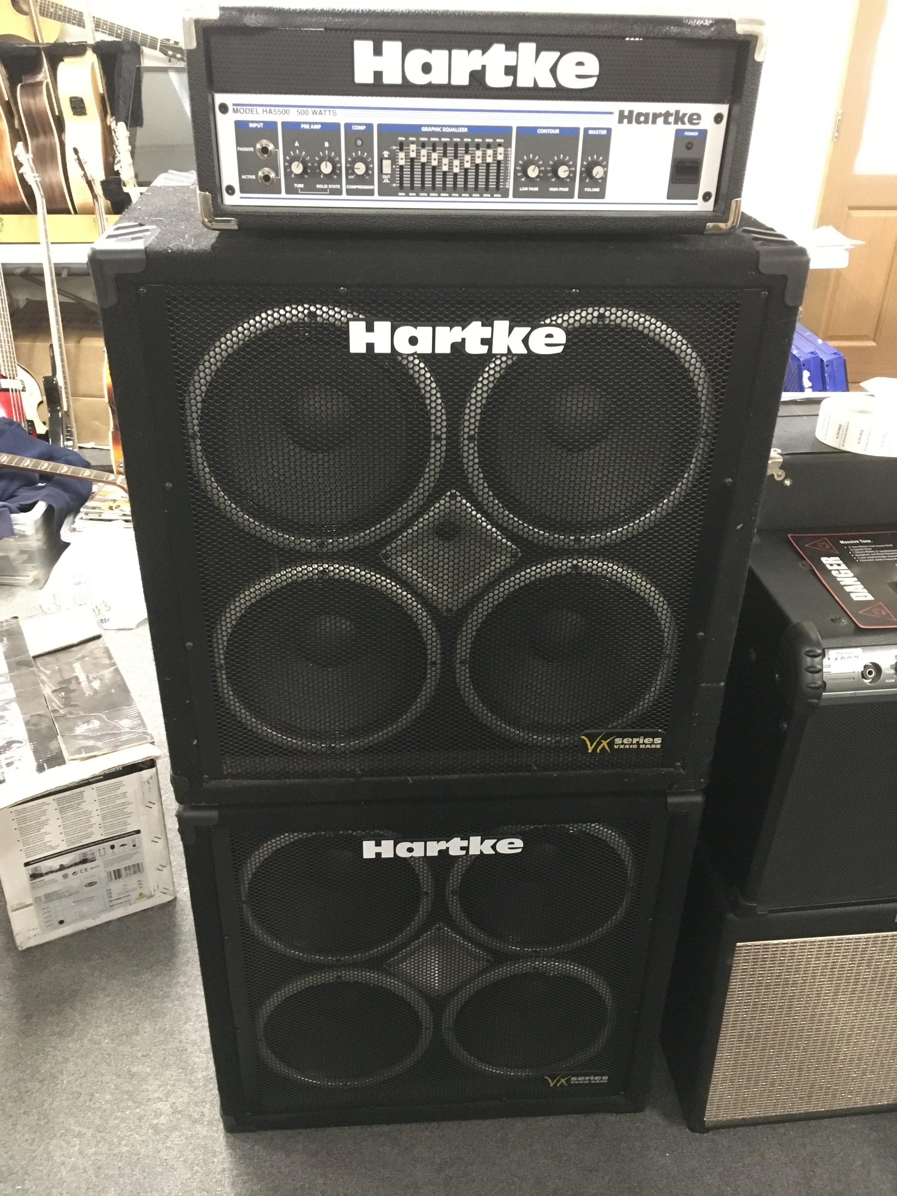 A Hartke HA5500 bass amp head and a pair of Hartke VX410 bass amp cabinets (3). Comes with a hard carry case for the head.