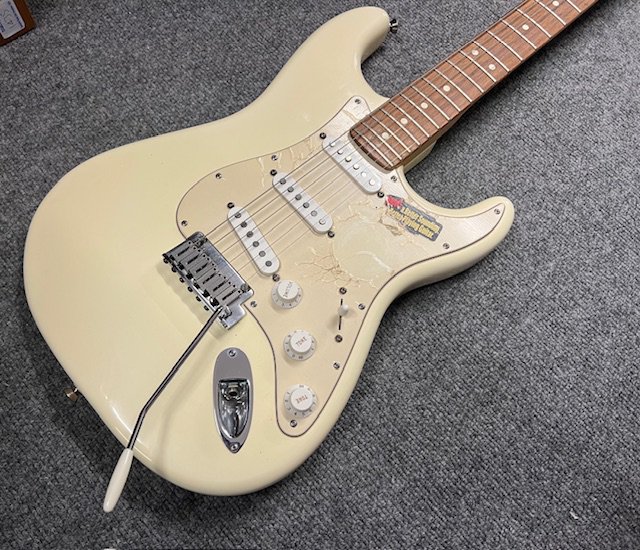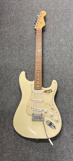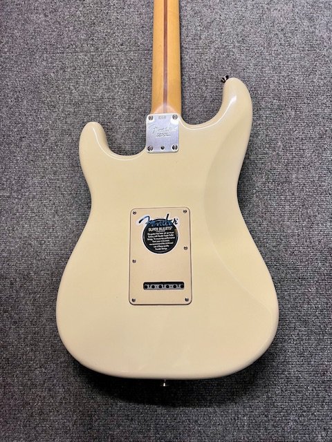 This is an unplayed 2003 Fender Stratocaster in faded Olympic White finish - cream. Rosewood board. This is a completely unplayed guitar with the plastic and store stickers still on the pickguard and trem cavity cover. Comes with its original Fender indent case and all paperwork and case candy present for a 2003 Stratocaster. Condition wise unplayed with no fretwear or evidence of any playwear marking etc.