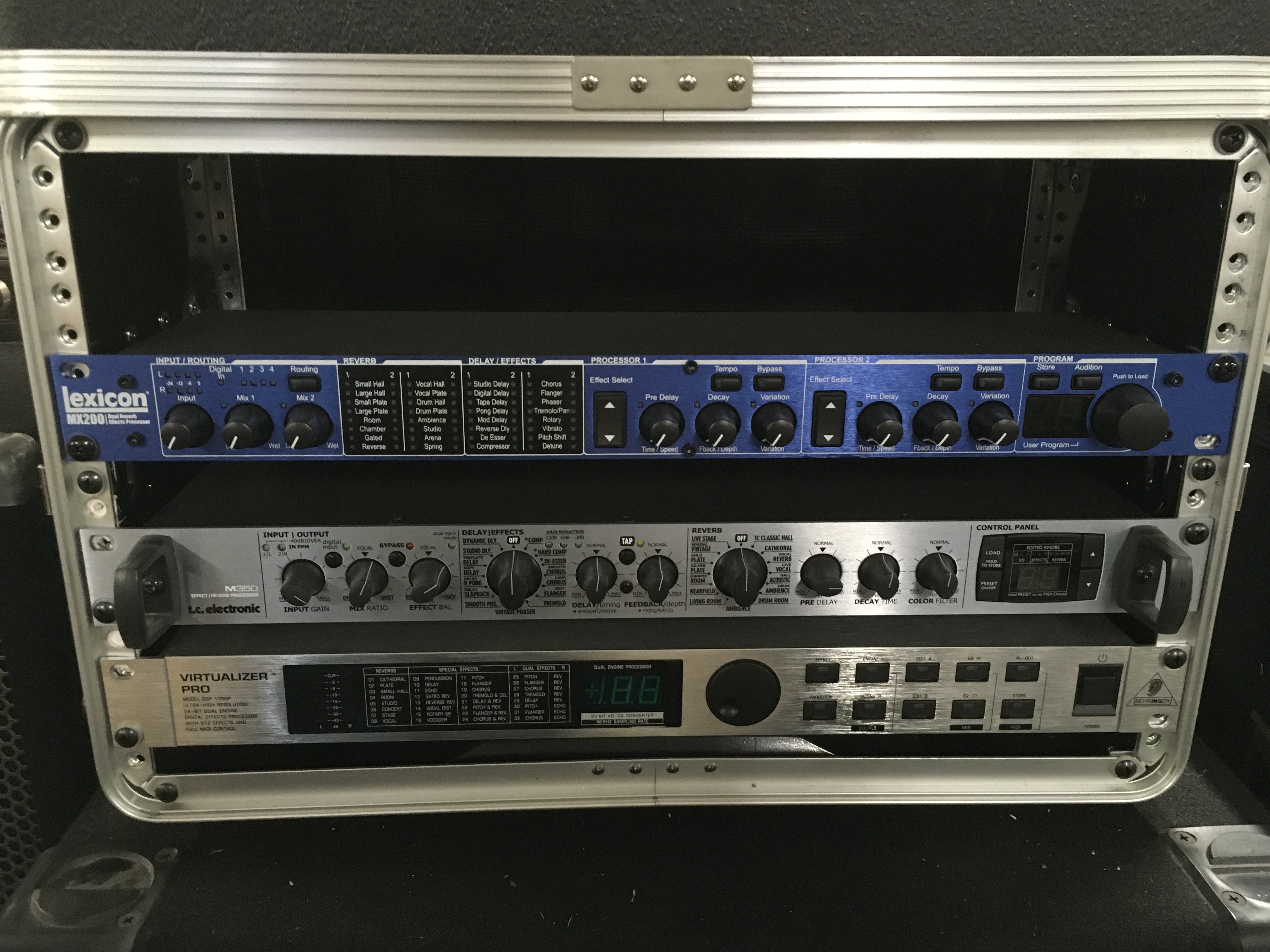 Three rack units comprising a Lexicon MX200 dual reverb effects processor, a TC Electronic M350 effect and reverb processor and a Virtualizer Pro DSP 1000P (3).