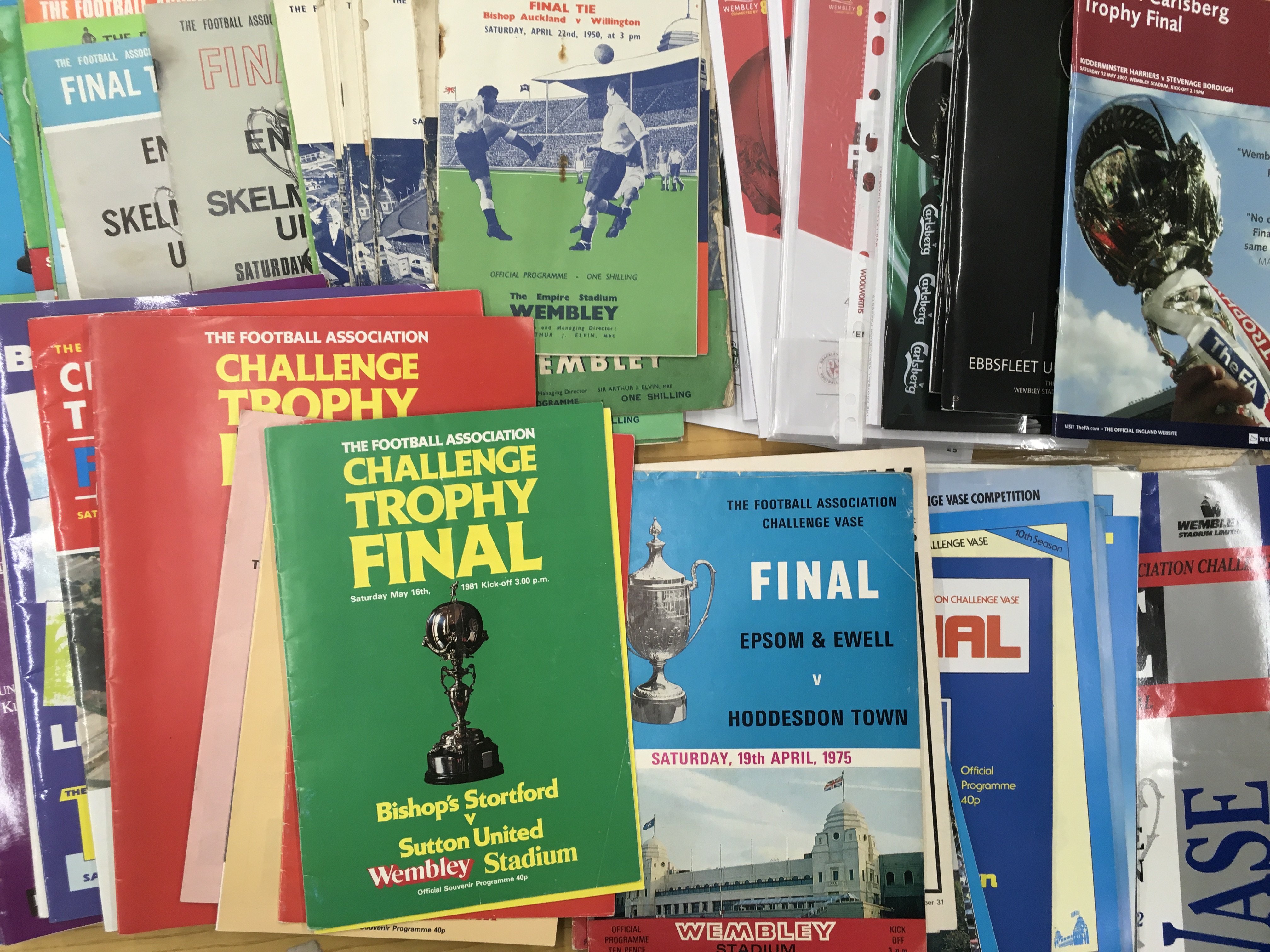 Trophy Vase + Amateur Cup Final Football Programmes: From 1950 onwards to include 23 Amateur Cup with 8 from the 50s, 43 x FA Trophy and 38 Vase. Incomplete runs but all different. Mainly good. (104)