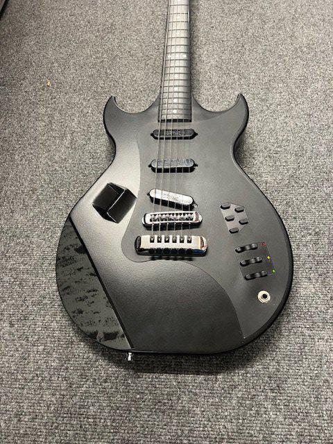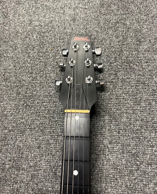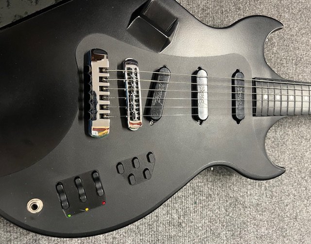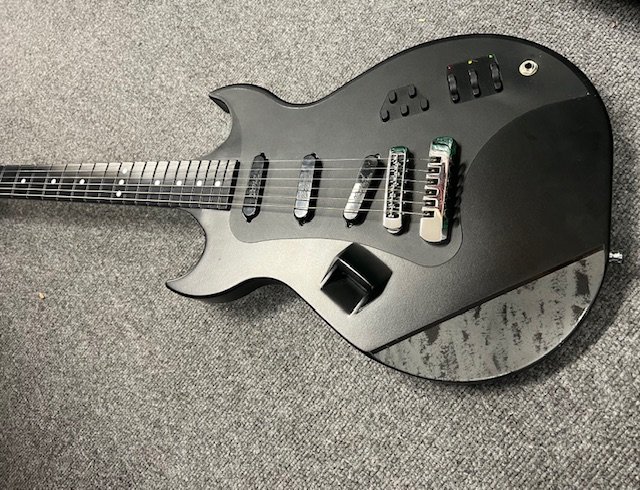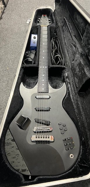 A mid 1980's Bond Electraglide electric guitar in very good condition with case and power supply. Made out of carbon fibre weighing in at around 4 kg - the most unique feature is the stepped " fretboard - no metal frets - the strings are fretted against the sawtooth ridges. Now increasingly rare especially in all original condition. Notable users of the Electraglide were Mick Jones, The Edge, Will Sergeant, John Turnbull and Dave Stewart (he's pictured with one in the 1984 Bond catalog). Ex Clash Guitarist Mick Jones is known to have used a Bond Electraglide with his band Big Audio Dynamite in the mid-1980s The Edge used his extensively on The Joshua Tree, including the solo on "One Tree Hill", as well as on "Exit," and "Mothers of the Disappeared". Will Sergeant, John Turnbull and Dave Stewart were also Electraglide users. Electrically everything works as it should including the LED display and the stepped fretboard and neck is in very good condition.