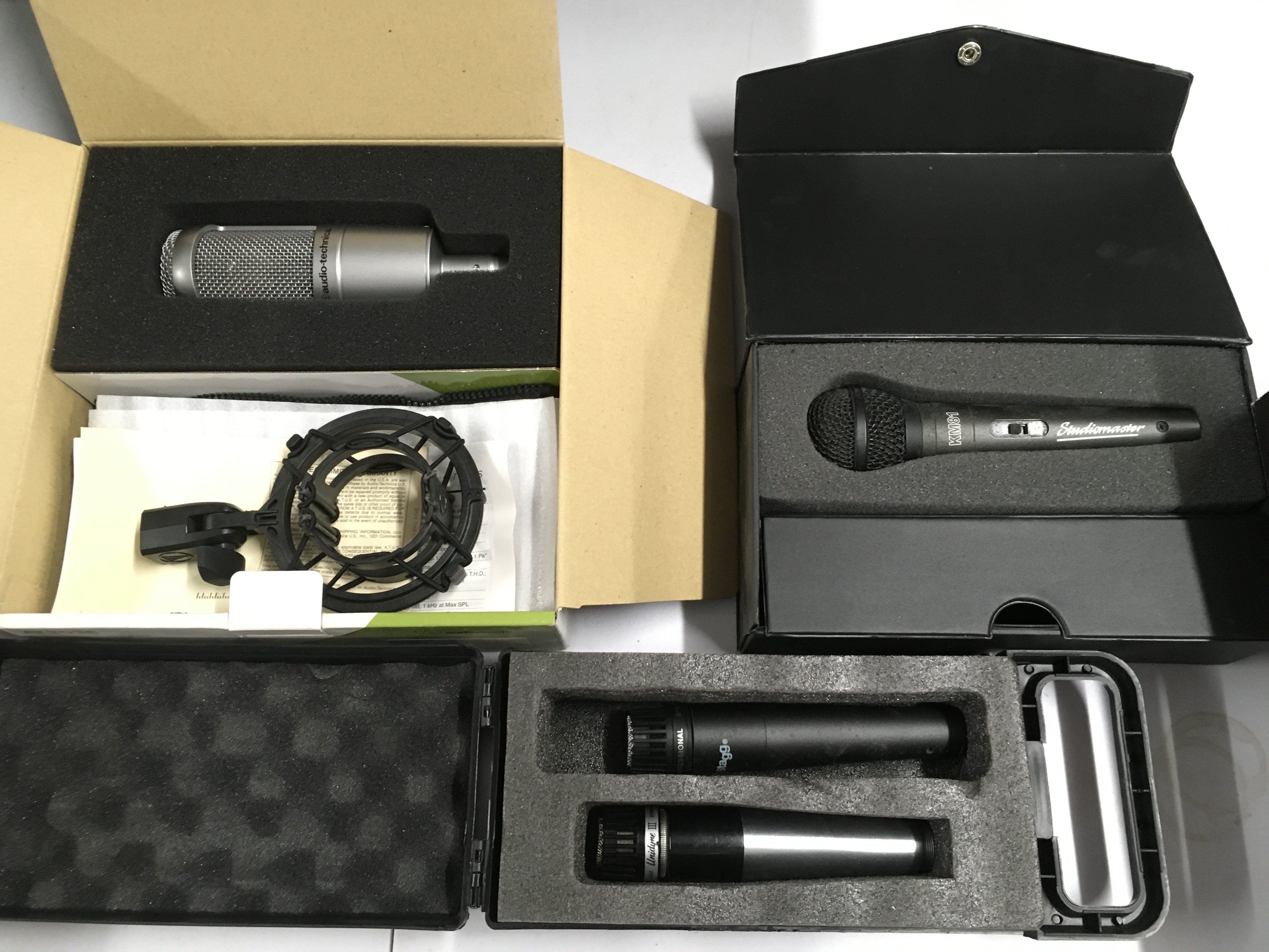 Four microphones comprising a boxed Audio Technica AT3035 example and others.