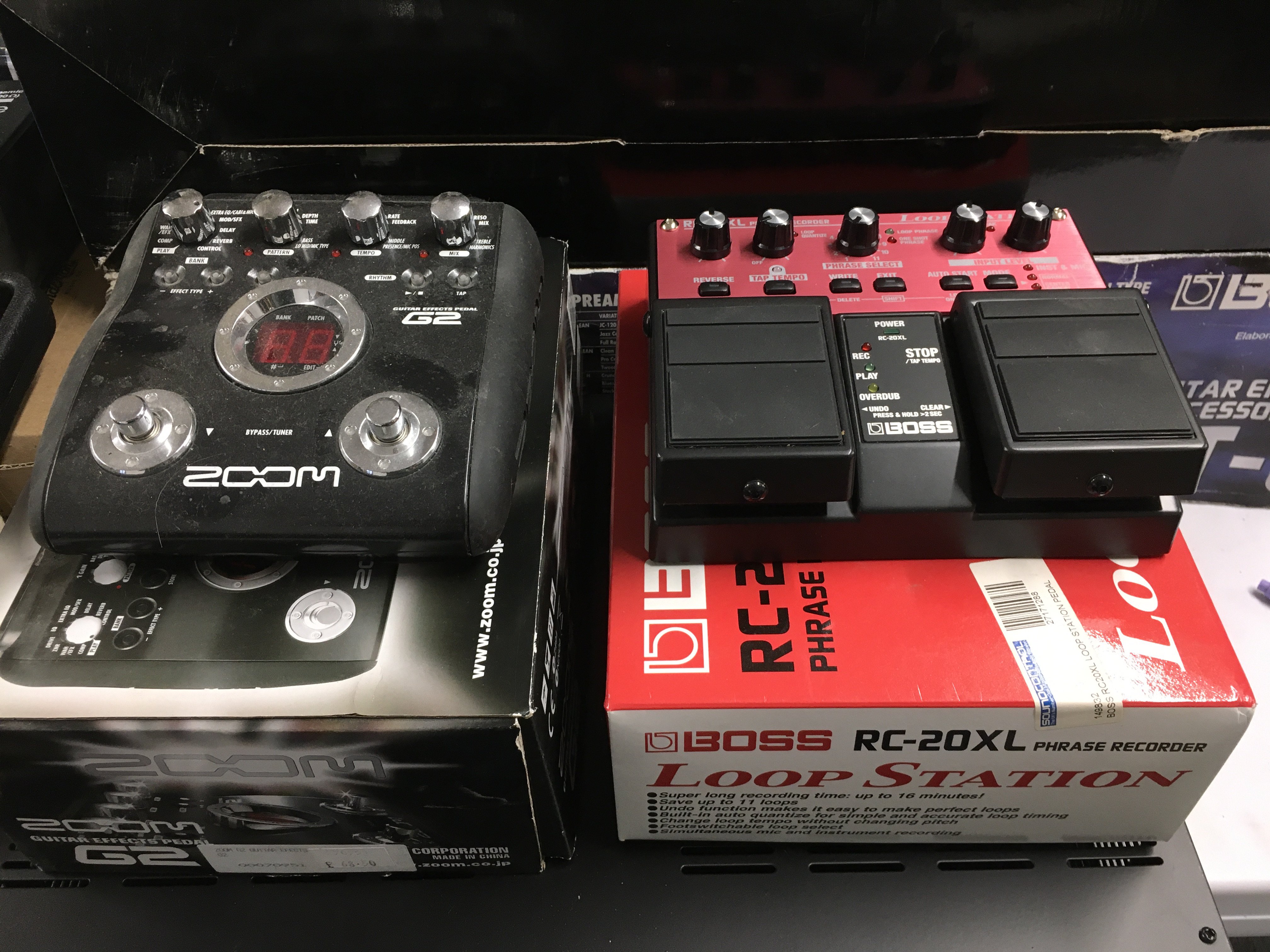 Two boxed effects pedals comprising a Boss RC-20XL phase recorder and a Zoom G2.
