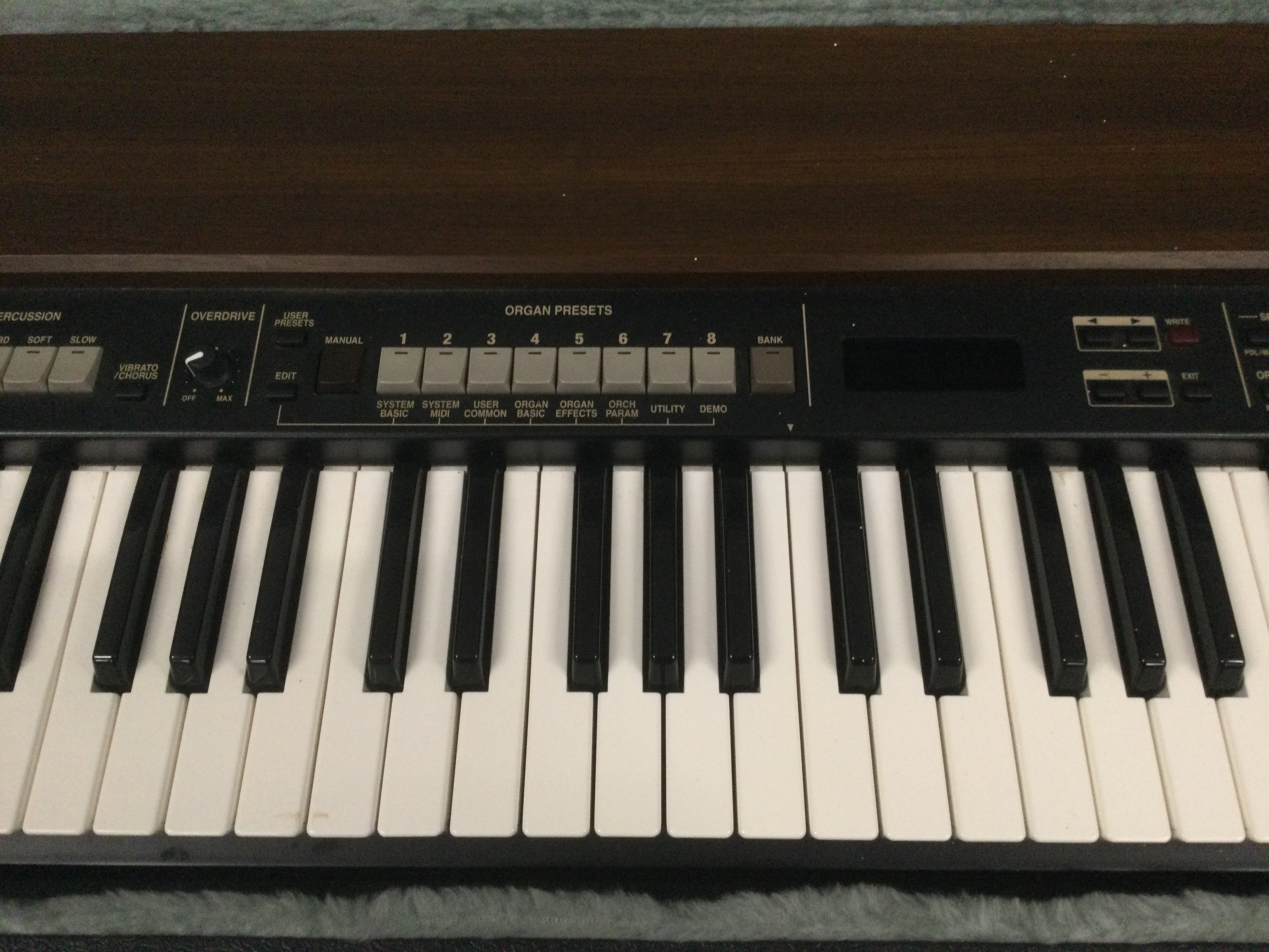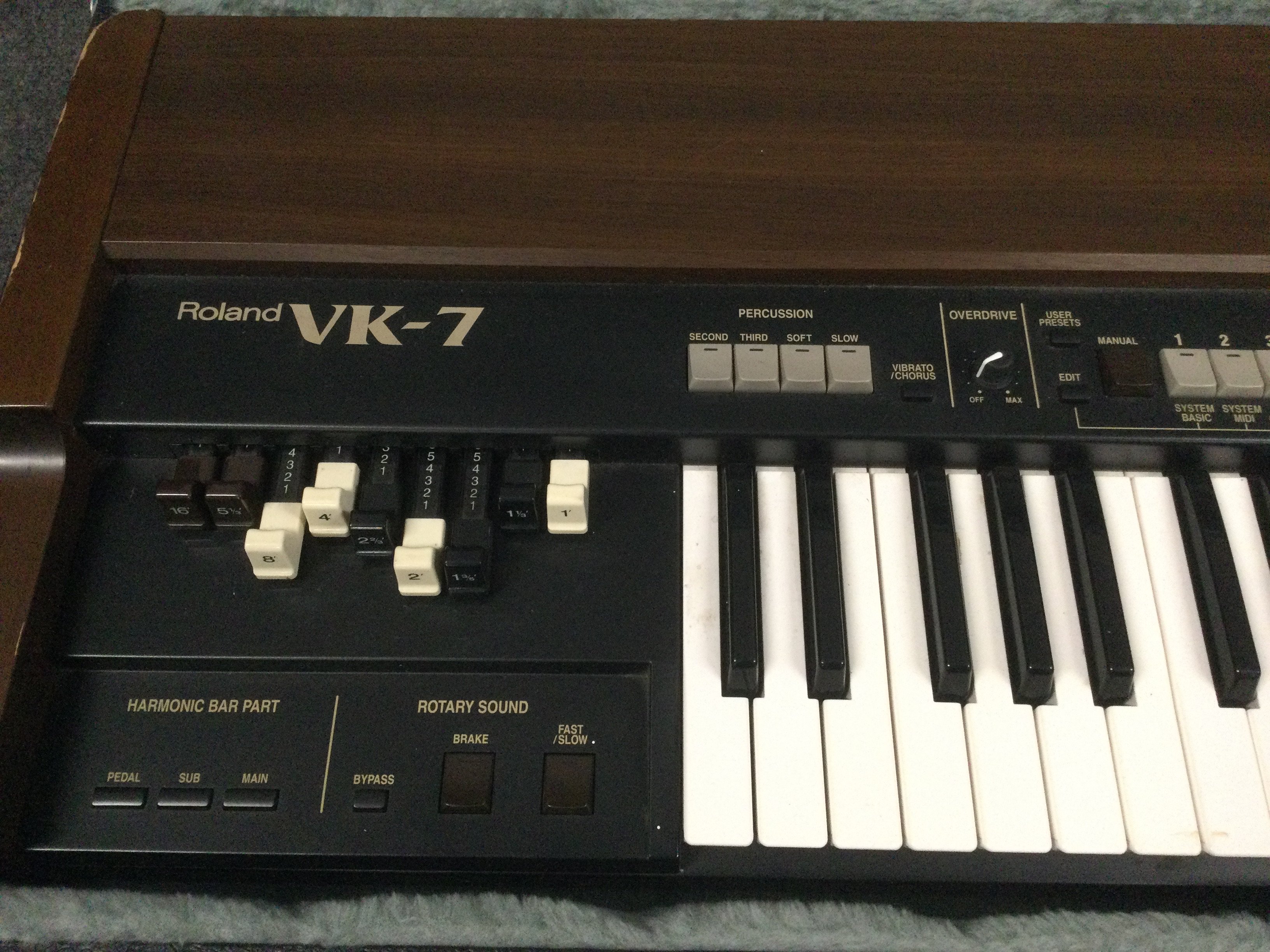 A 1998 Roland VK-7 tonewheel organ with a hard carry case (not original).