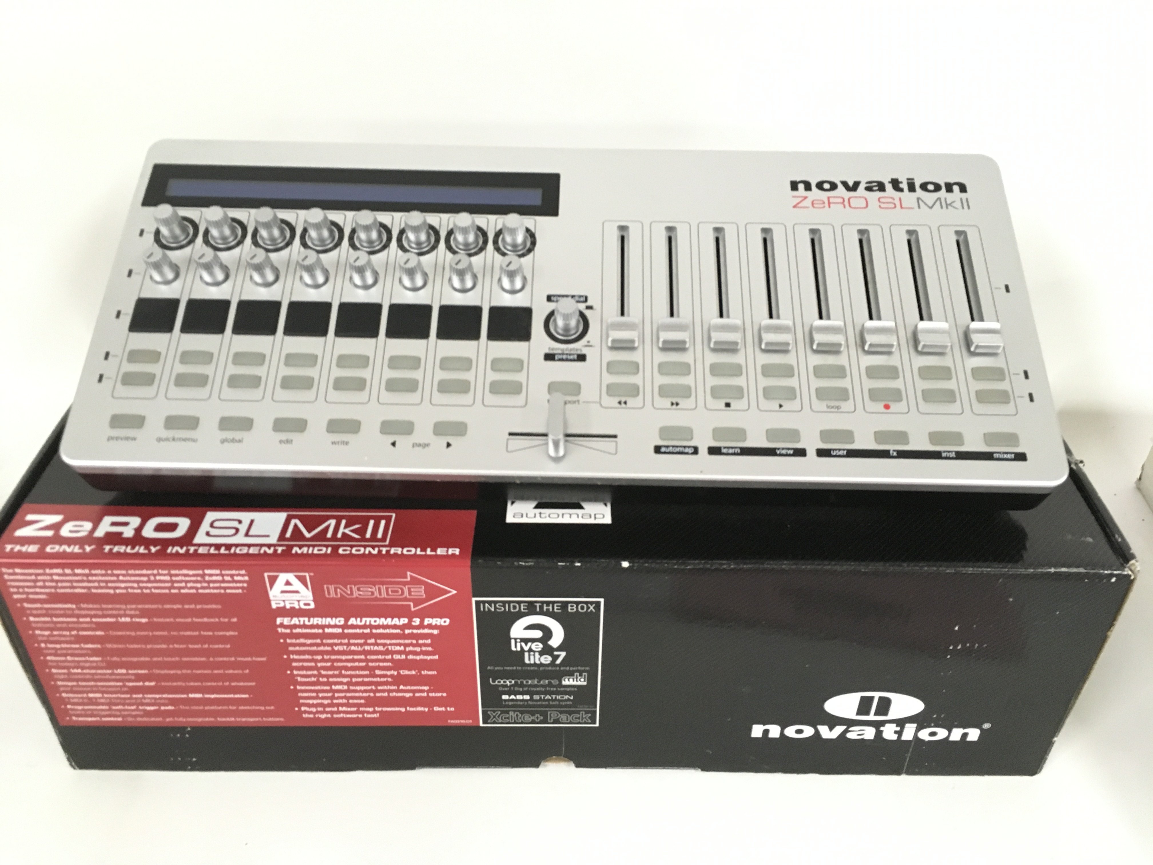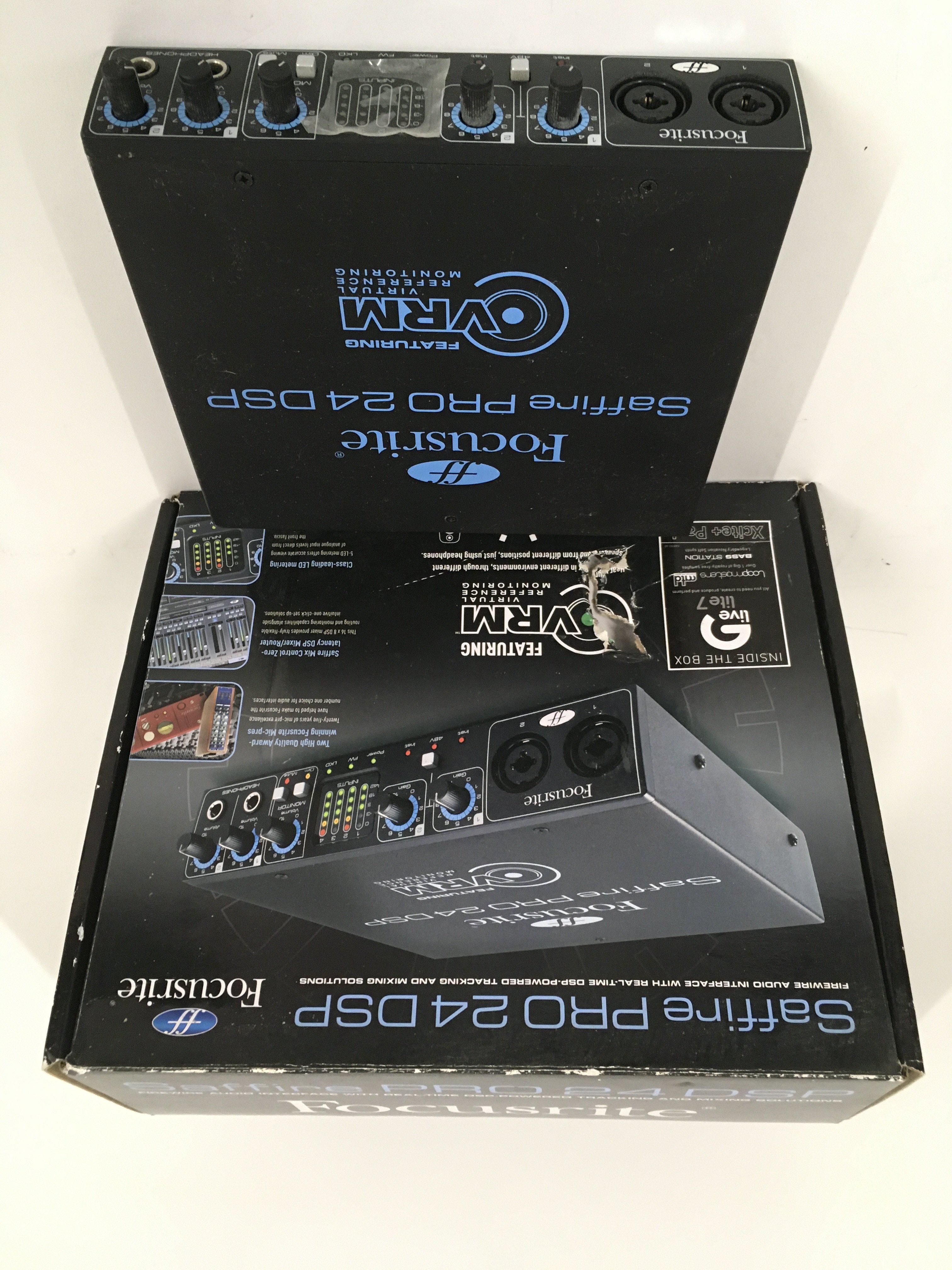 A boxed Novation Zero SL MKII midi controller and a boxed Focusrite Saffire Pro 24 DSP audio interface, a DBX 163X compressor/limiter and a pair of Sennheiser headphones (4).