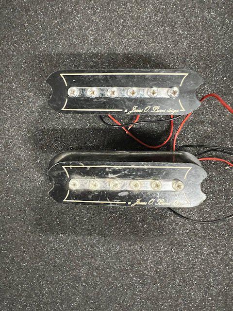 A pair of James O' Burns pickups from the late 1960's. One is intact the other is missing the base and some damage to casing - otherwise fine.